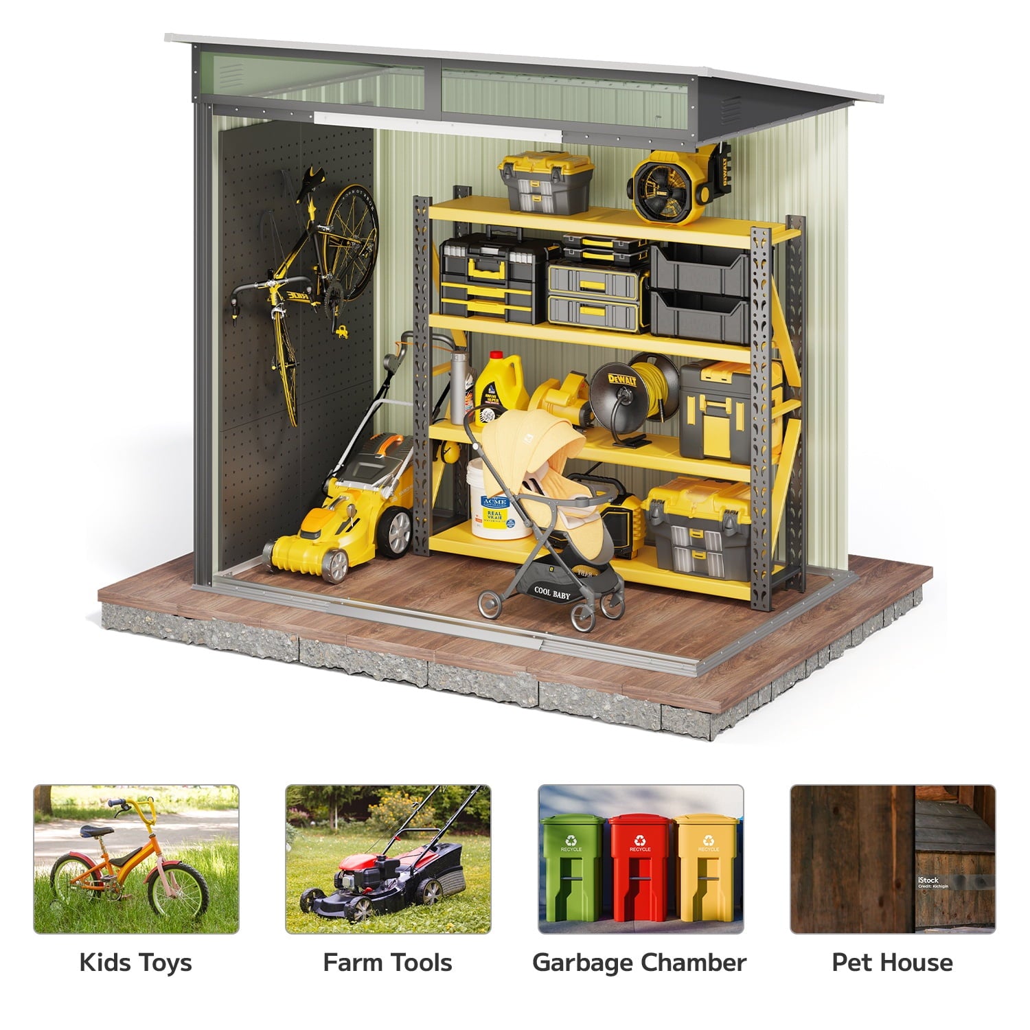 🌼【Sturdy and durable】This metal storage shed is made of thick galvanized steel plates, and the roof is tilted at 45 degrees for easy drainage. It is equipped with anti-UV and waterproof coatings, and the top corner protection caps reinforce the roof, making it waterproof, rust-proof, and UV-resistant, so it can easily cope with various harsh weather conditions.
