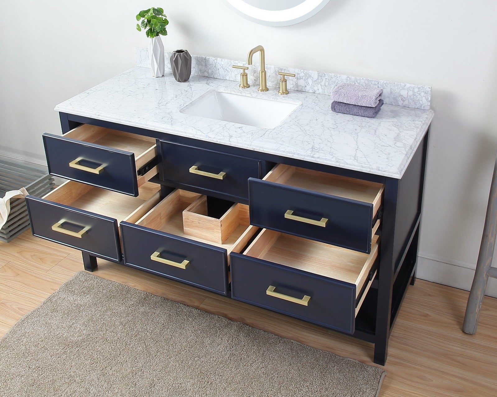 - Full extension metal sliders on drawers
