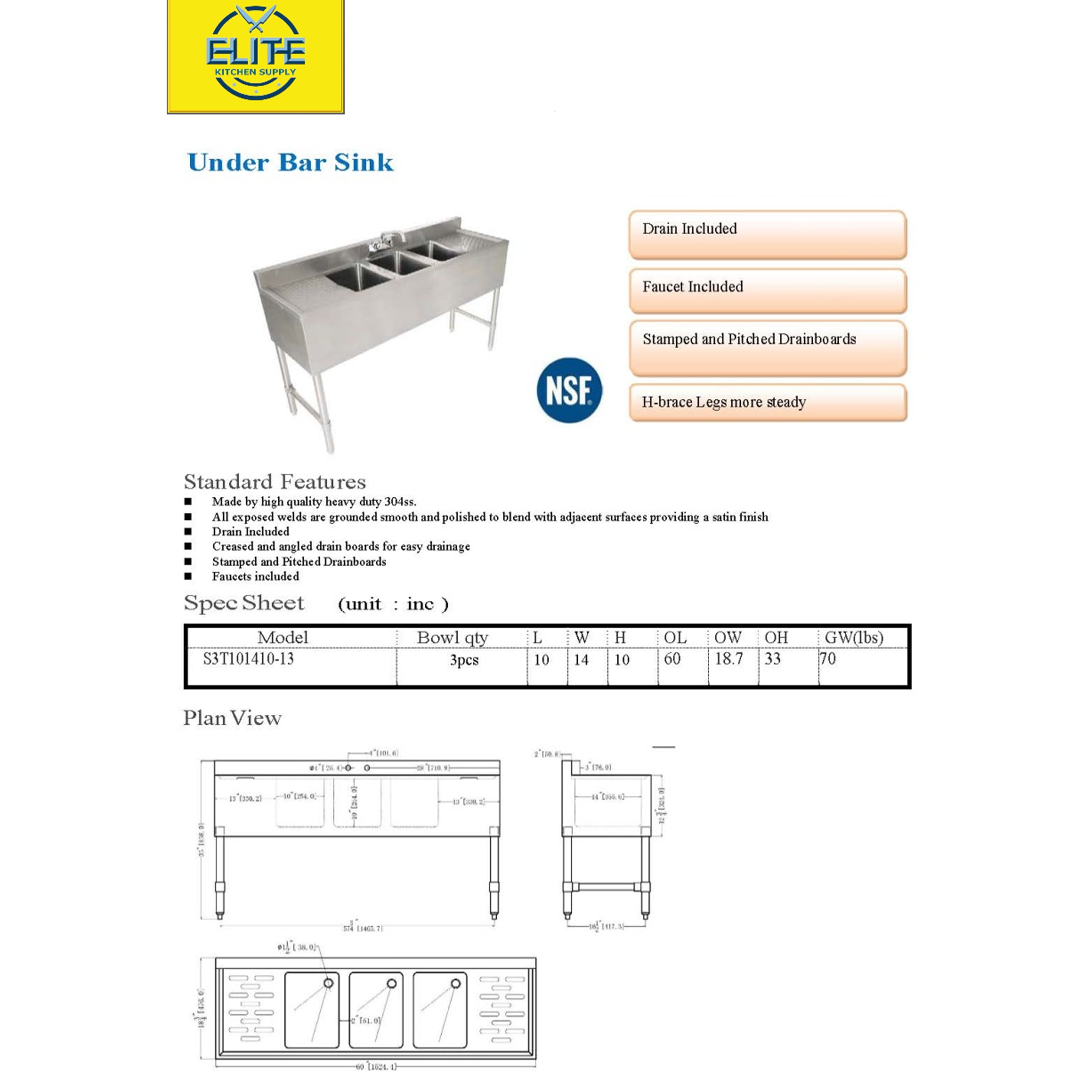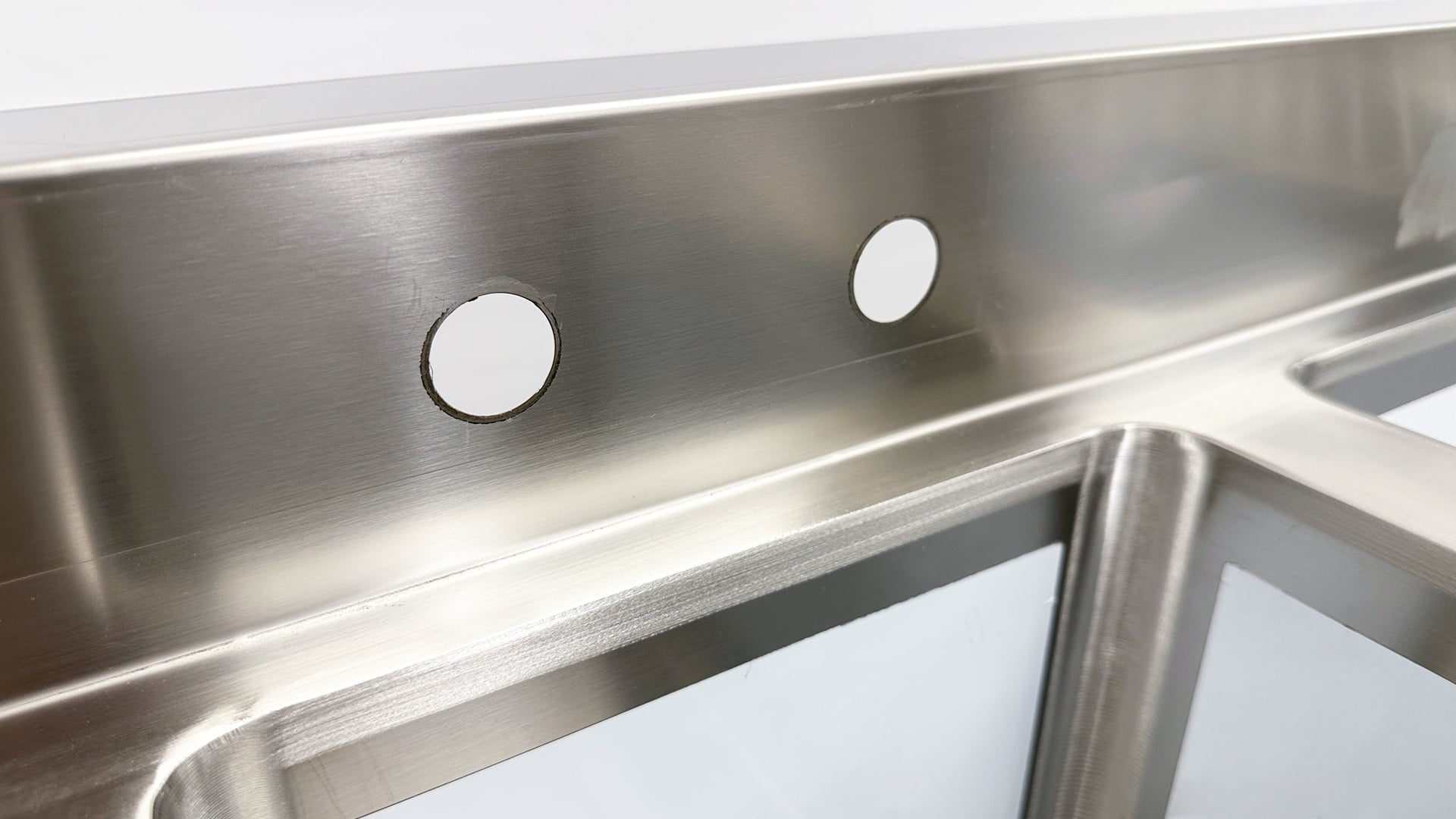 All exposed welds are grounded smooth and polished to blend with adjacent surfaces providing a satin finish Drain includedCreased and angled drain boards for easy drainageStamped and pitched DrainboardsFaucets includedDrain included -