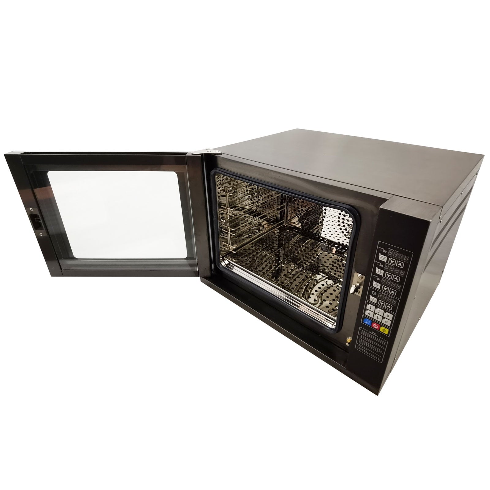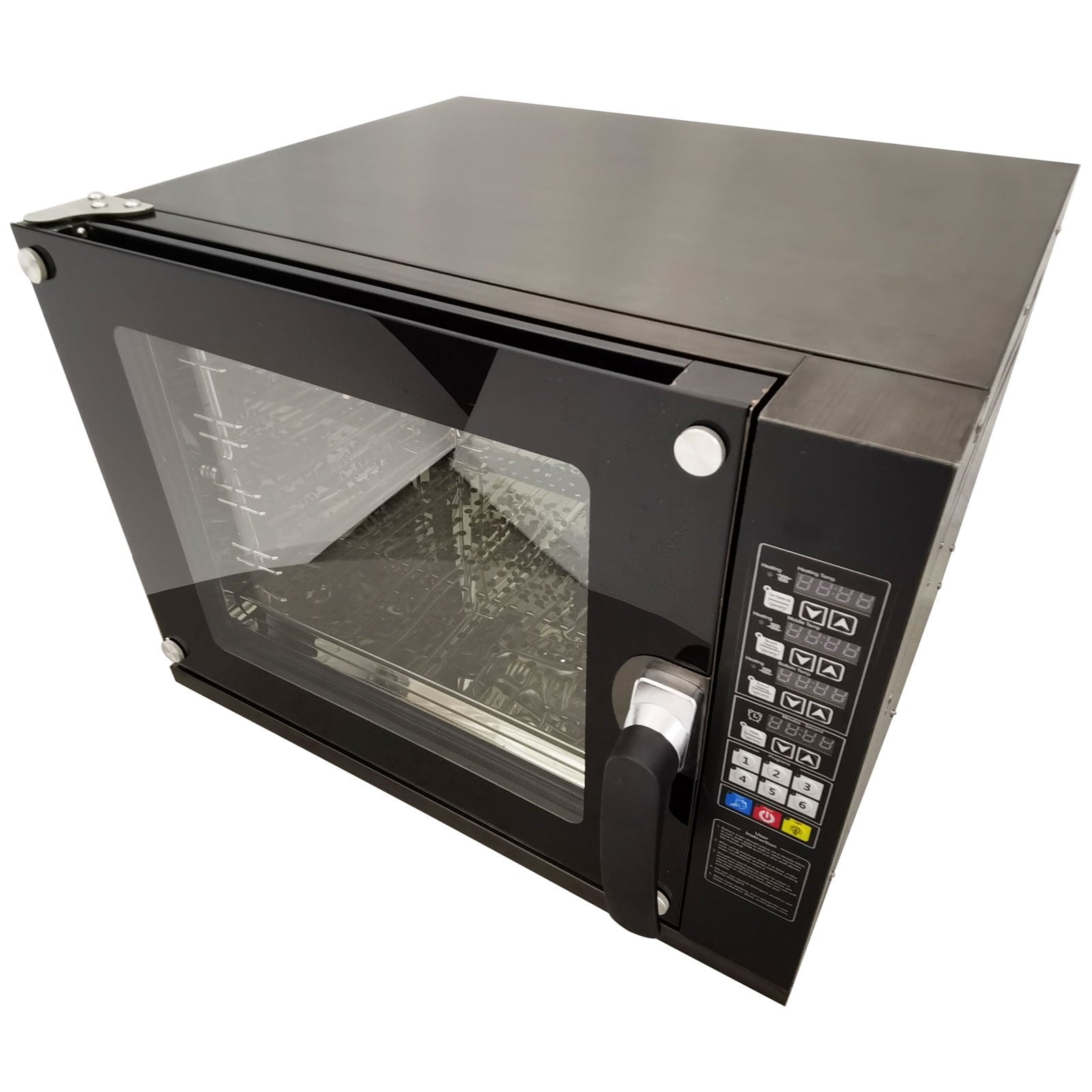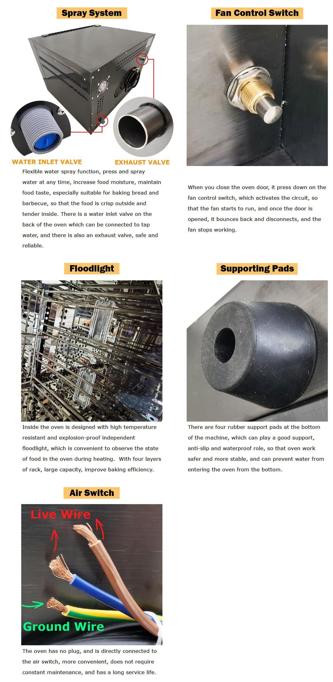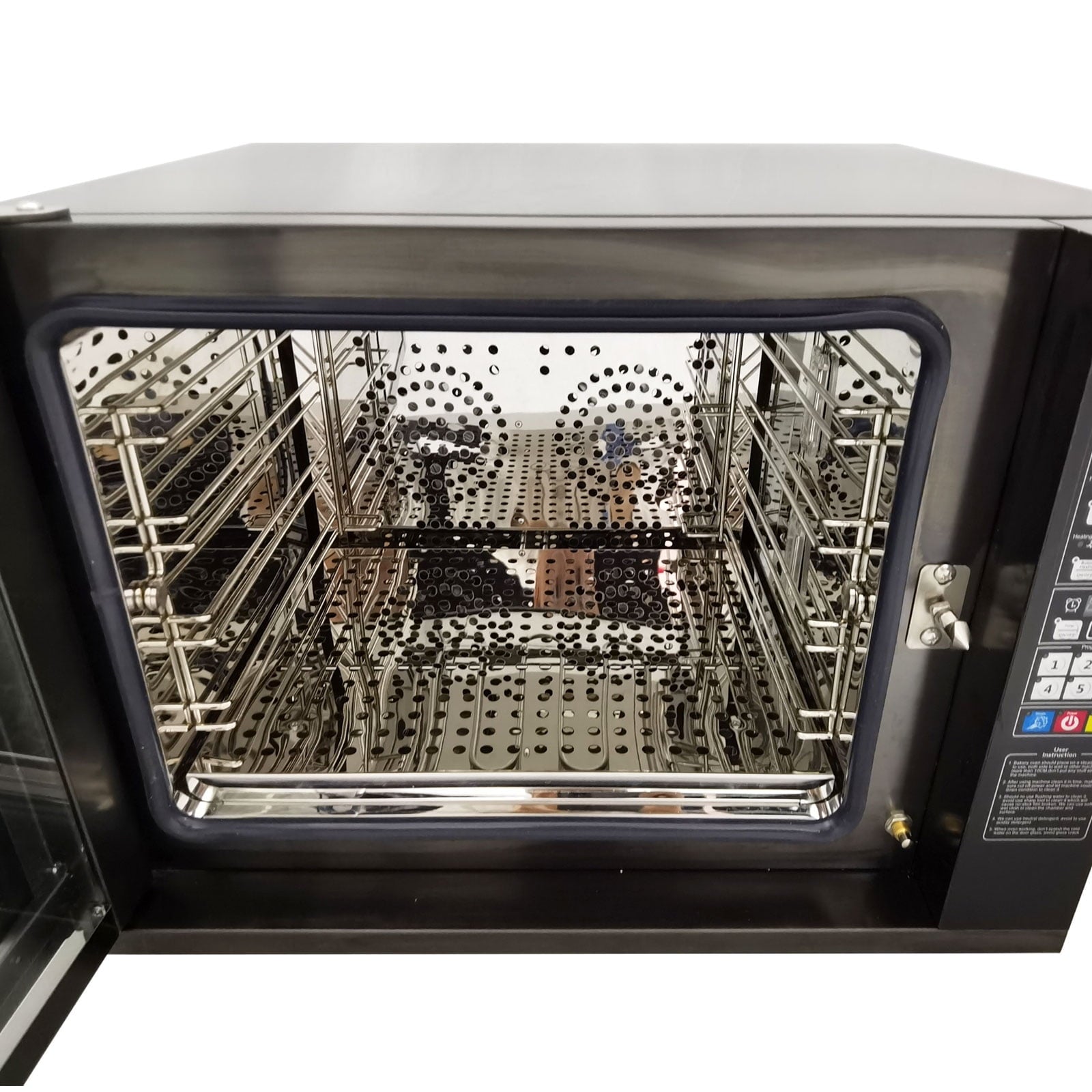 This oven can bake four 15.75″ pizza at a time, it has the characteristics of beautiful appearance, multi-functions, small size, low energy consumption, large output, uniform baking and so on. Ideal for restaurants, family, bakeries, snack bars, and gathering to cook pizza, cookies, bread, cake, all kinds of meat, etc. Water spray function, increase food moisture, maintain food taste. The upper, middle and lower layers can independently control the temperature, double fan hot air circulation, maximum temperature up to 350℃, the heating speed is fast, uniform heating; Stainless steel body, easy to clean, lighter weight. It is an excellent choice for you. Take it home right now!