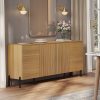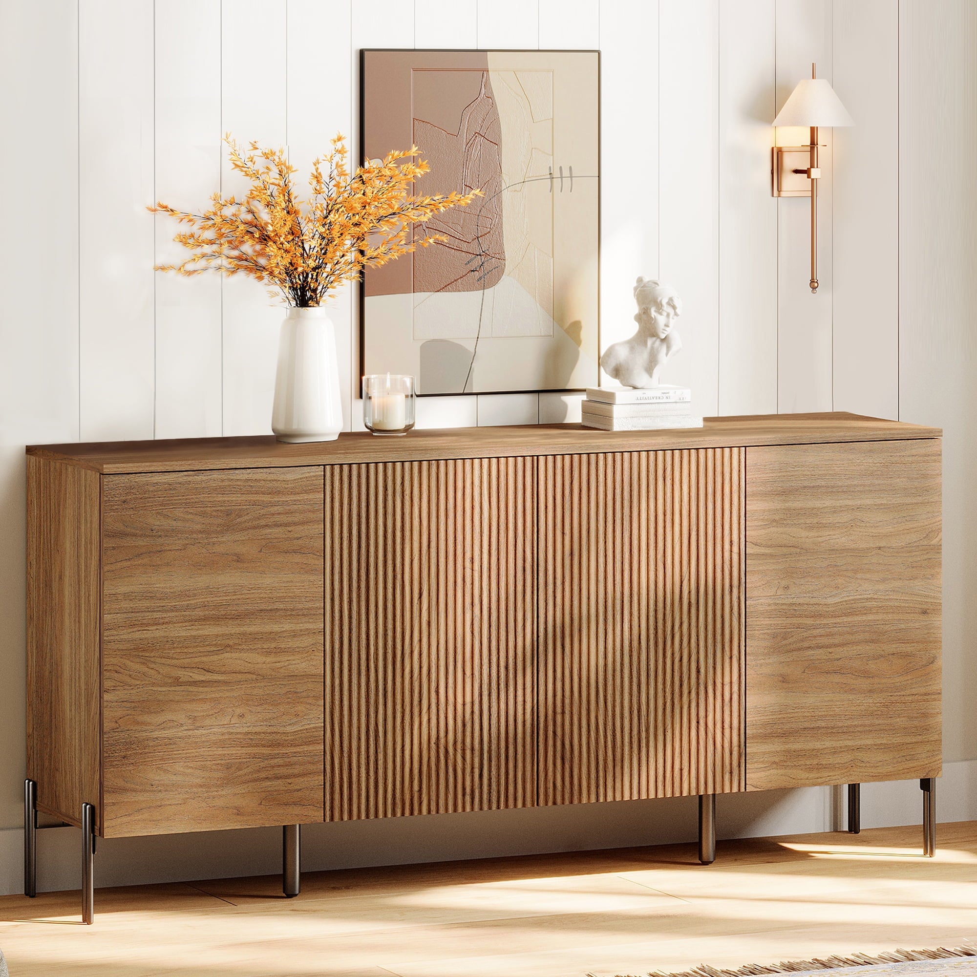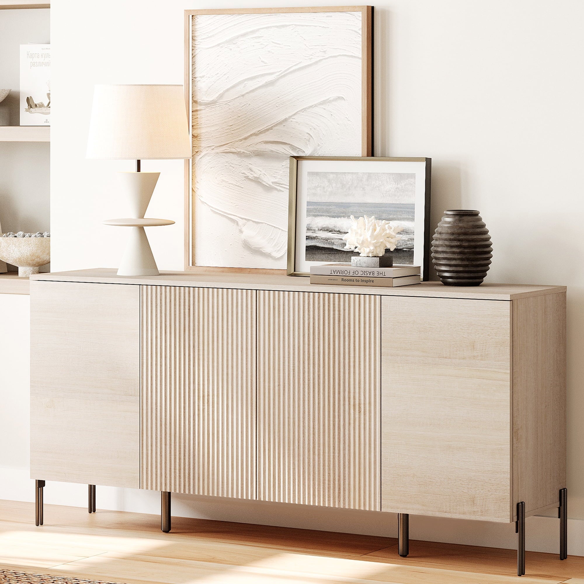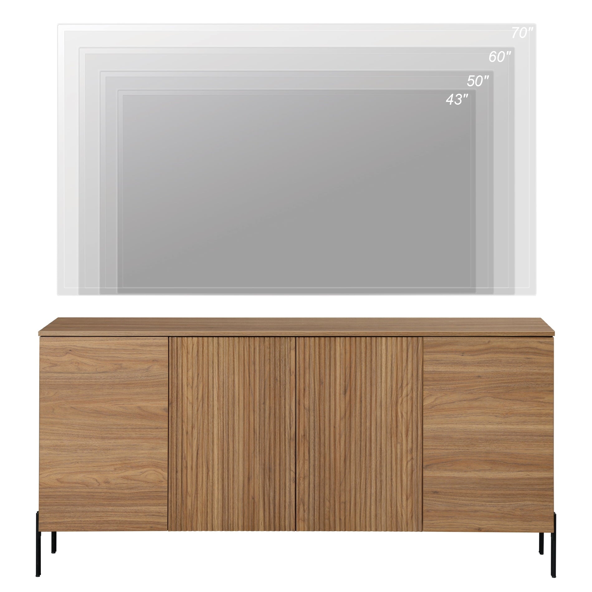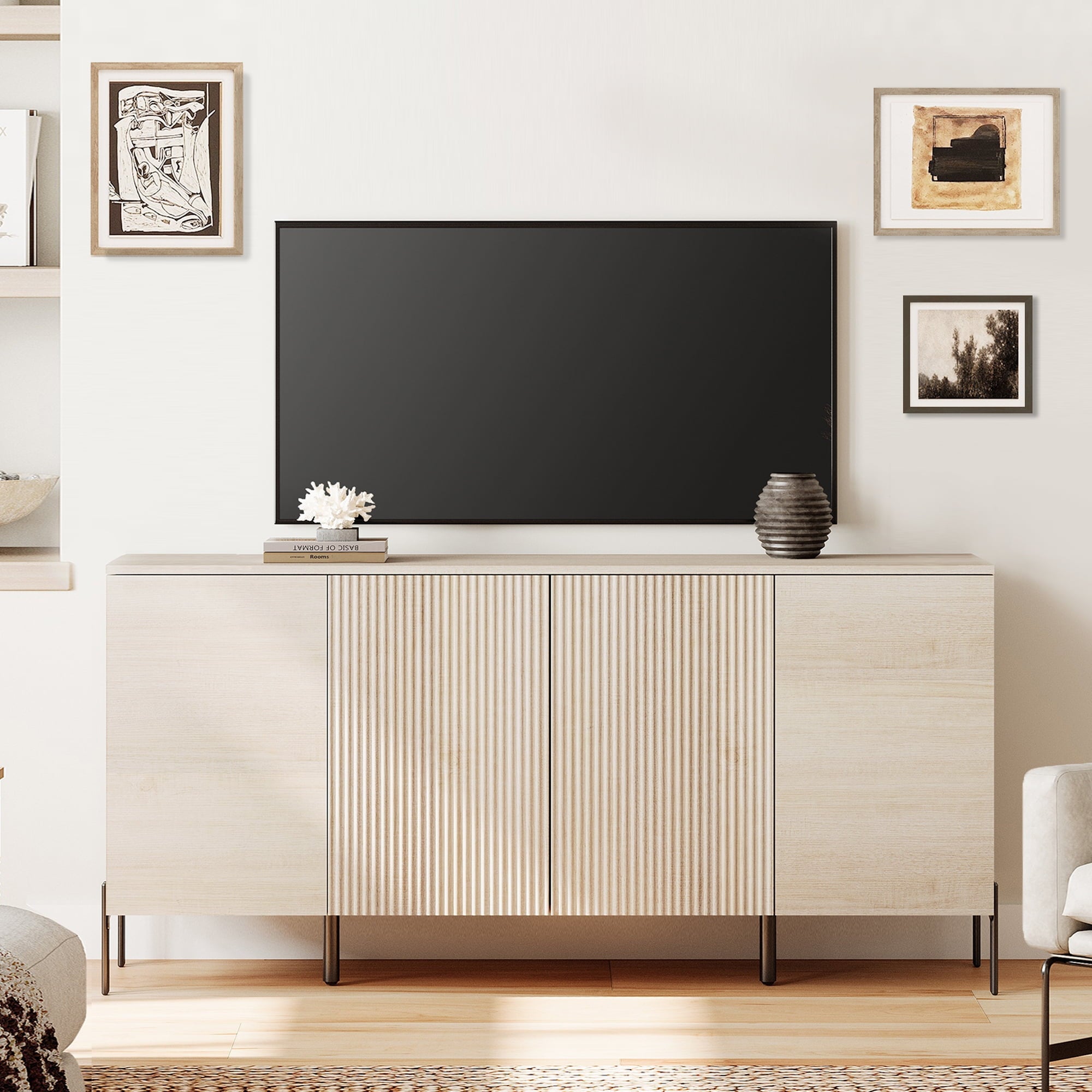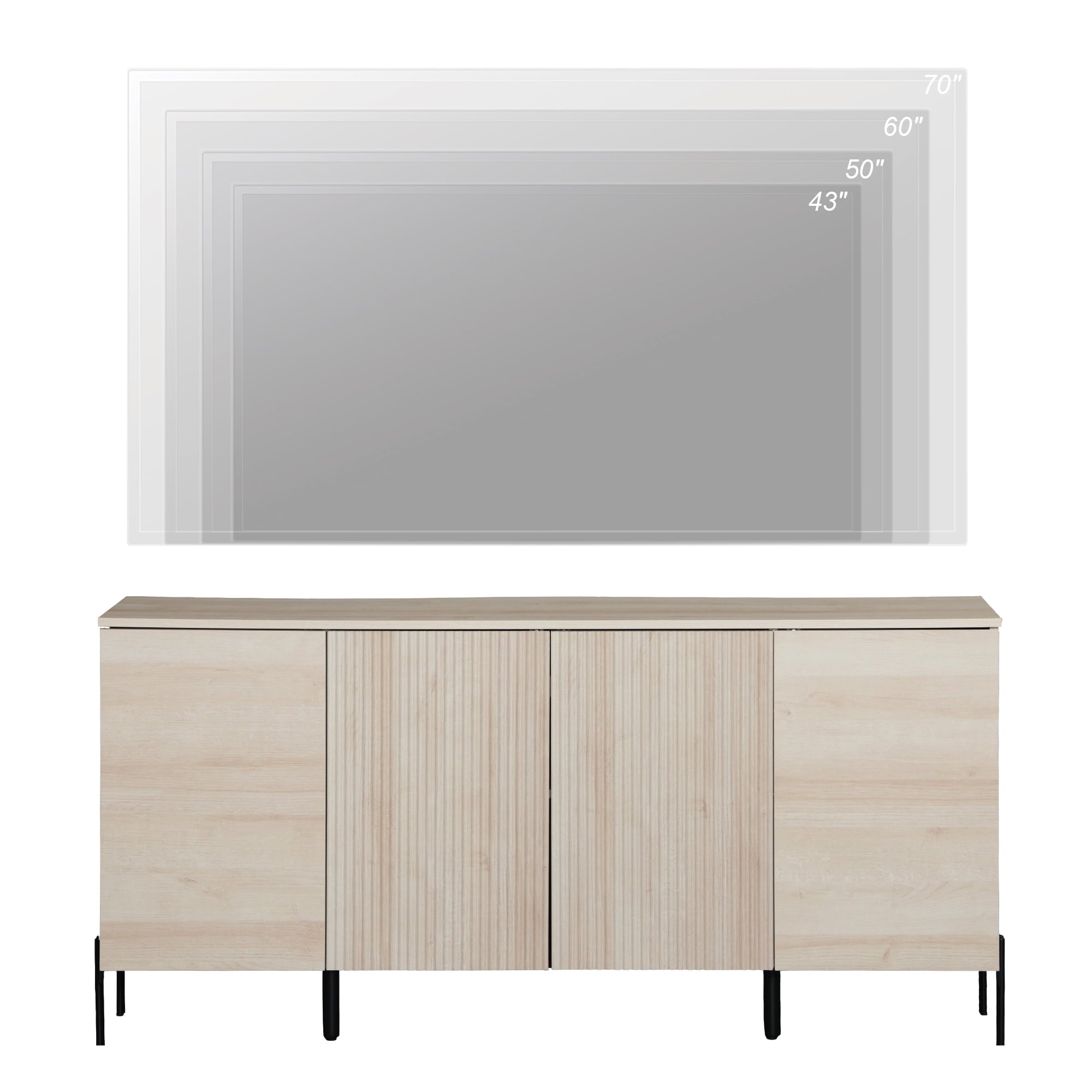 Contemporary meets charm. This 61″ TV stand is crafted from engineered wood and features a clean-lined style that rests on a sleek metal base. A contemporary silhouette shows off crisp edges and a subtle reeded texture for a touch of modern style. We love how its neutral finish makes it easy to pair with colorful details. Plus, it offers plenty of storage: Four cabinet doors open up to interior shelves that make it easy to tuck away media accessories, cables, or seasonal decorations. Best of all, there’s room up top to display your TV or other media devices. Assembly required.