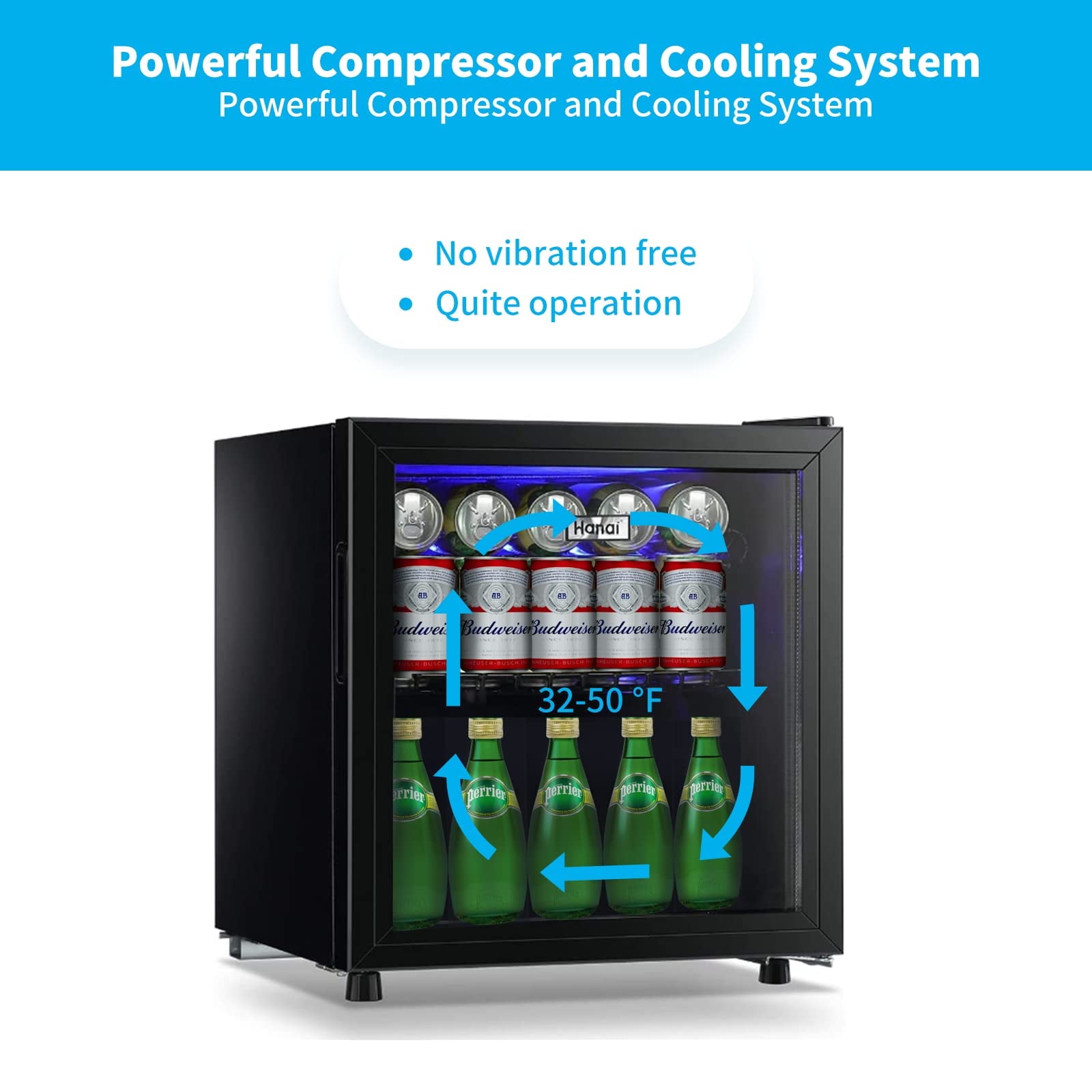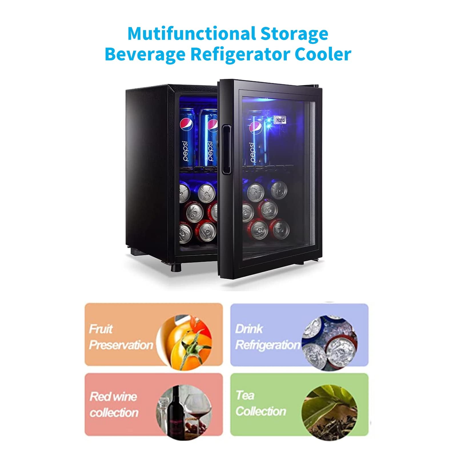 WANAI 1.6 Cu.Ft. Beverage Refrigerator provides plenty of storage for your favorite snacks and drinks, so you can enjoy your snacks at any time in the dorm or in the office. The glass door keep the beverage cool with air tight seal. In addition, it offers an outstanding look and easy access to beer, soft drinks, wine and other beverages. Precise electronic temperature control allows you to easily program and maintain the internal temperature anywhere between 32 ° F-50 ° F. The removable shelves help you install cans or bottles of all sizes and shapes. Blue interior light illuminates for easy, nighttime selection of your favorite chilled drink.