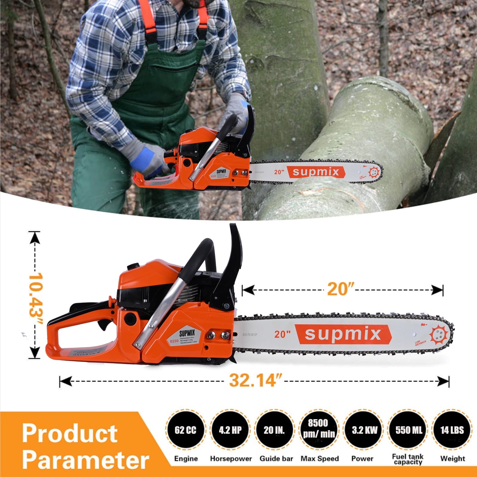 • Powerful 62cc 2-Cycle Gas Chainsaw: Supmix gasoline chain saws are powered by a 62cc power full crank 2-stroke cycle engine for more power and less vibration, providing plenty of power for demanding cutting tasks