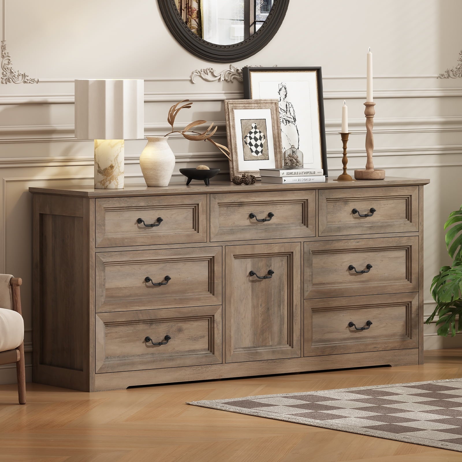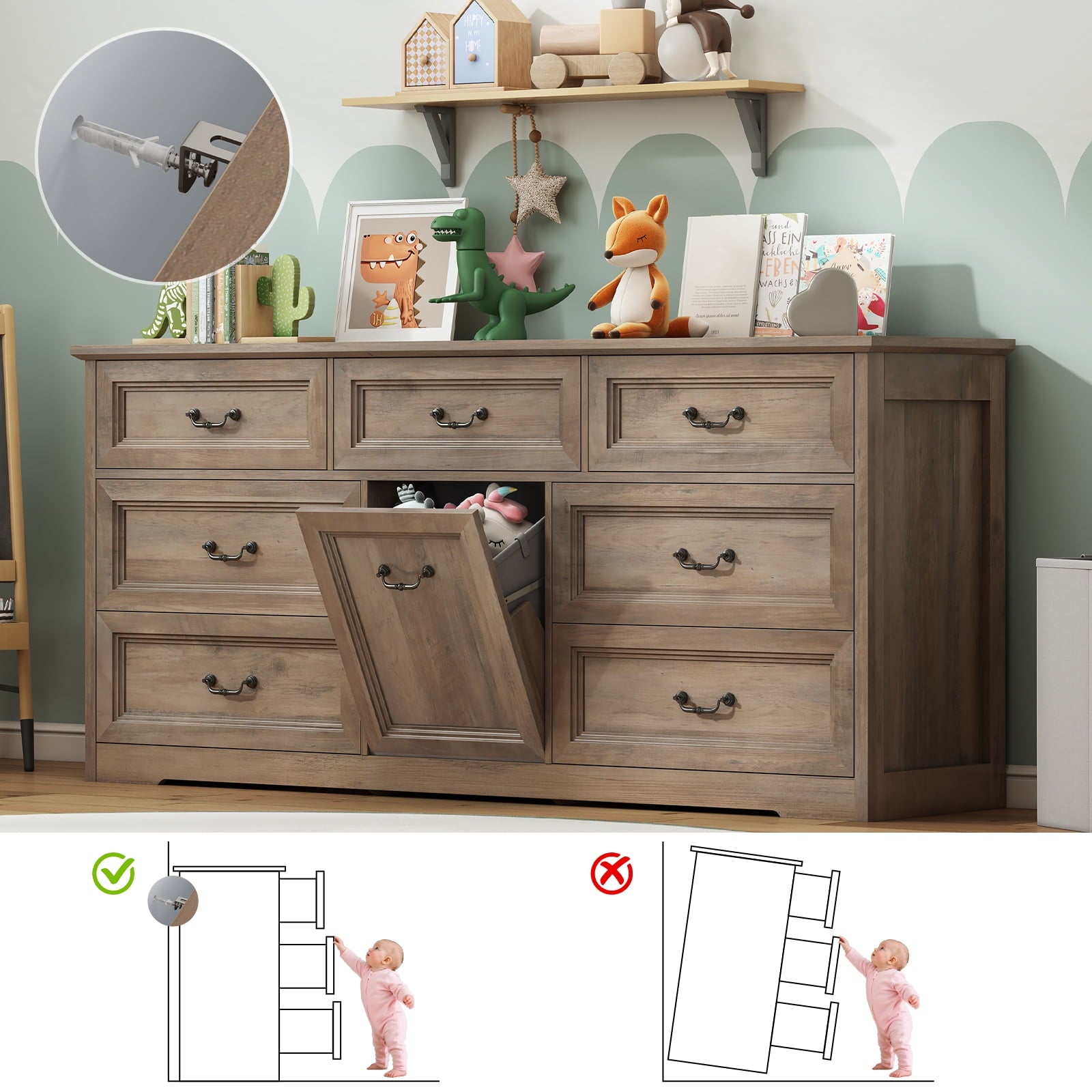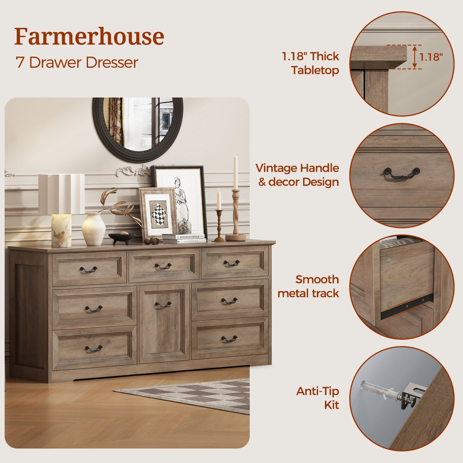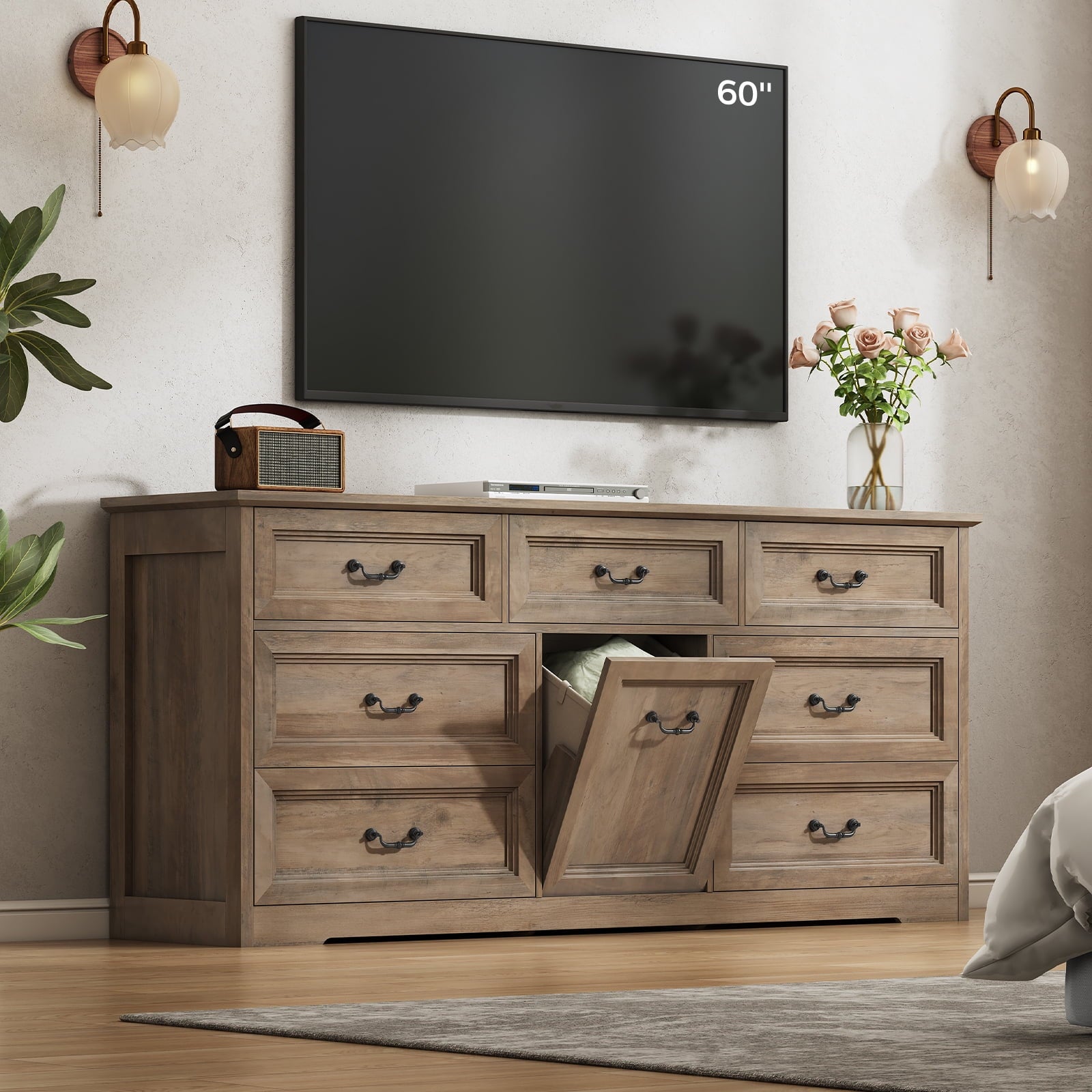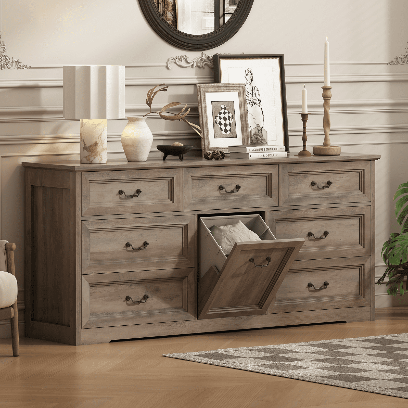 Home Dressers 63″ Wide Farmhouse 7-Drawer Dresser with 2 Laundry Hamper for Bedroom,Chest of Drawers, Gray Finish, Vintage Black Handles, Living Room Storage Cabinet,Gray