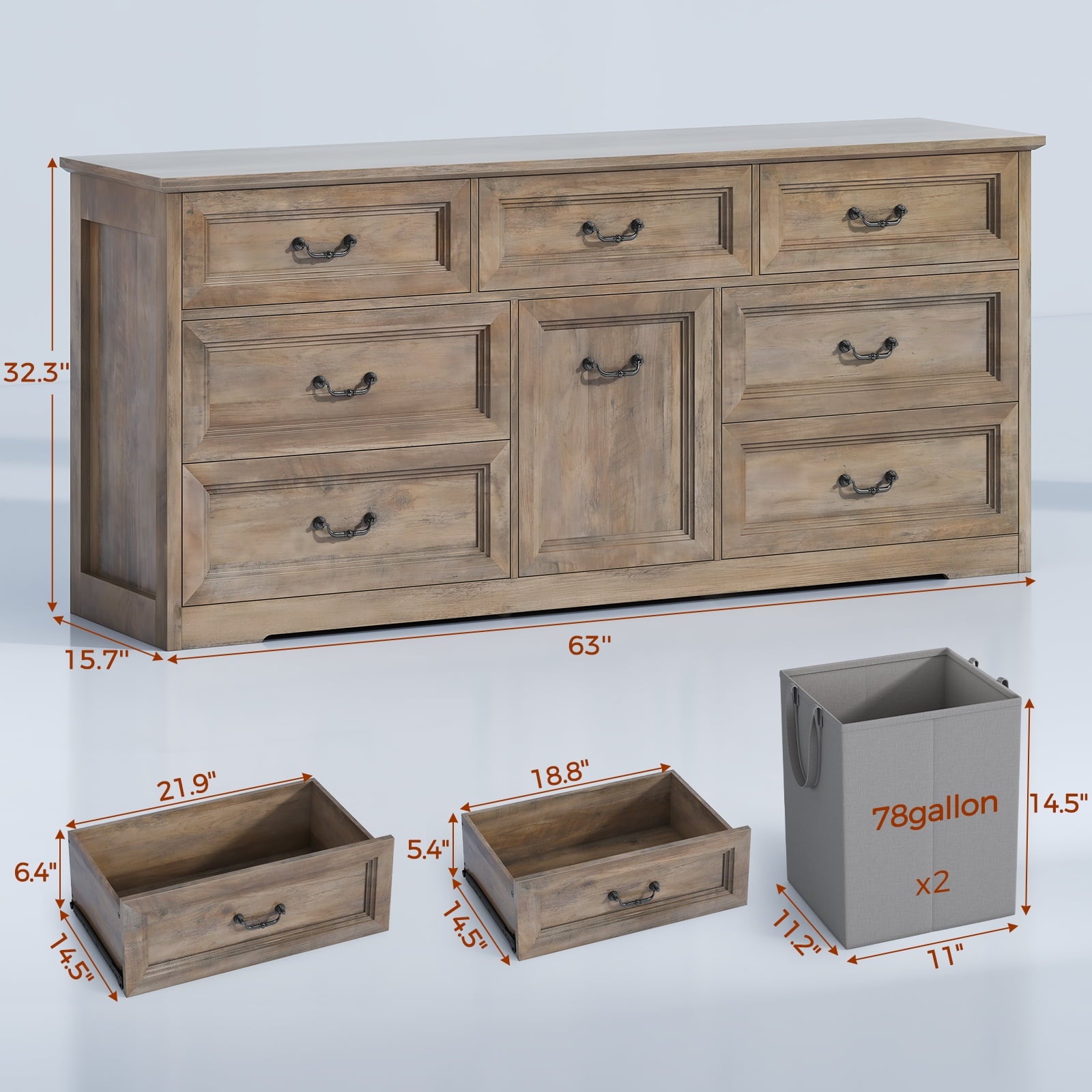 63" Wide Farmhouse 7-Drawer Dresser with 2 Laundry Hamper for Bedroom,Chest of Drawers, Gray Finish, Vintage Black Handles, Living Room Storage Cabinet,Gray