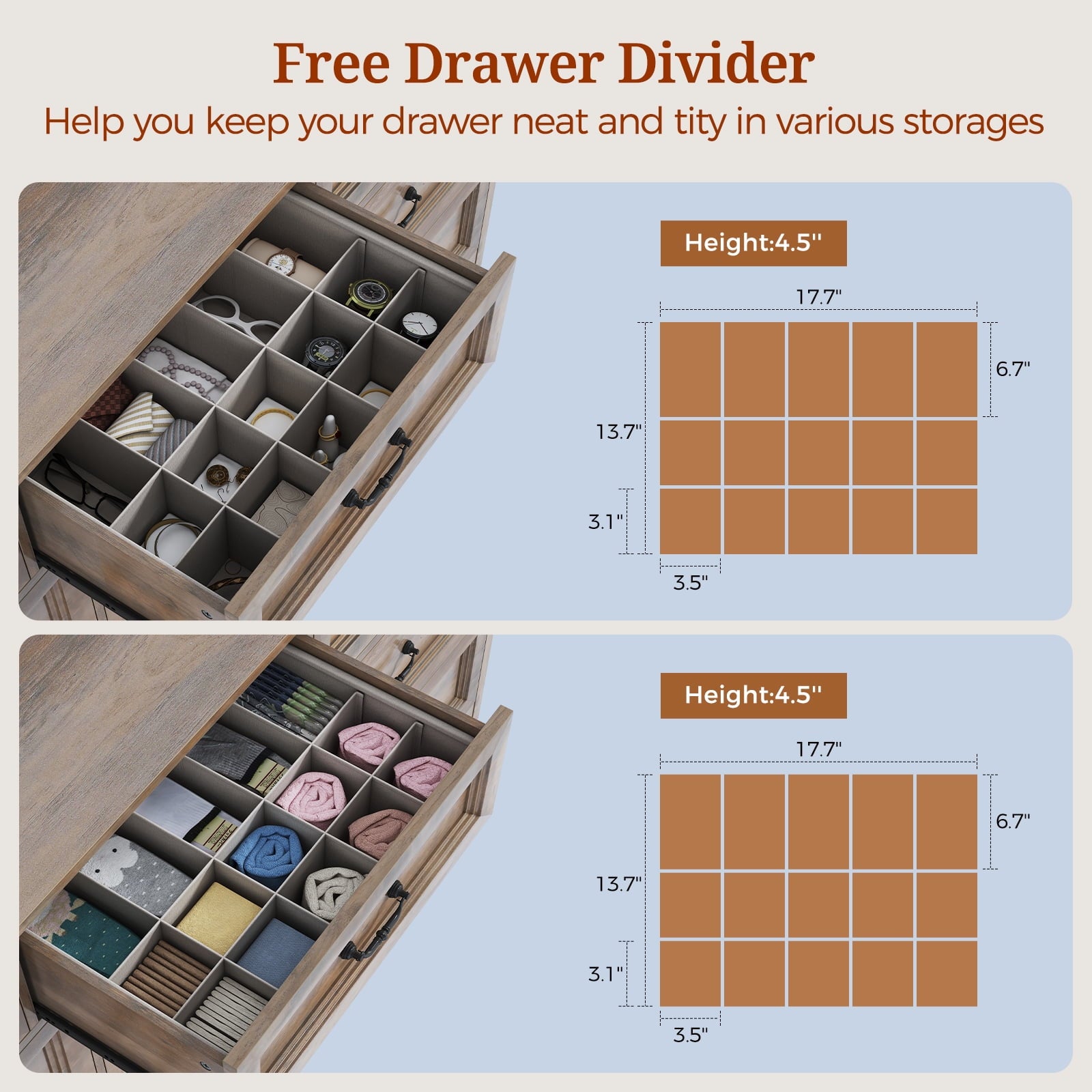 • ‌Impressive Tabletop: Experience the robust craftsmanship of a 63″ wide chest of drawers featuring a sturdy 1.18-inch thickened tabletop, with a remarkable 220lbs capacity and a waterproof surface that makes cleaning effortlessly simple.