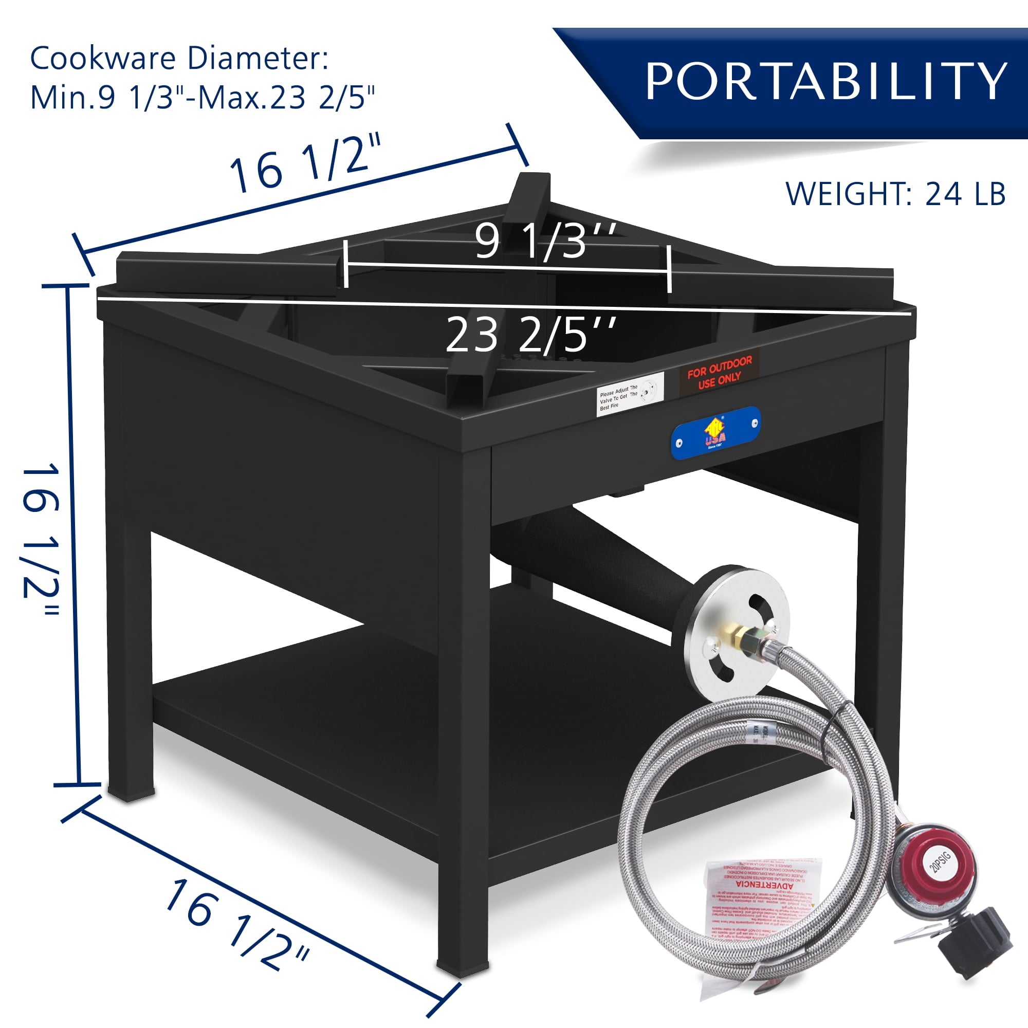 - HEAVY DUTY- 4242s heavy-duty outdoor propane burner for large pot (30-100qt) is constructed with an all-welded metal frame. With compact size 16.5″L*16.5″W*16.5″ H. UNIQUE VENTILATION DESIGN- Special ventilation design allows the burner to burn completely for a clean blue flame, improving cooking efficiency.