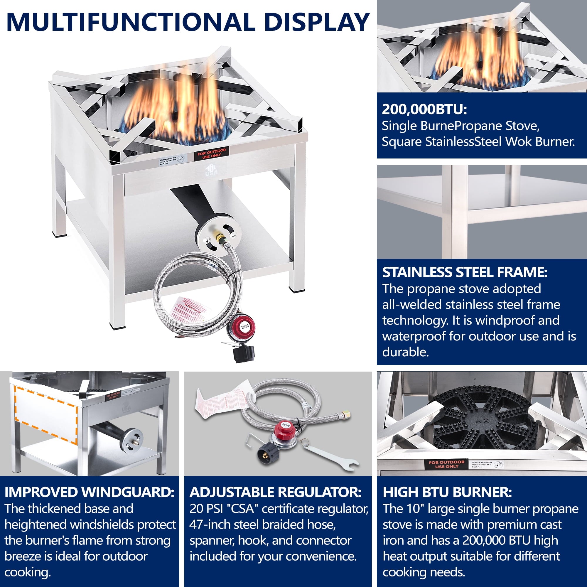 200,000BTU High-Output: 10″ Large Cast Iron Burner great for boiling and frying.Suitable for different cooking needs