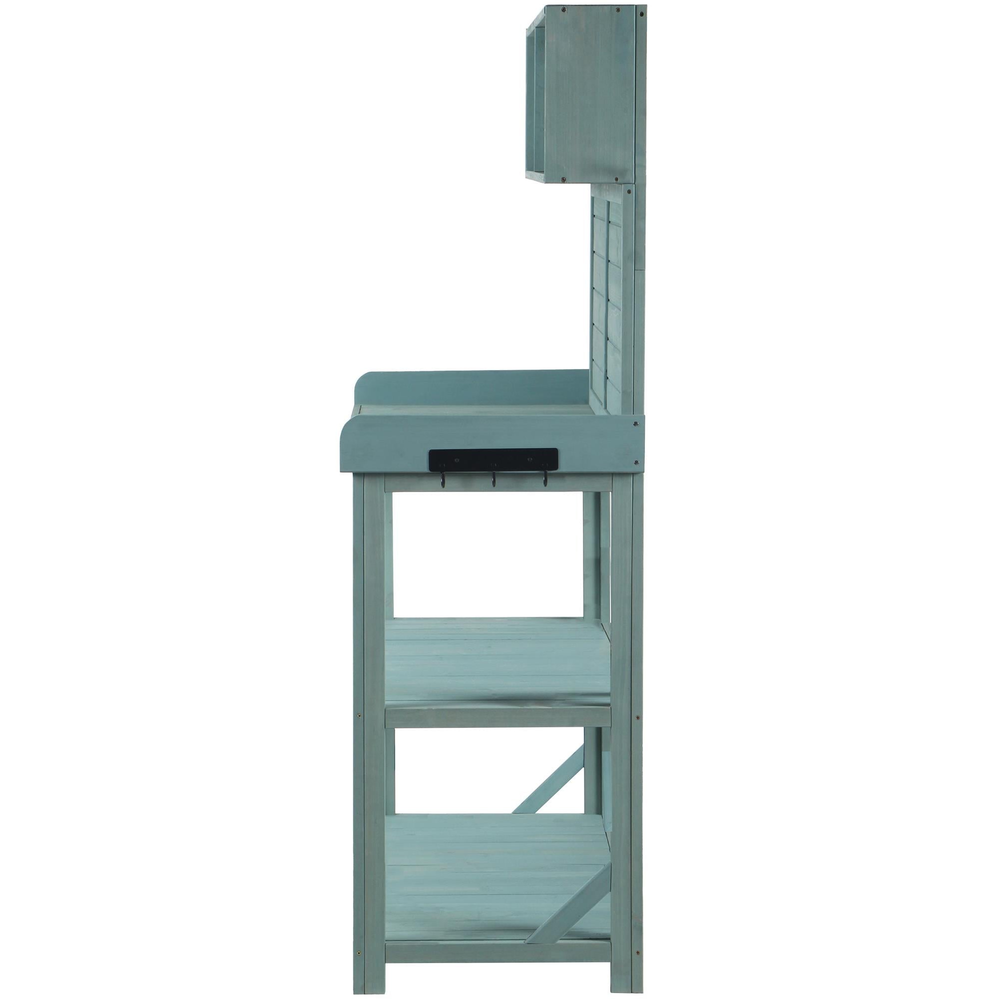 65″ Large Wooden Farmhouse Rustic Outdoor Potting Bench Table, Patio Workstation, Garden Potting Bench with 4 Storage Shelves and Side Hook,Green