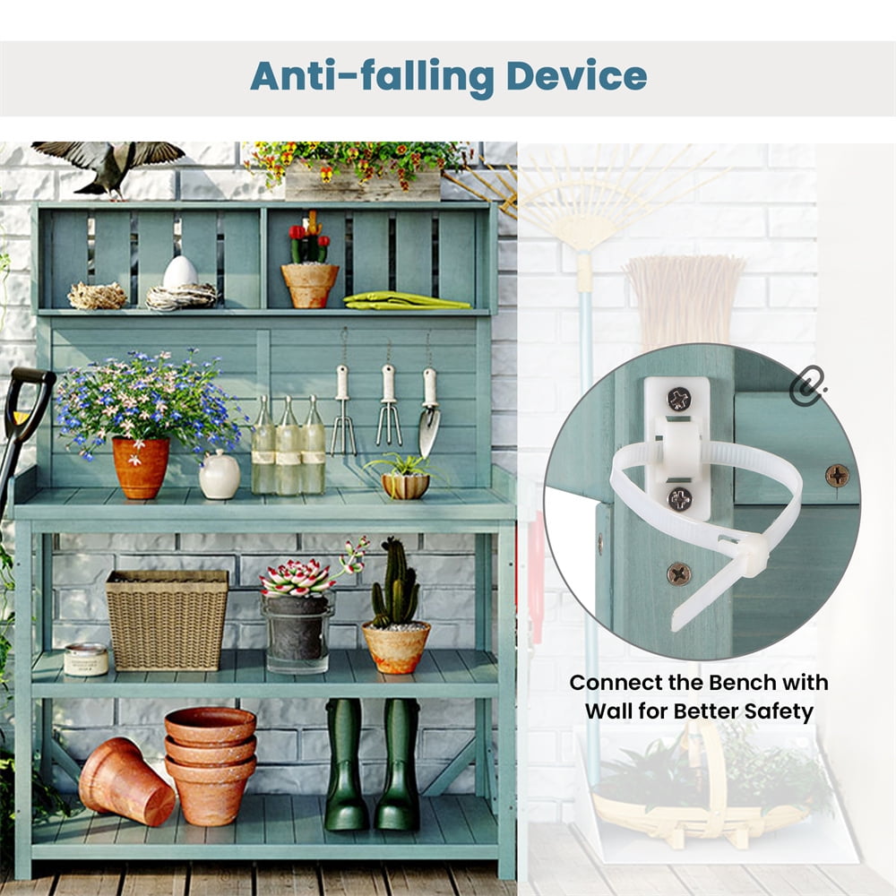 - [Anti-Falling Safety Device] There is not always flat in the garden. For your safety in setting the potting bench, it is designed with an anti-falling device. Just connect the device with wall for better safety. To strength stability, 4 supportive bars are offered to fixed in the lower shelves. They can be fixed in any corner until the table is stable.