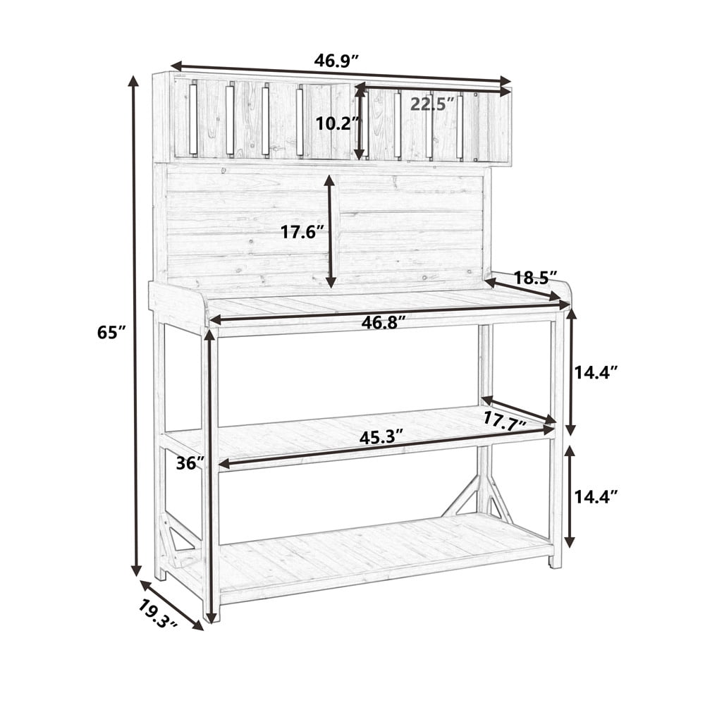 - [Spacious Workstation] Who’s ready for Spring? Get a little bit of inspiration for the coming season from this farmhouse garden potting bench. Made of 100% fir wood, this table is sturdy enough for outdoor using with its 46.8×18.5inch workstation. Compared with other potting bench, its surface is spacious for putting many tools or planters from your loved garden.