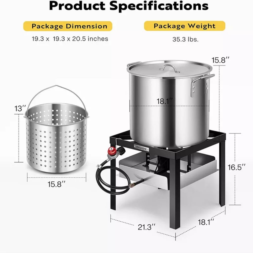65 Qt. Seafood Boil Pot with 45 Qt. Basket and 110,000 BTU Propane Burner Stand for Crawfish Crab Shrimp LobsterAbout the product:High-Quality Material- The seafood boiling pot and basket are made of aluminum, which is lightweight but durable; The cast iron gas burner provides sturdiness for consistent boiling; The no-assembly-required heavy-duty base offers sturdy support for long-term use; The strengthened heat shield boards protect the governor, pipes, and surrounding ground Large Capacity- This seafood boiler can efficiently cook large amounts of food, including vegetables, meat, and seafood; It boasts a capacity of 65 QT (72 L) and a 45 QT(49.5 L) cooking basket, enabling you to cook sizable quantities of food; On average, you can complete a basket of food within 30 minutes; Note: We suggest using this pan for boiling and steaming, not deep frying High-Powered Burner- The gas burner has the capability of producing up to 110,000 BTU of heat, allowing for the rapid boiling of large quantities of seafood; The high-pressure regulator can adjust from 0 to 20 psi, ensuring a safe and secure gas flow; LPG is highly recommended Hang and Drain Design- The aluminum stock pot features a hang-to-drain design that facilitates easy lifting of the basket by draining away the water and oil; The two hooks support the basket for optimal steaming; Just lift the basket to fit well in the slot and rest it in place; You can add ingredients, check whether the food is overcooked, and stir the contents in the pot User Friendly- The outdoor boiling pot features riveted handles that enhance comfort while lifting and transferring, and four rises on the basket’s bottom prevent direct contact with the pot’s floor;ed.