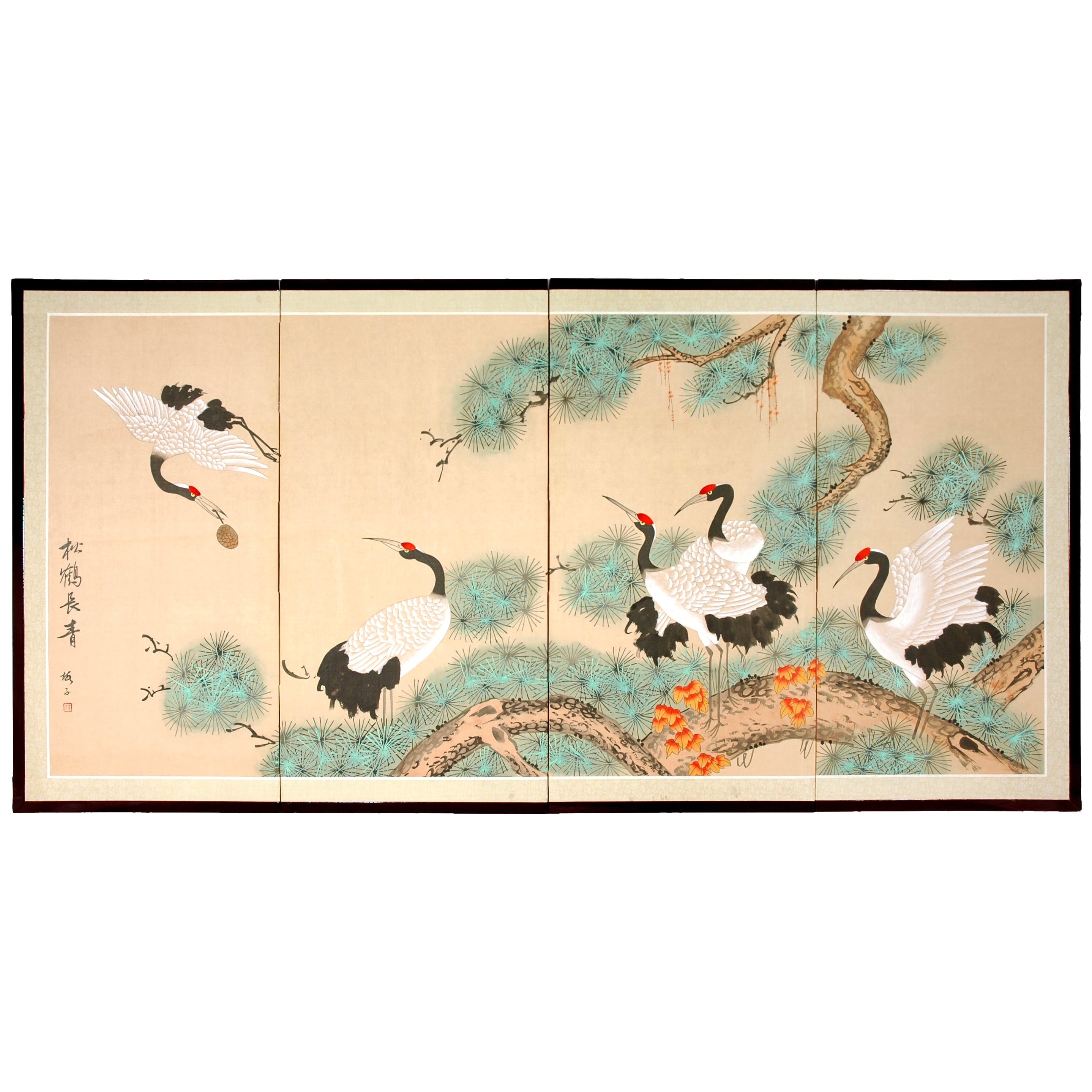 Homeward Bound is a traditional and beautiful motif, with red headed cranes nestled among the long needled pine. Subtle, beautiful hand painted wall art. Note that no two renderings are exactly the same.