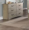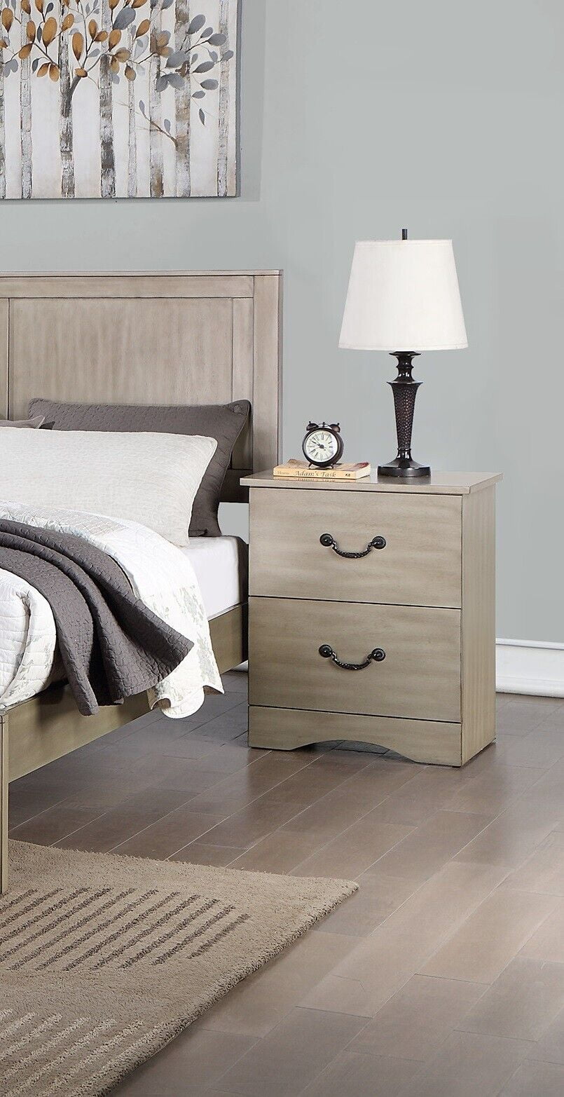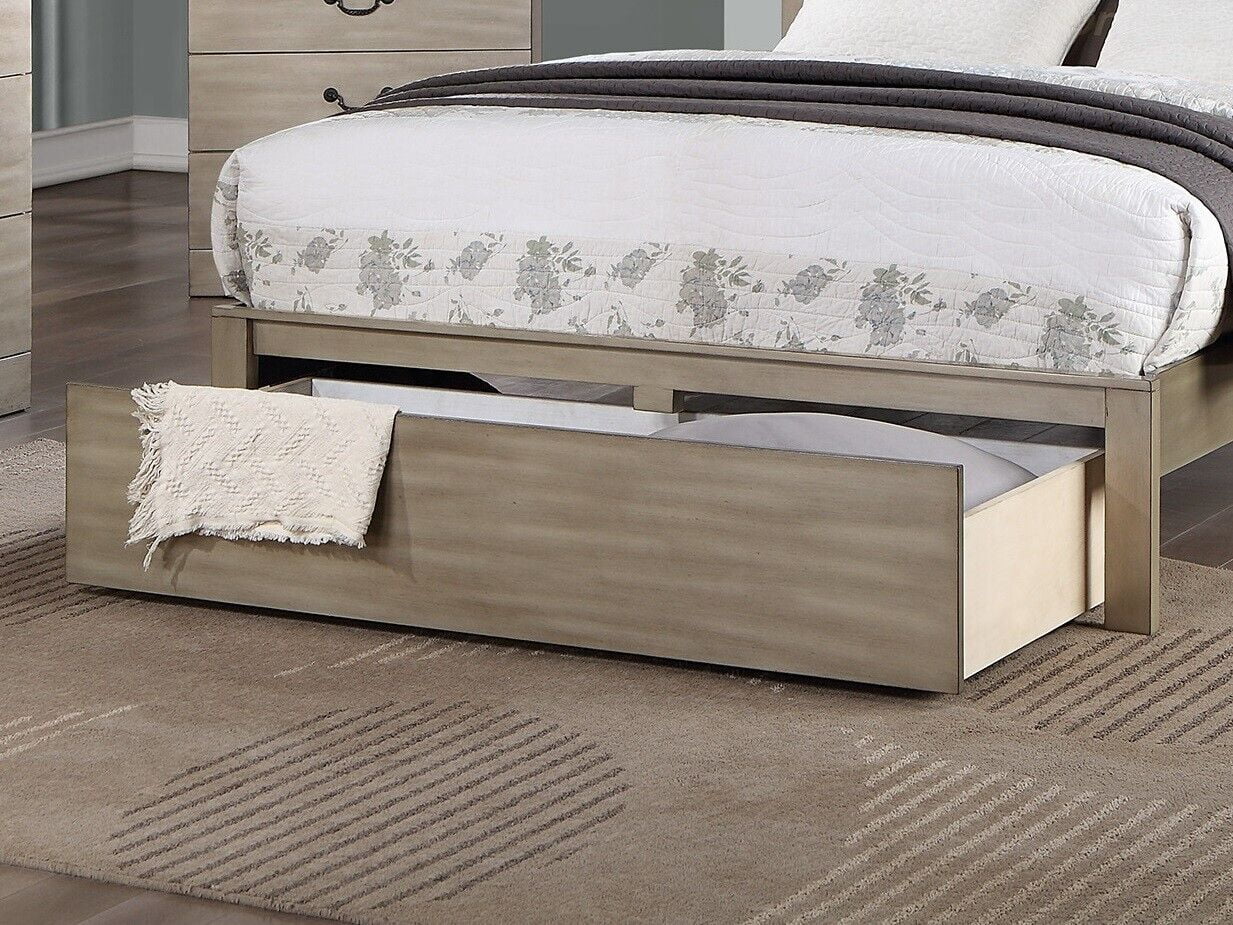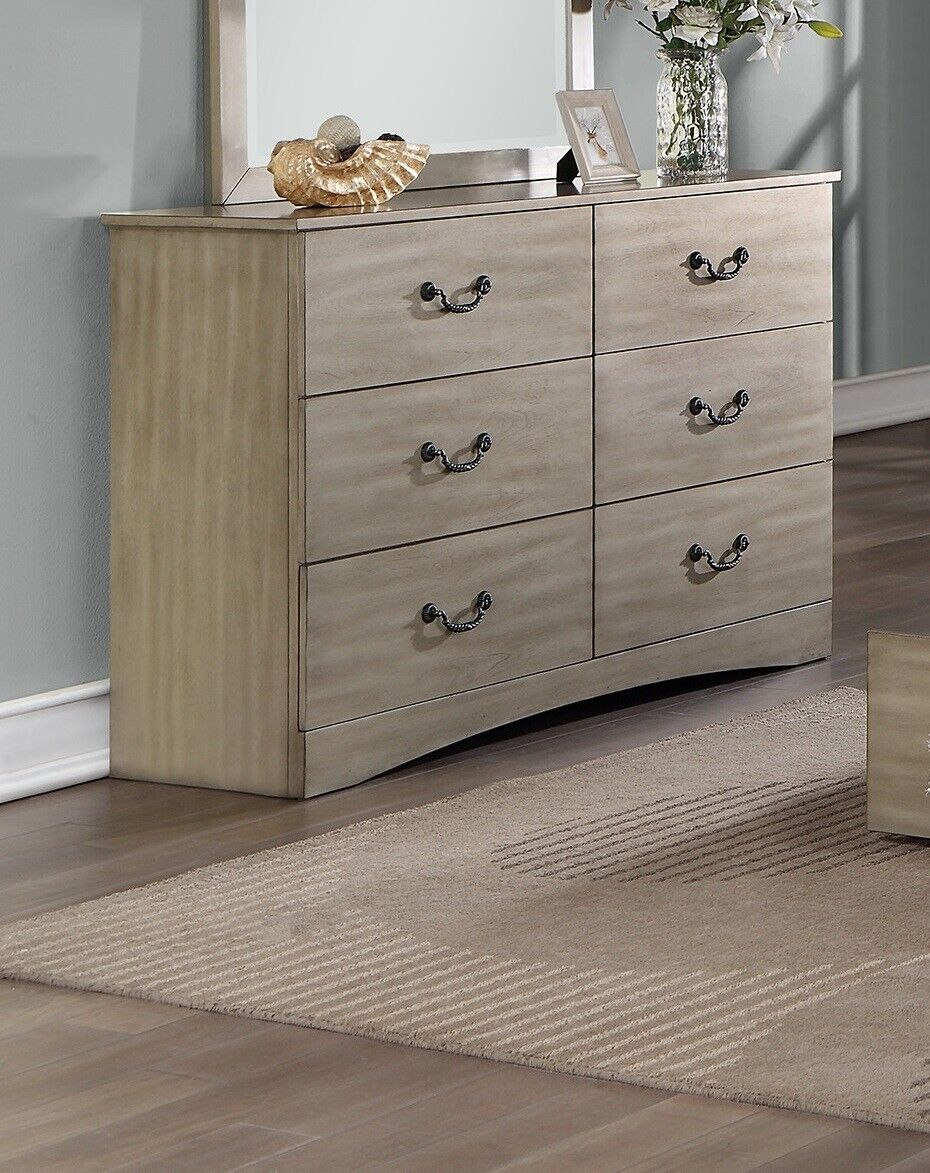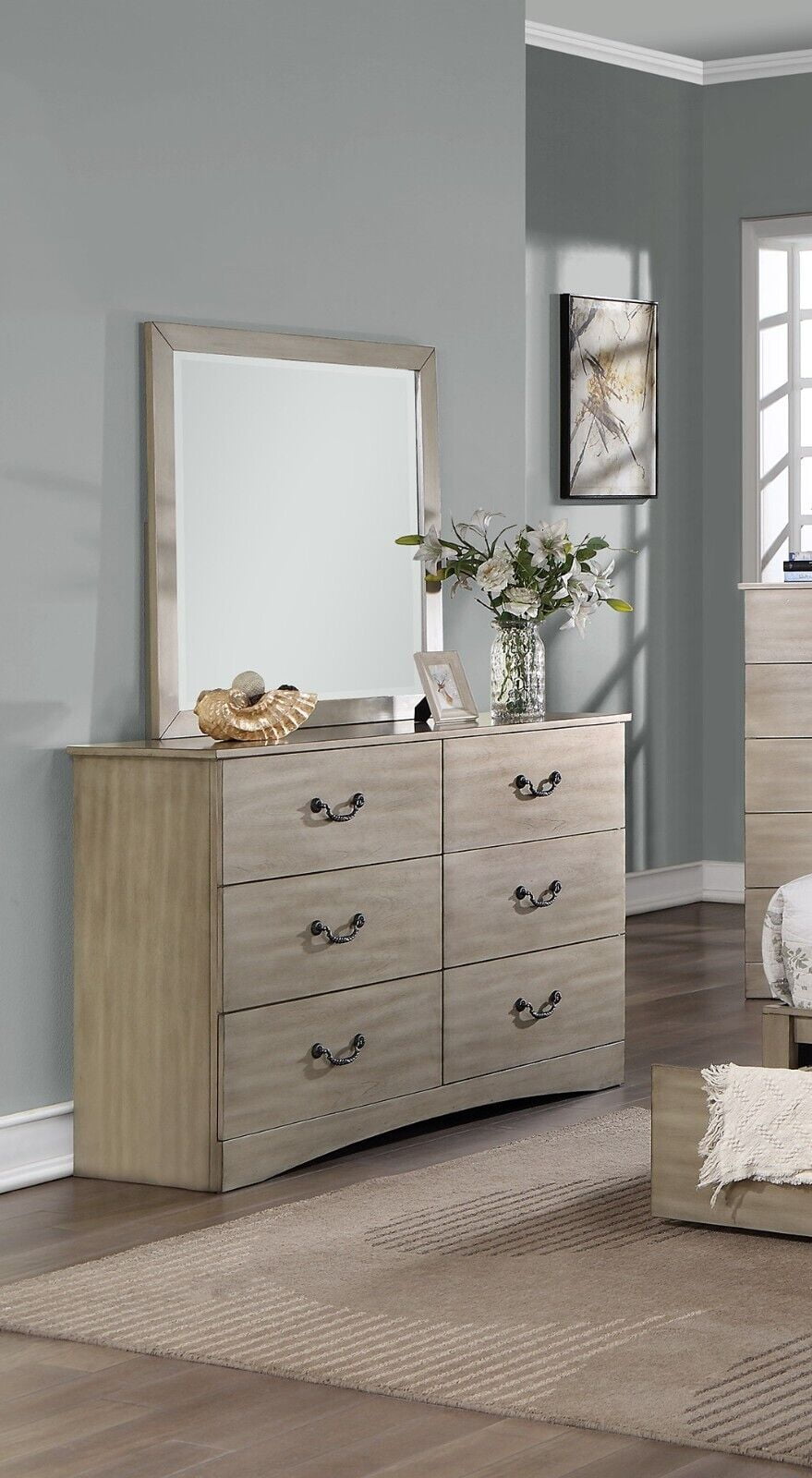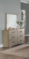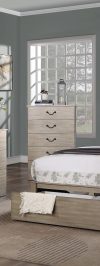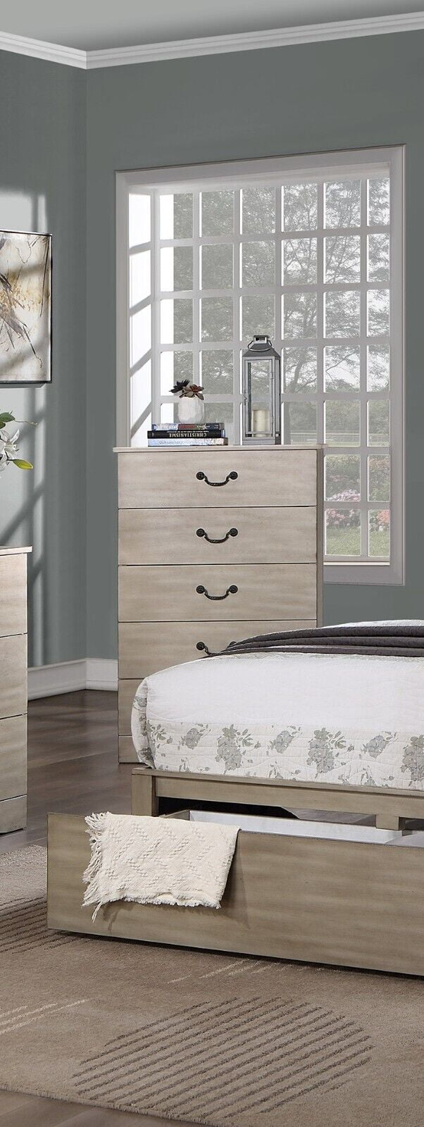 Illuminate your resting place with a master bedroom set chic design and character. This set includes a nightstand, dresser, mirror, and chest all covered in a light tan hue with rustic-like hardware for clear contrast. A minimalistic feel is provided with two options of the center focus — the bed frame. Select from a simple 2-panel headboard with a rectangular-shaped footboard or a frame that includes a large single-drawer footboard to store extra bedding. Add some modern country charm to your bedroom with a set that provides everything you need to relaxation and style. The bed frame is available in the following sizes: Queen, Cali king and Eastern king.