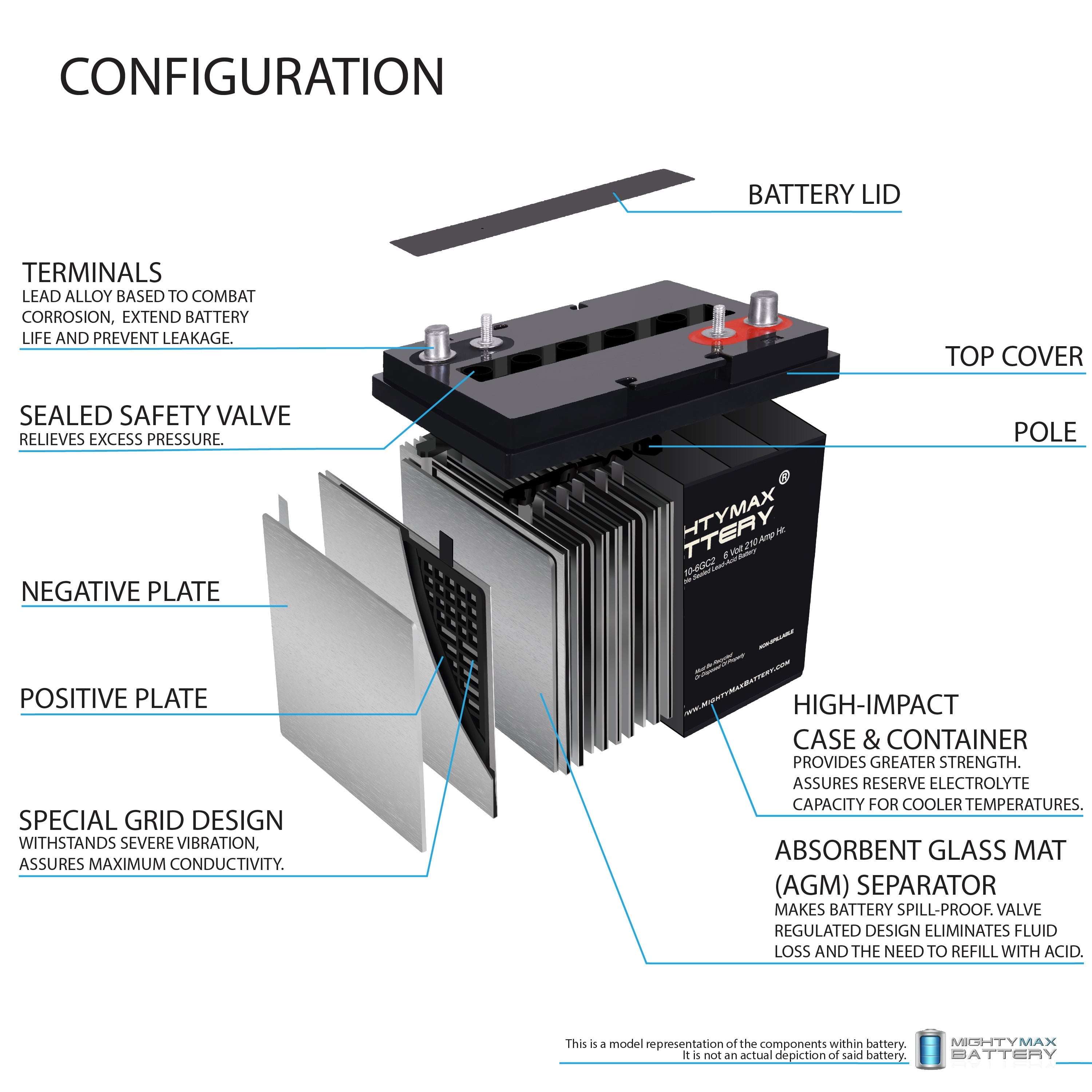 Delivering power when you need it, the Mighty Max ML210-6GC2 Dual Terminal 6 Volt 210 AH uses a state of the art, heavy-duty, calcium-alloy grid that provides exceptional performance and service life in both float and cyclic applications.