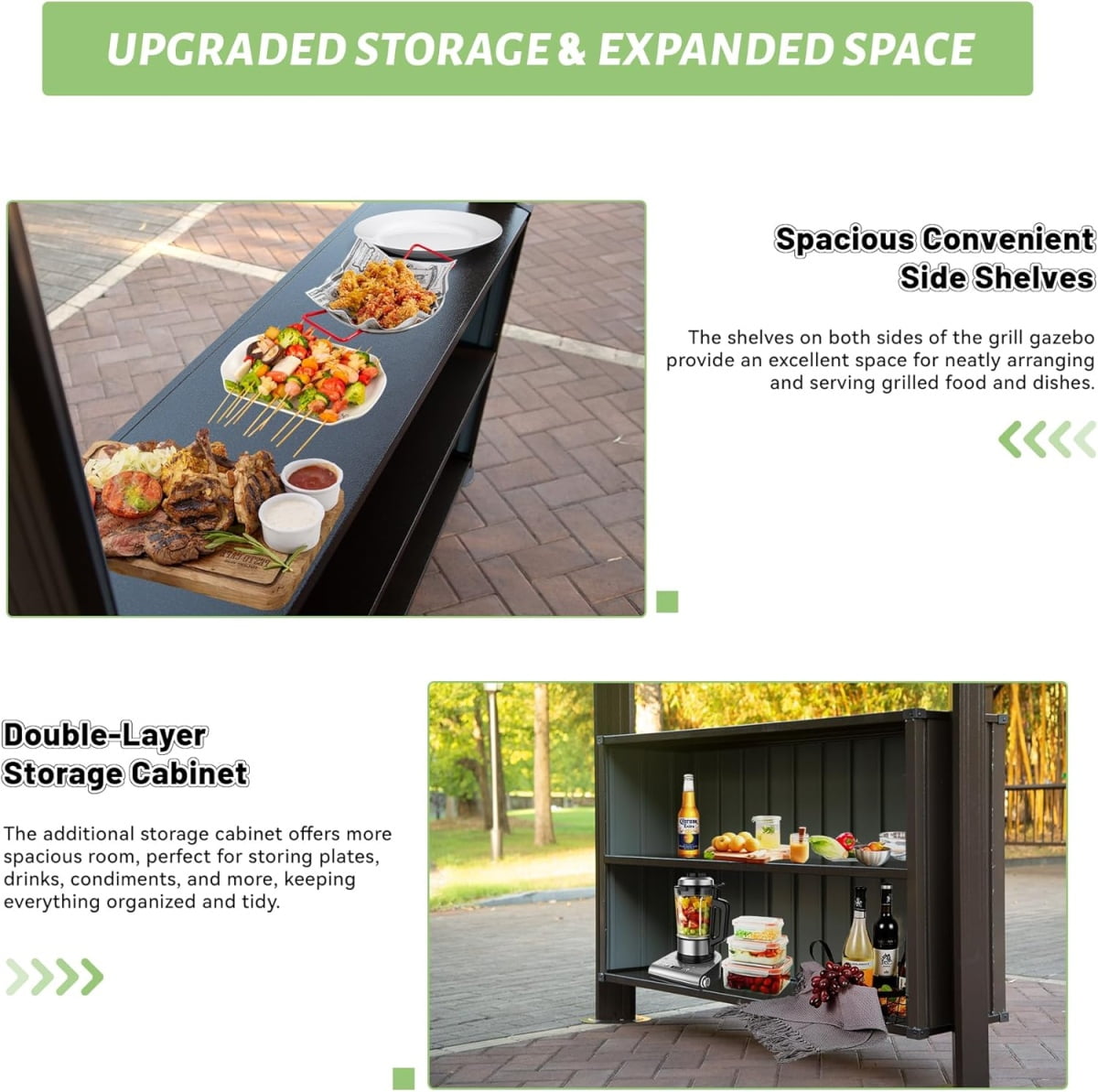 - 【Practical Storage Cabinets】Designed with practicality in mind, this 6×10 BBQ gazebo comes with two large side cabinets that offer plenty of space to store your grilling essentials, food, and beverages. Keep your outdoor space organized and your grilling tools close at hand, making it easier than ever to entertain guests and enjoy your barbecue