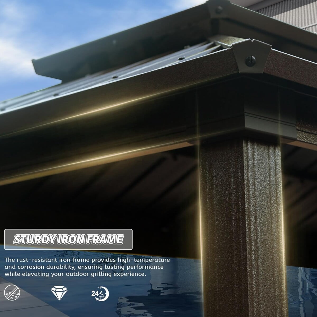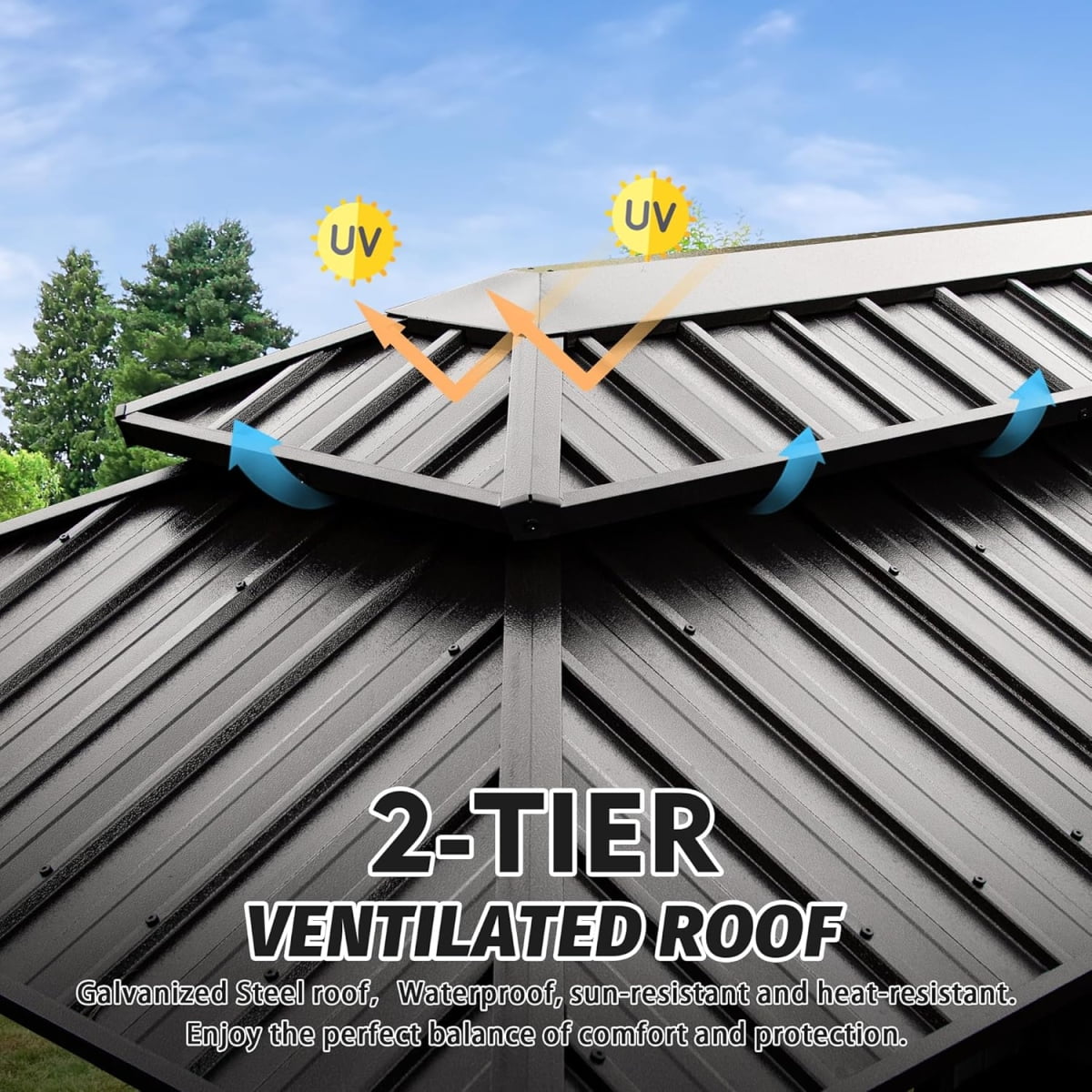 - 【Durable Galvanized Steel Roof】Built to withstand the elements, this Hardtop Gazebo features a high-quality powder-coated galvanized steel roof. This UV-resistant, durable roof shields you from the sun’s harsh rays while remaining sturdy enough to endure heavy rain, wind, and even snow