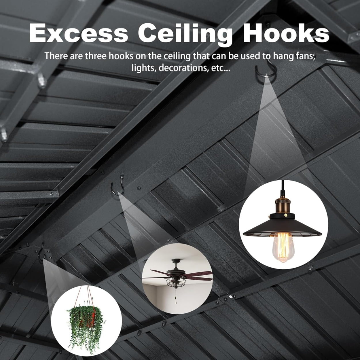 - 【Versatile Ceiling Hooks】This outdoor gazebo comes with three durable ceiling hooks that provide a convenient way to hang lights, fans, or other decorations. Whether you’re setting the mood for an evening barbecue or adding a bit of flair to your space, these hooks allow you to effortlessly create the ideal atmosphere for any occasion