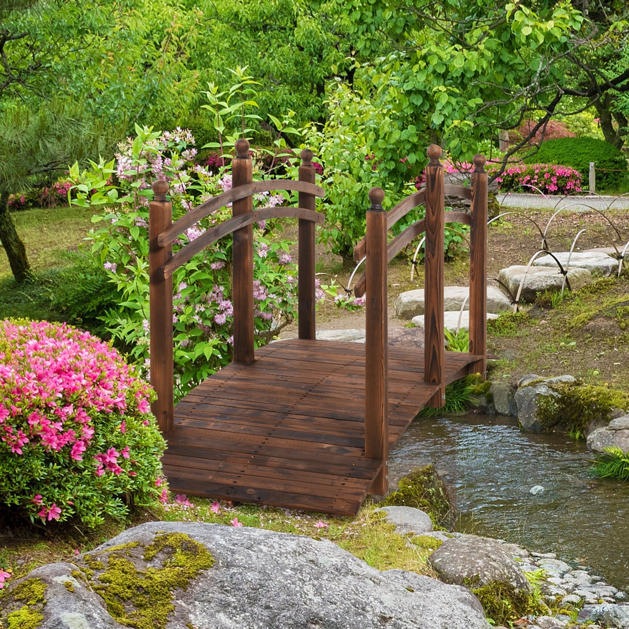 Our wooden arched garden bridge exudes classic charm and blends well with a variety of outdoor styles. Whether you’re going for a rustic country farmhouse style, an adventurous bohemian home, or your own Zen garden, it’ll make a great addition to your garden landscape.