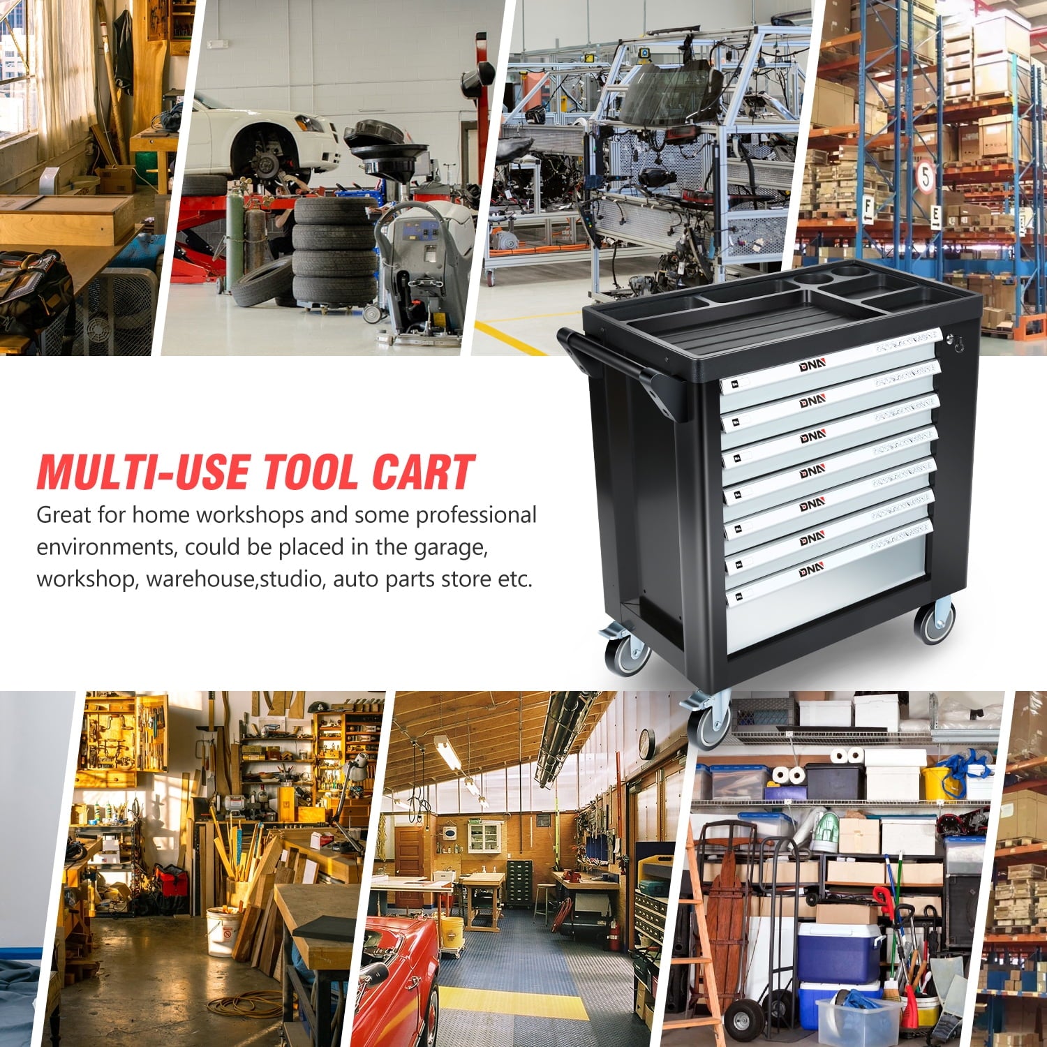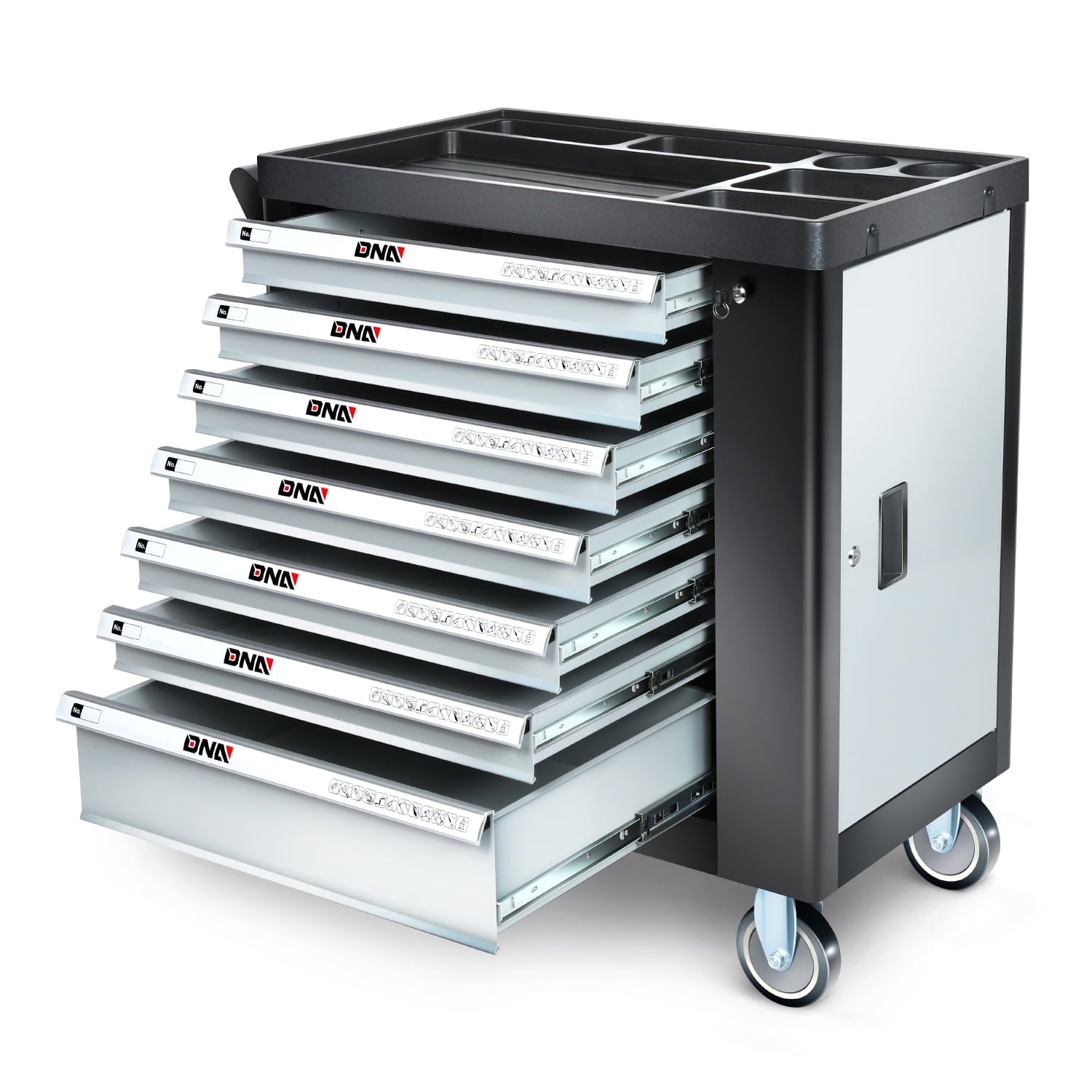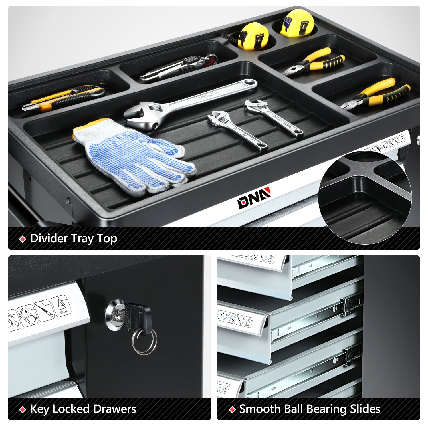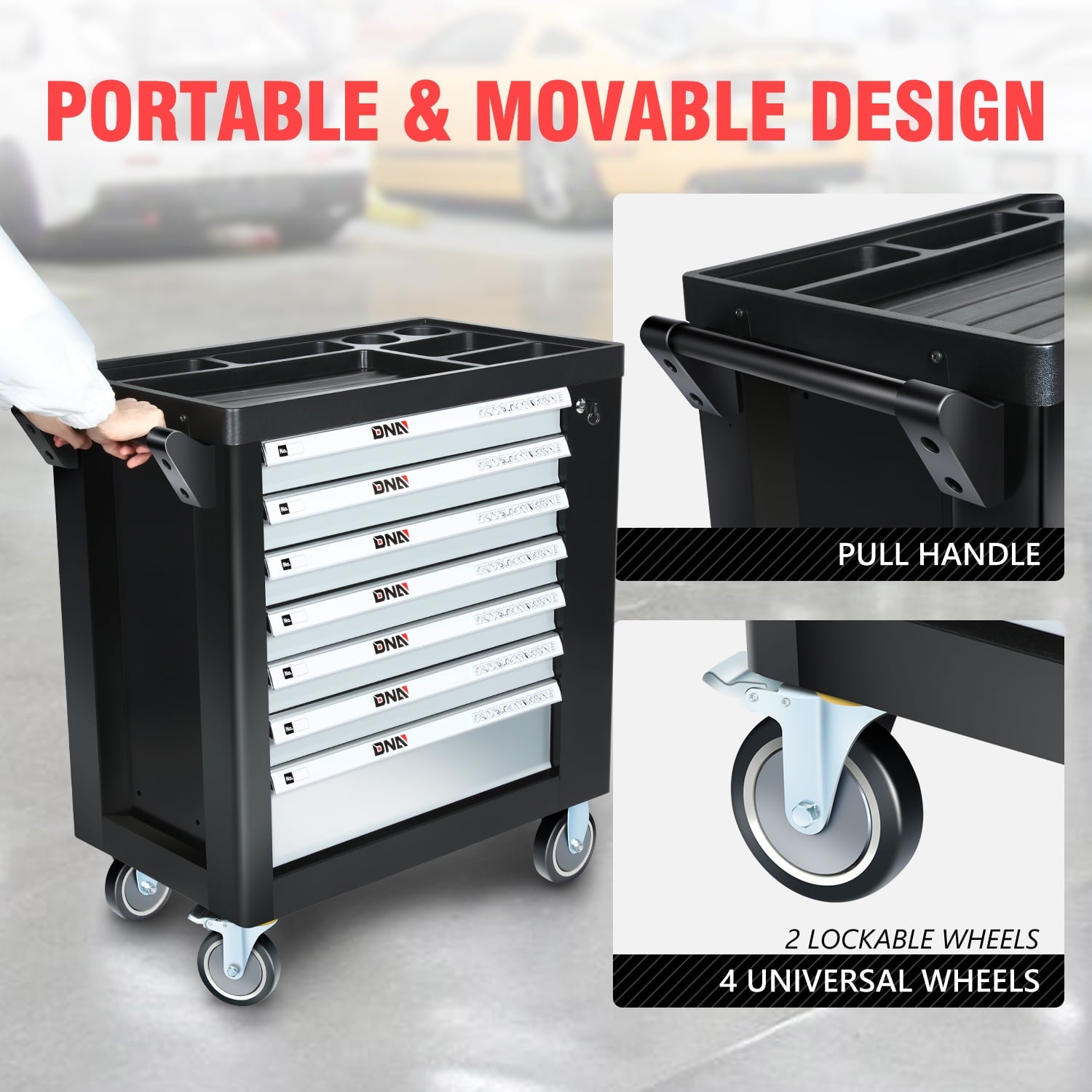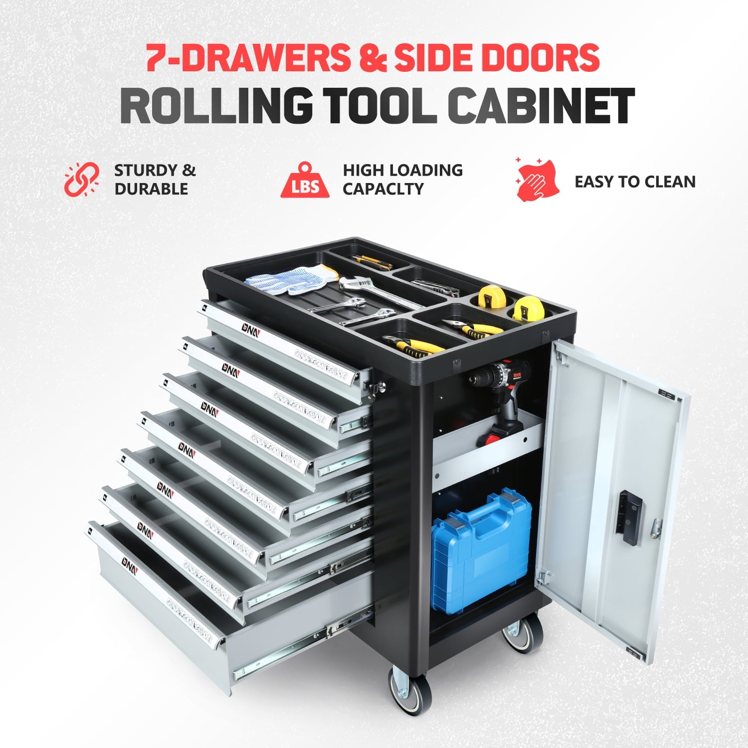 7-DRAWERS TOOL CABINET – This rolling tool box with 7 drawers(6 small drawers+1 middle drawers) , a side storage compartment and plastic divider tray top, provides abundant space for your tools and accessories