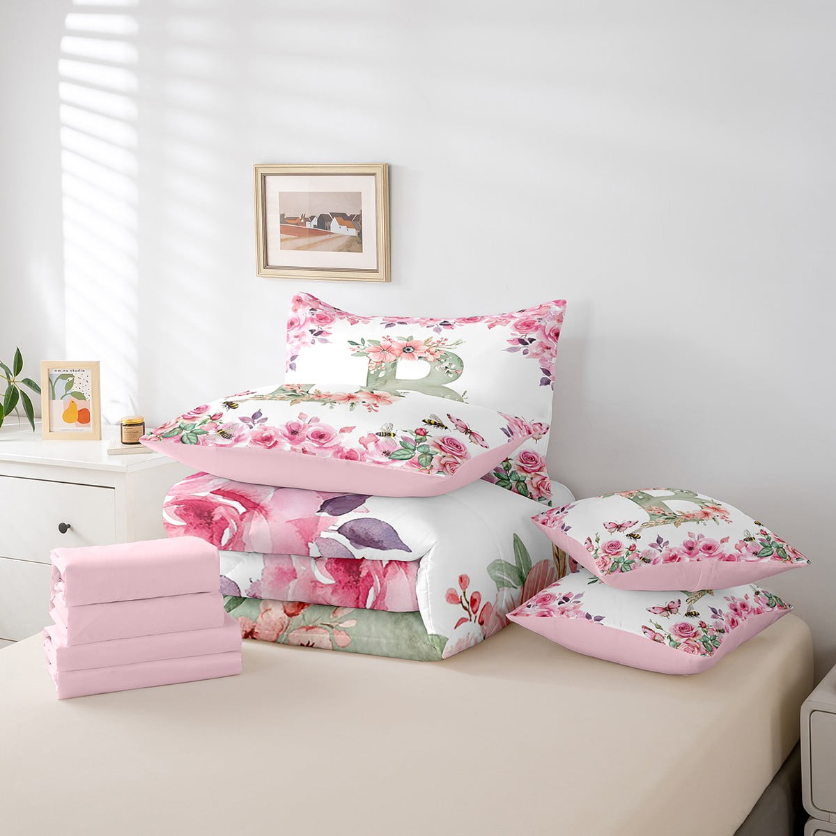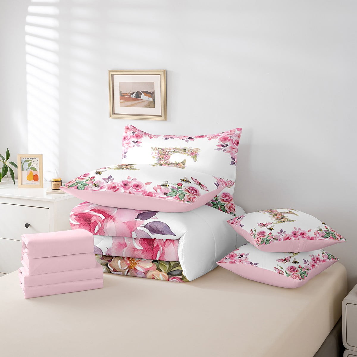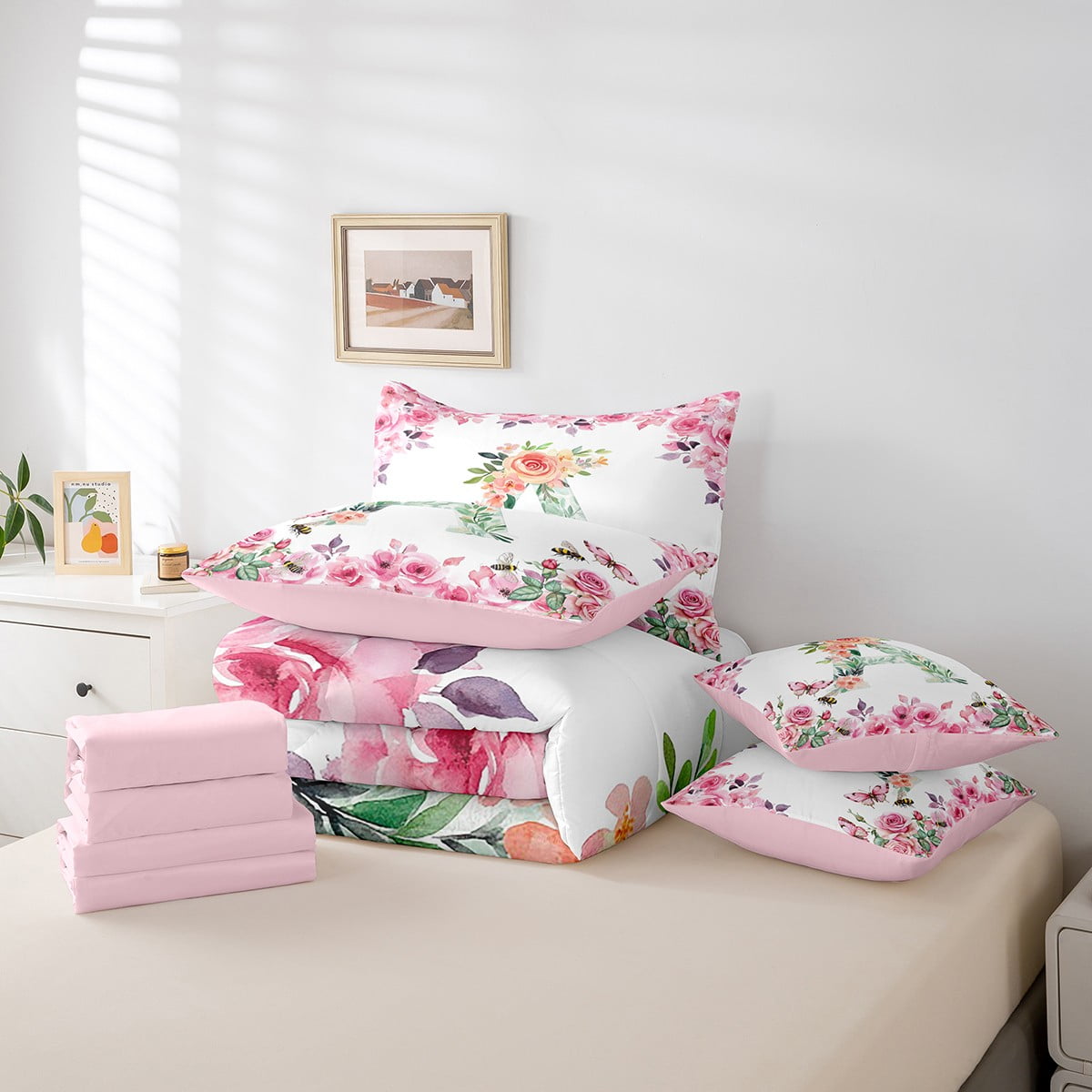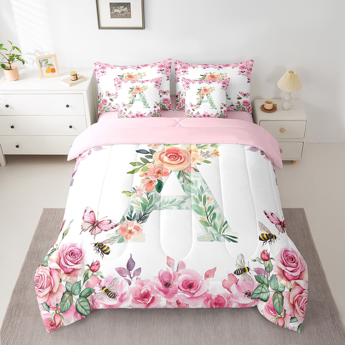 Home Bed-in-a-Bag 7 Piece Bed in a Bag Twin Size Comforter Set Floral A-Z Bedding Set,Initial Letter Reversible Bed Set,Monogrammed Comforter with Sheet Set,All Season