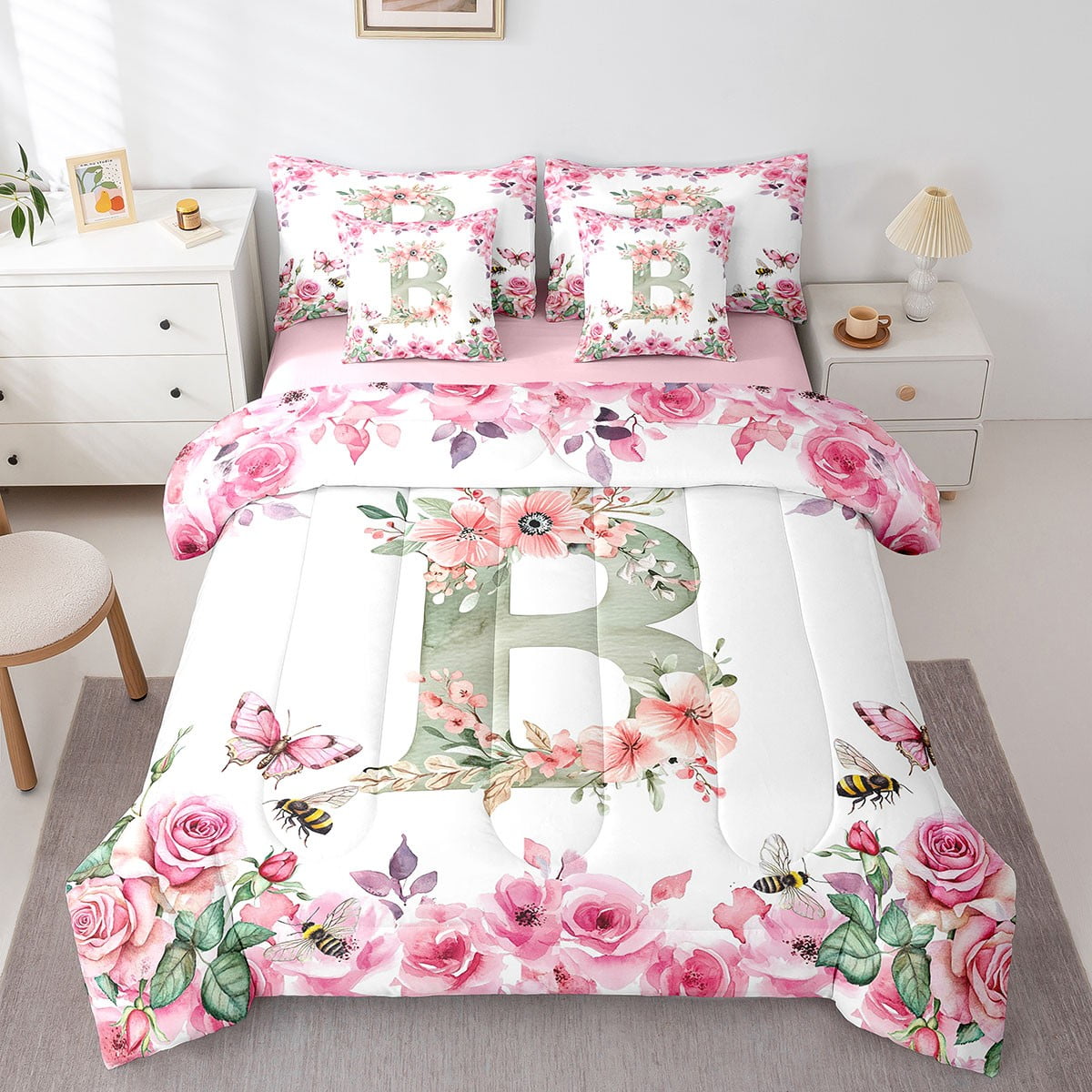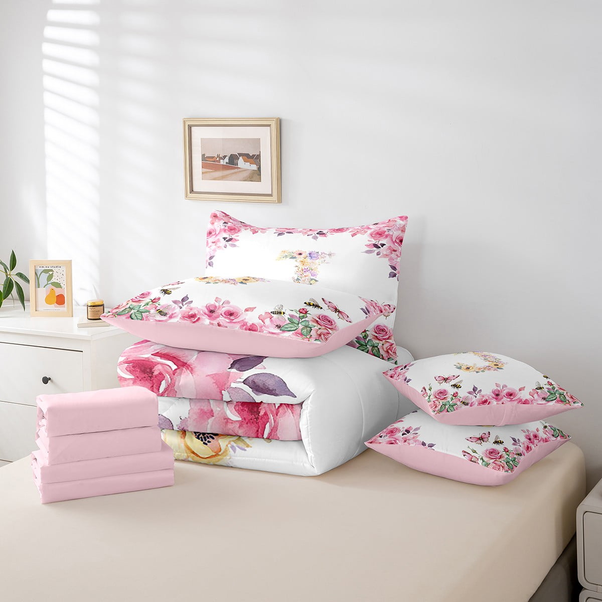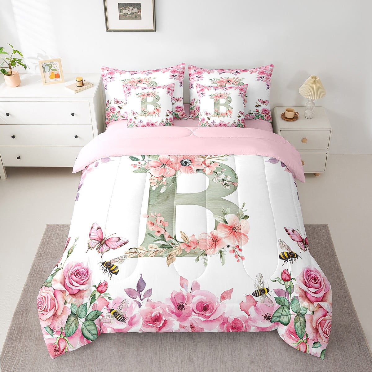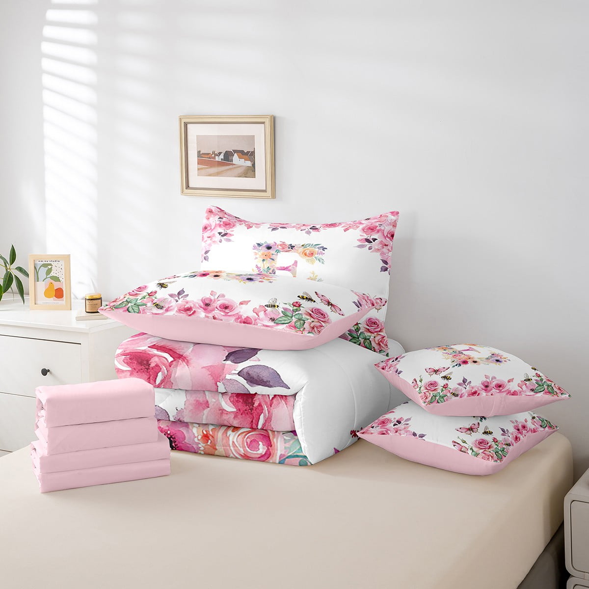 Home Bed-in-a-Bag 7 Piece Bed in a Bag Twin Size Comforter Set Floral A-Z Bedding Set,Initial Letter Reversible Bed Set,Monogrammed Comforter with Sheet Set,All Season