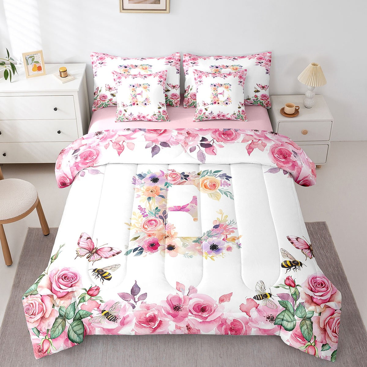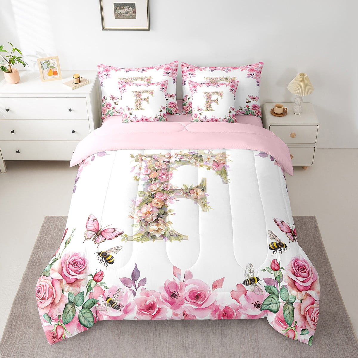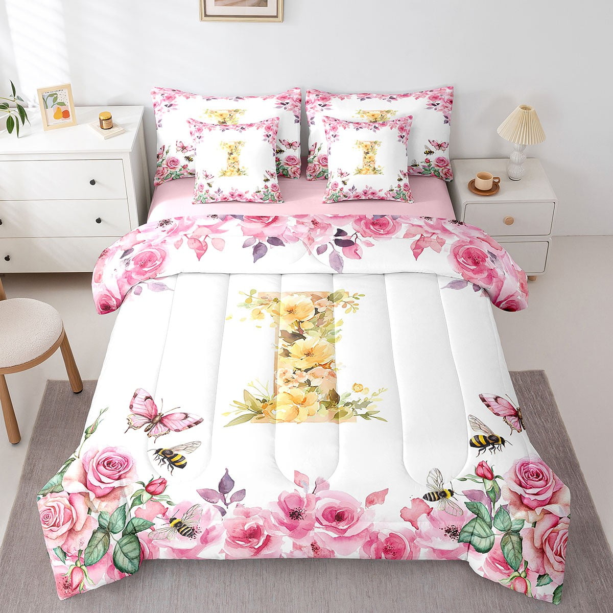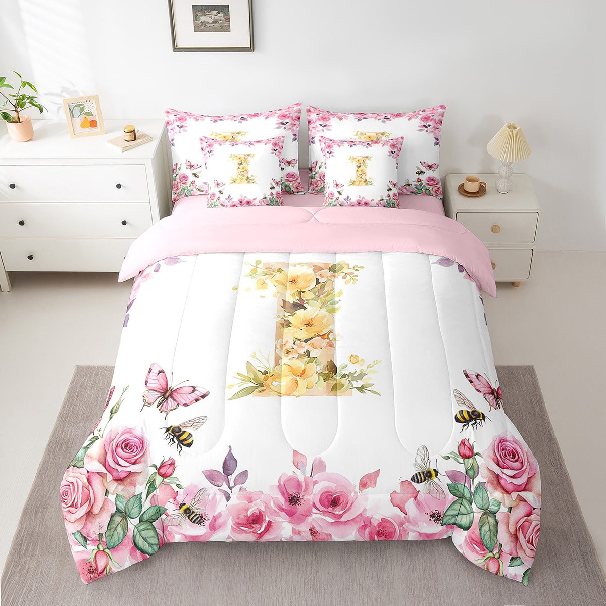 Home Bed-in-a-Bag 7 Piece Bed in a Bag Twin Size Comforter Set Floral A-Z Bedding Set,Initial Letter Reversible Bed Set,Monogrammed Comforter with Sheet Set,All Season