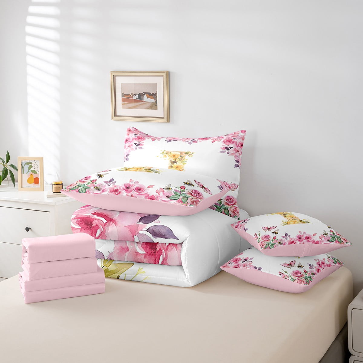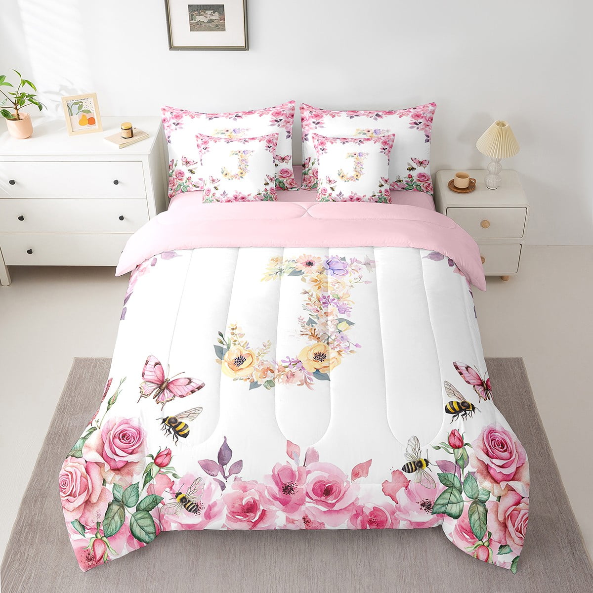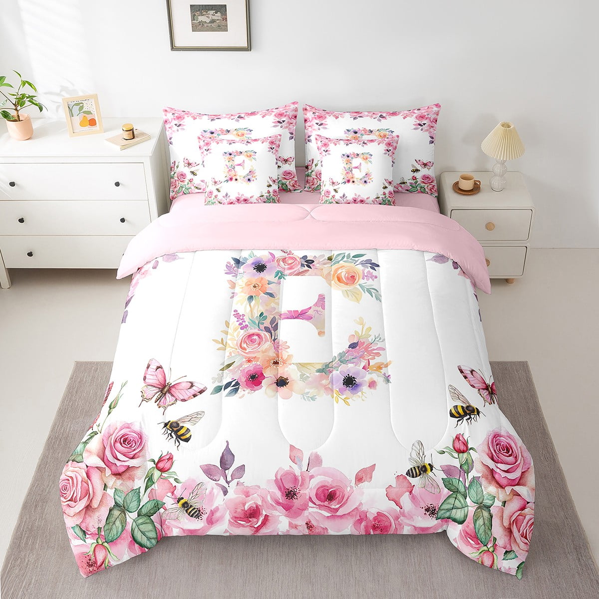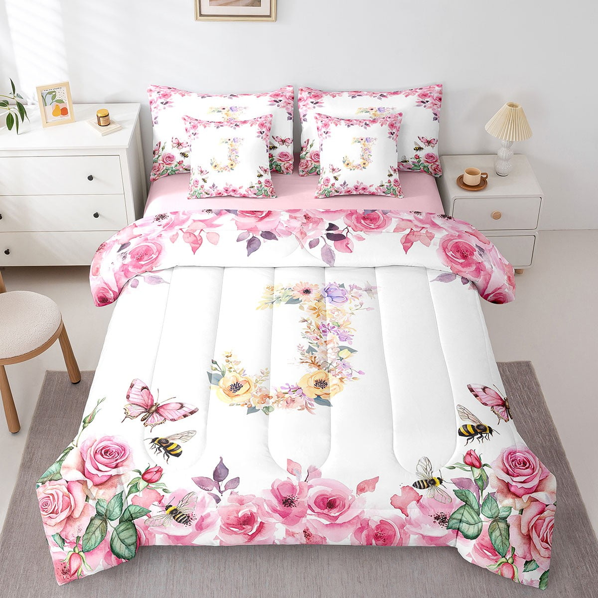 Home Bed-in-a-Bag 7 Piece Bed in a Bag Twin Size Comforter Set Floral A-Z Bedding Set,Initial Letter Reversible Bed Set,Monogrammed Comforter with Sheet Set,All Season