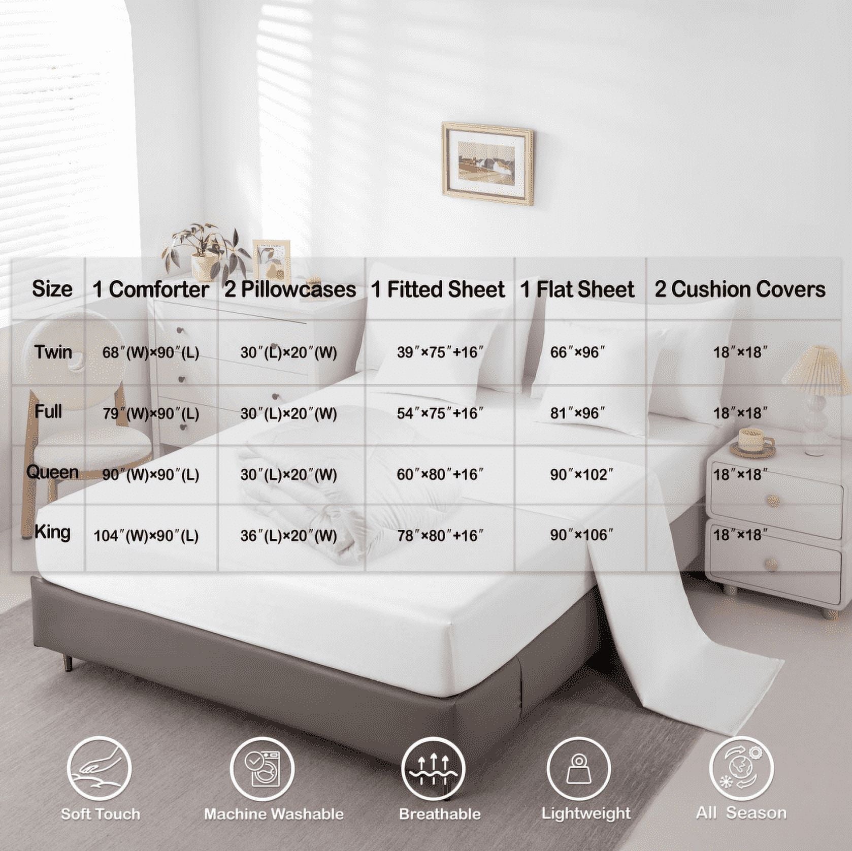 • What You Can Get: 7pcs bed in a bag includes a comforter 68″x90″, a flat sheet 67″x96″, a fitted sheet 39″x75″x16″, two pillowcases 20″x30″ and two throw pillow covers 18″x18″