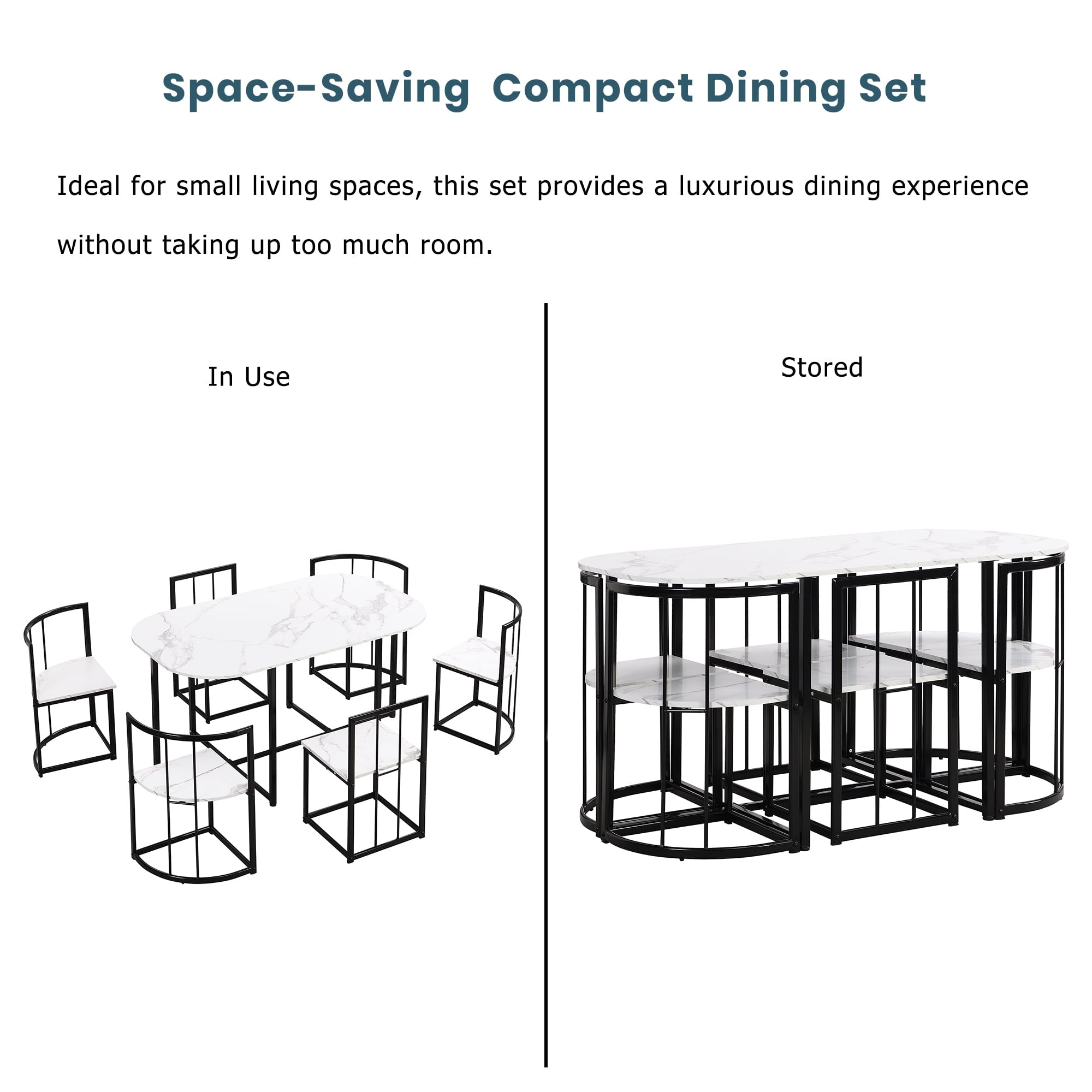 Compact Dining Table Set: This dining set offers both functionality and space-saving design, featuring a 55-inch table with six comfortable chairs that can be conveniently tucked under the table when not in use.