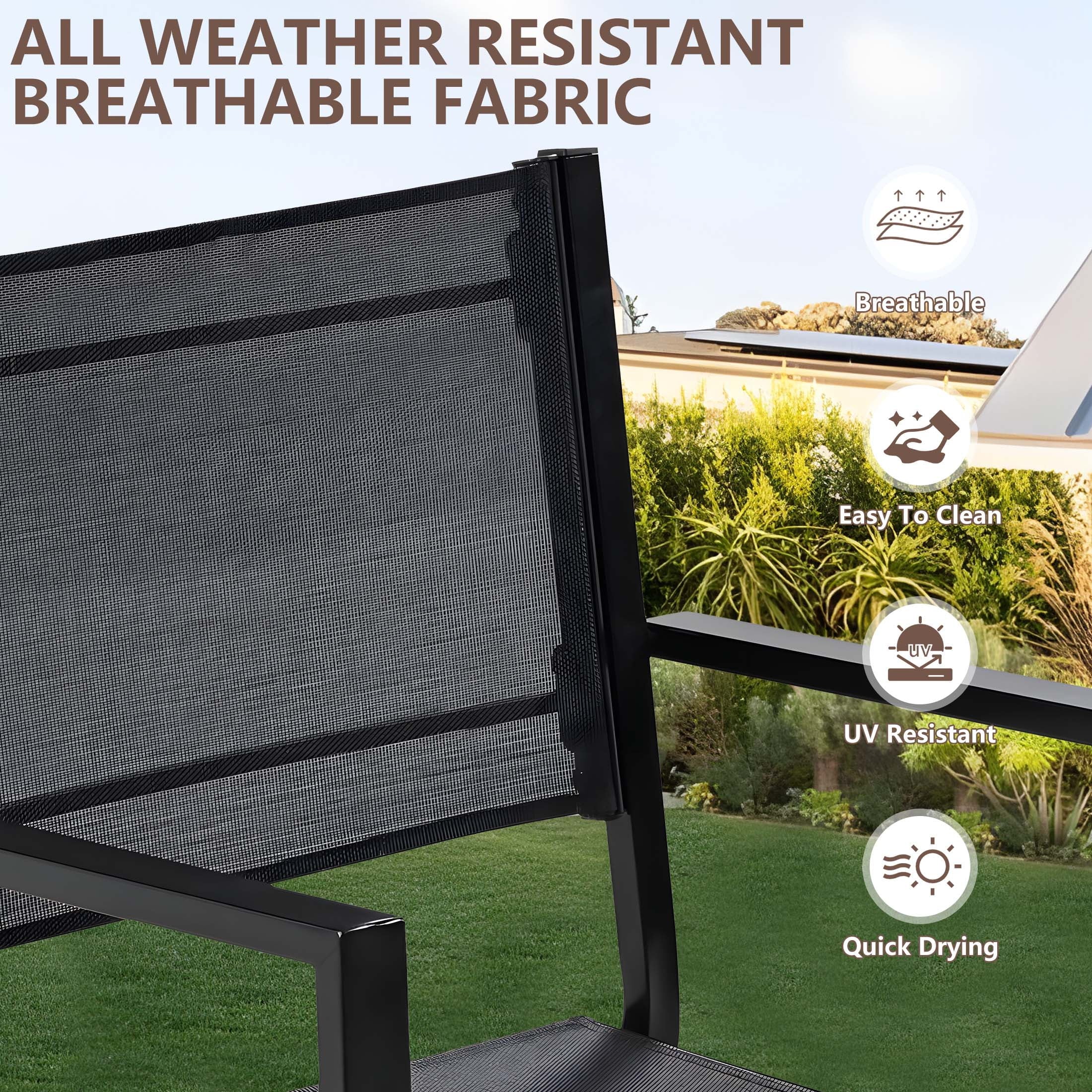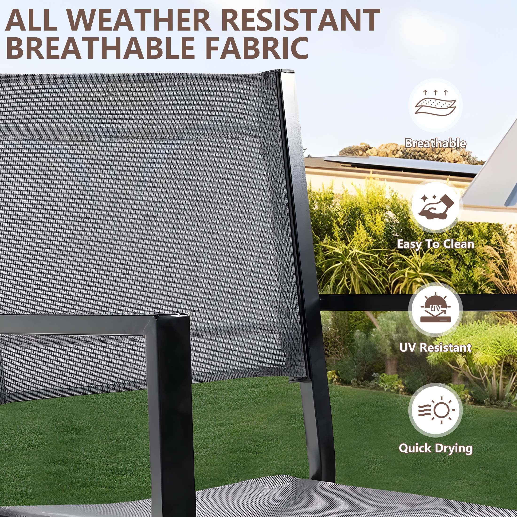 This patio dining table set has a stable and sturdy steel construction, which can be used for a long time. And the premium textilene material can adapt to different weather because it is durable and not easy to crack.