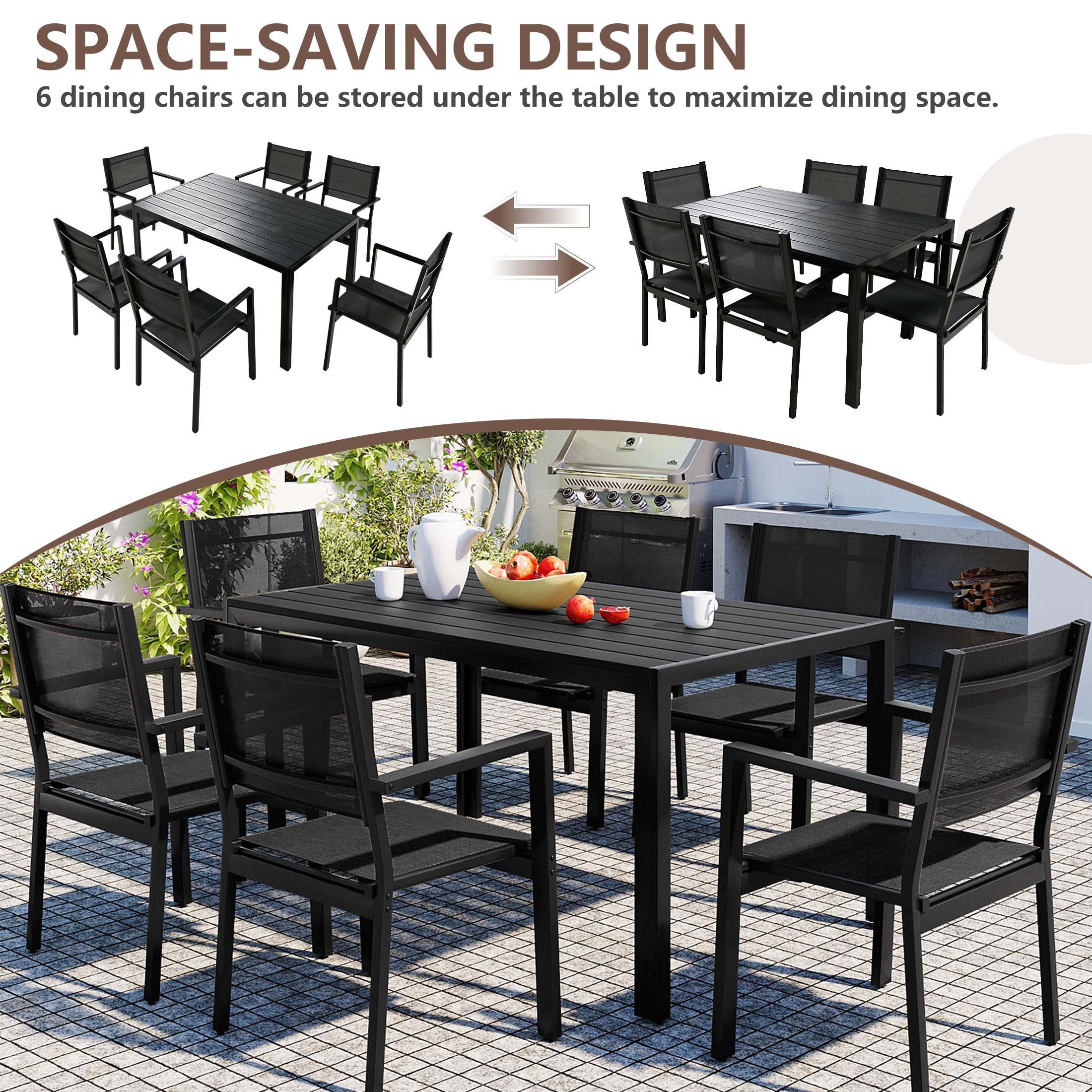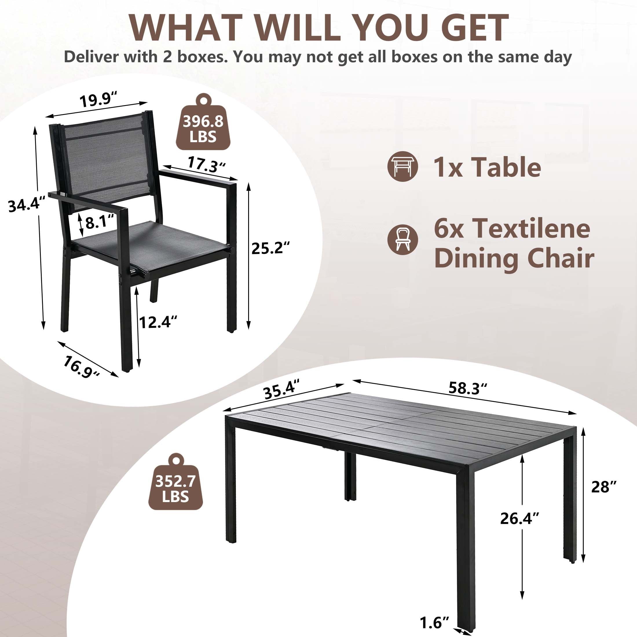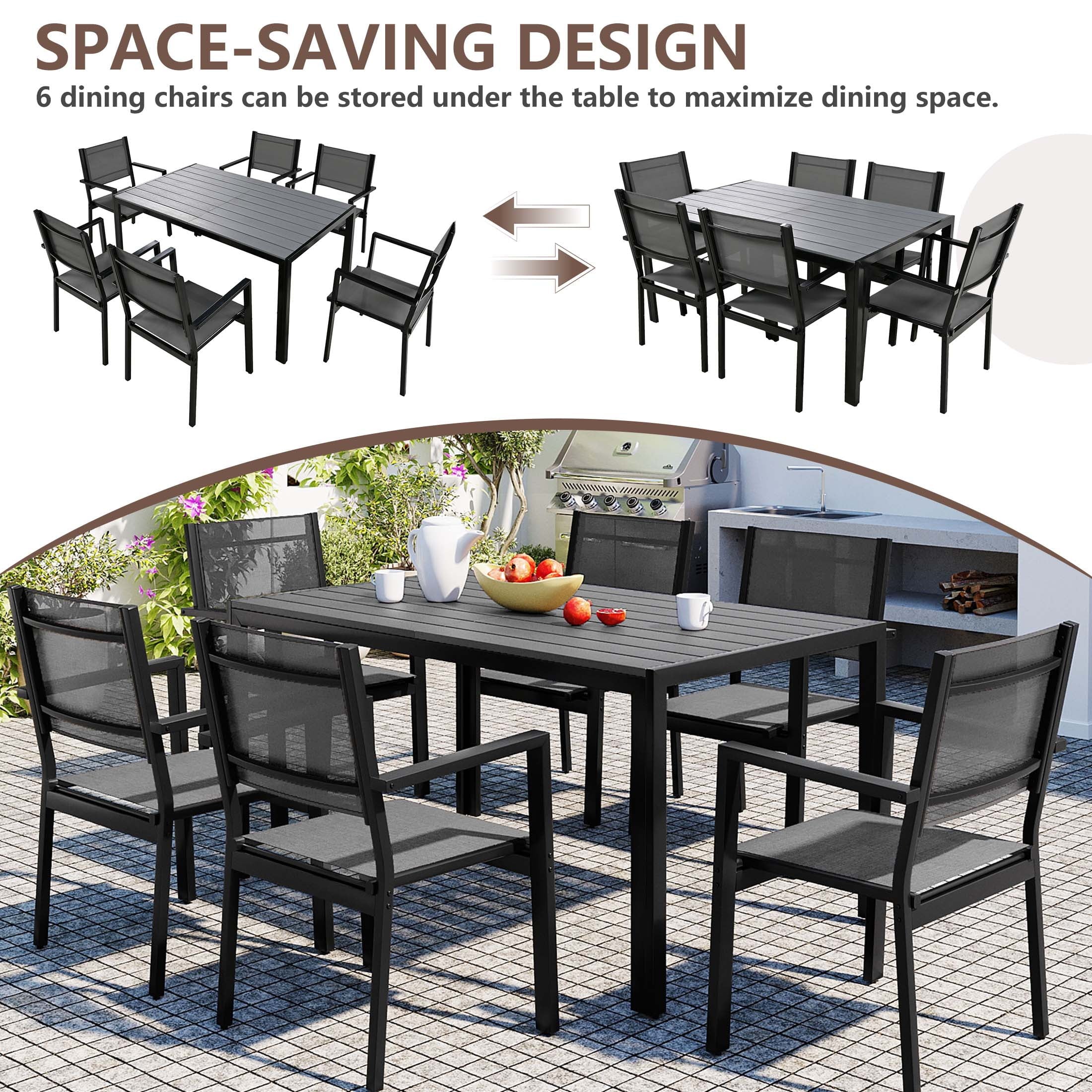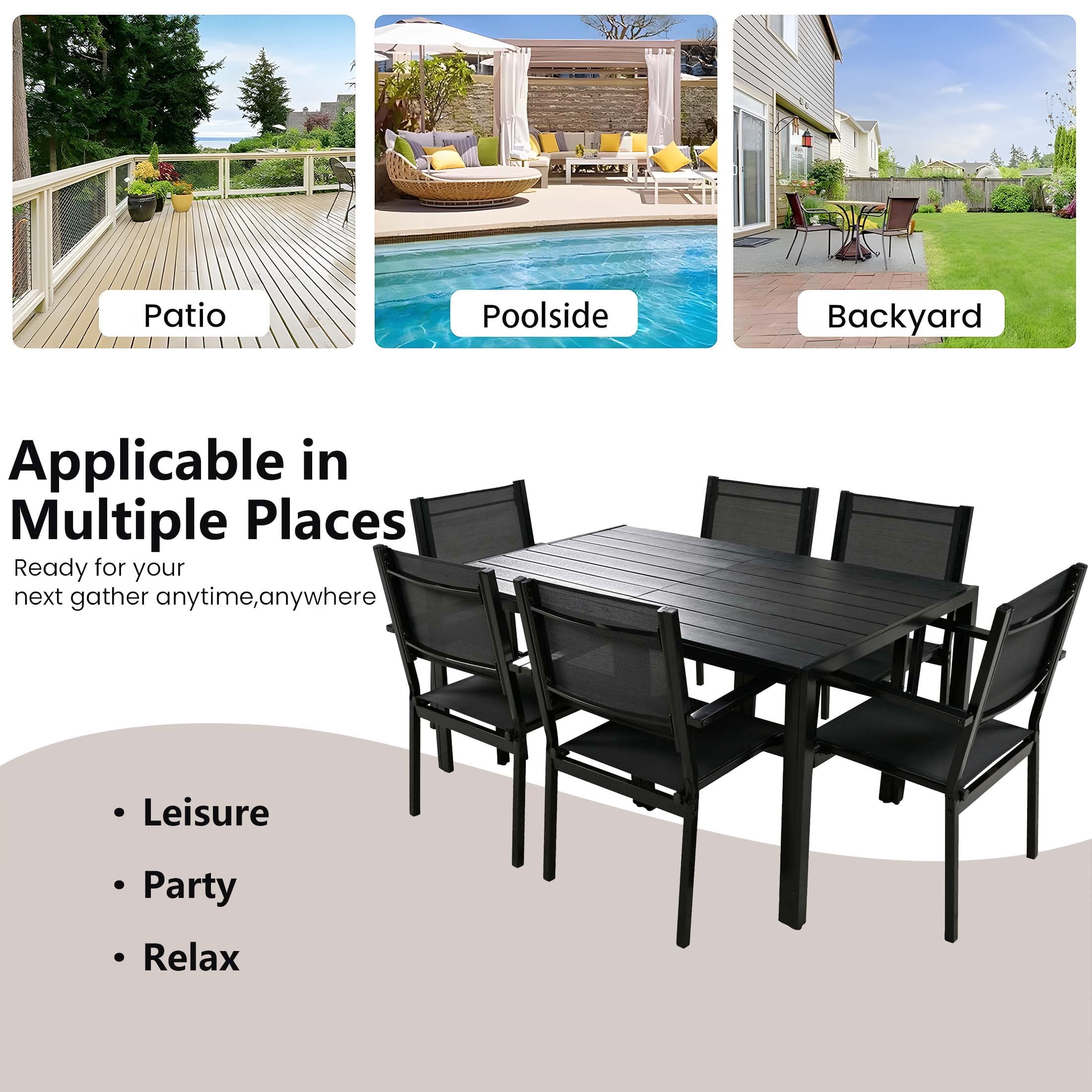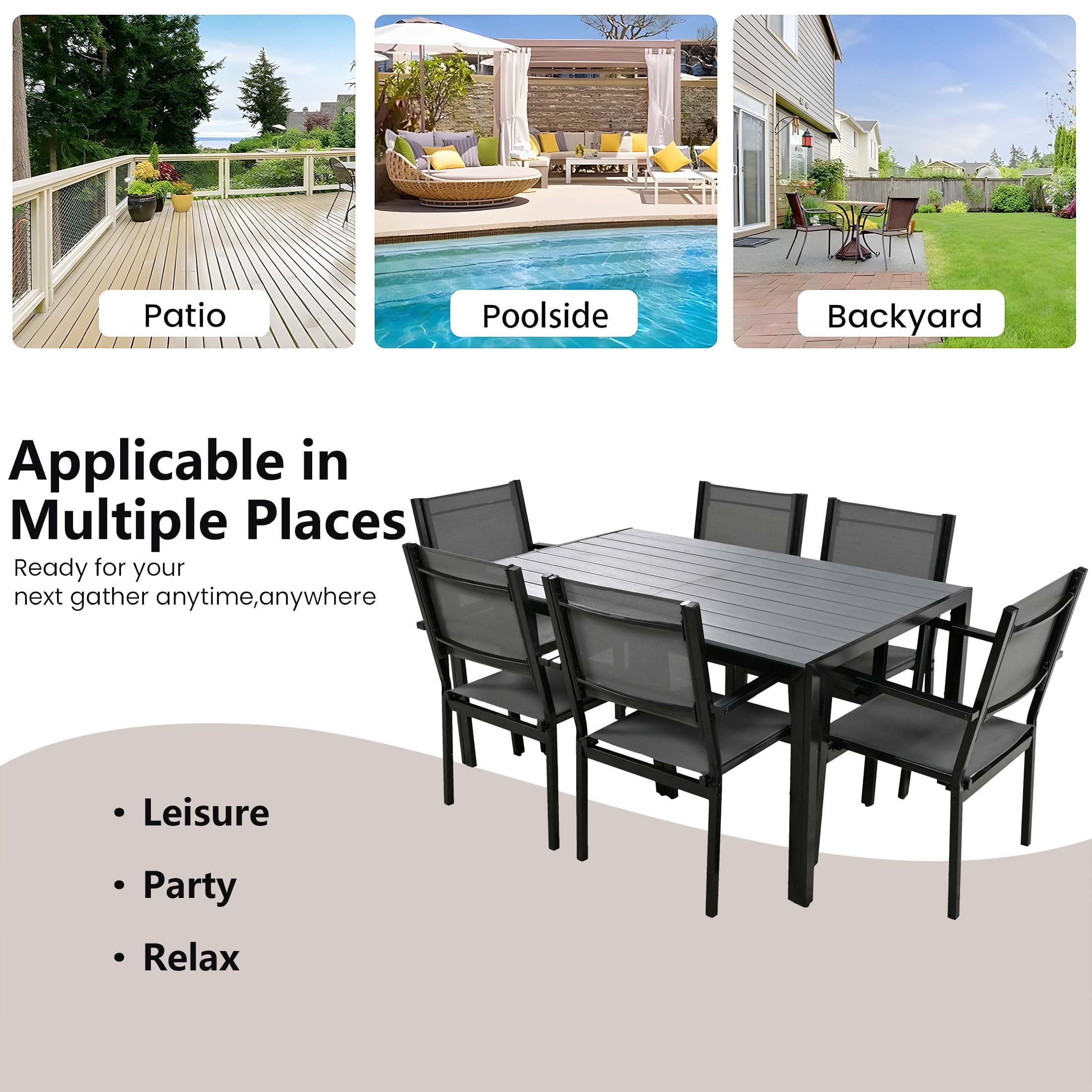 Including a rectangular dining table and 6 Textilene chairs, this outdoor patio dining set is a relaxing place to have meals or hold a party. Combining with classic color and modern design, our patio furniture set is great for various outdoor living spaces such as patios, backyards, gardens, balconies and poolside areas.