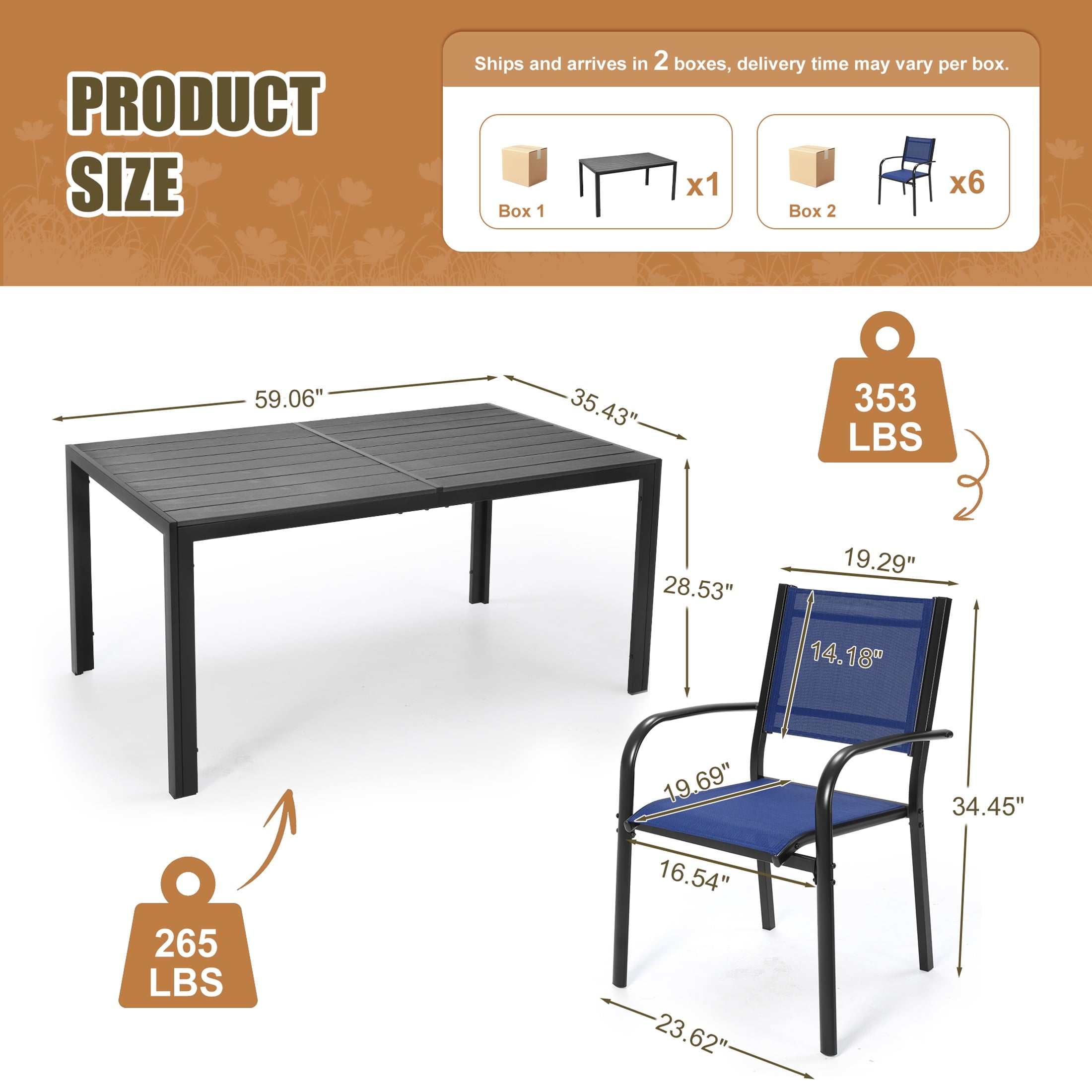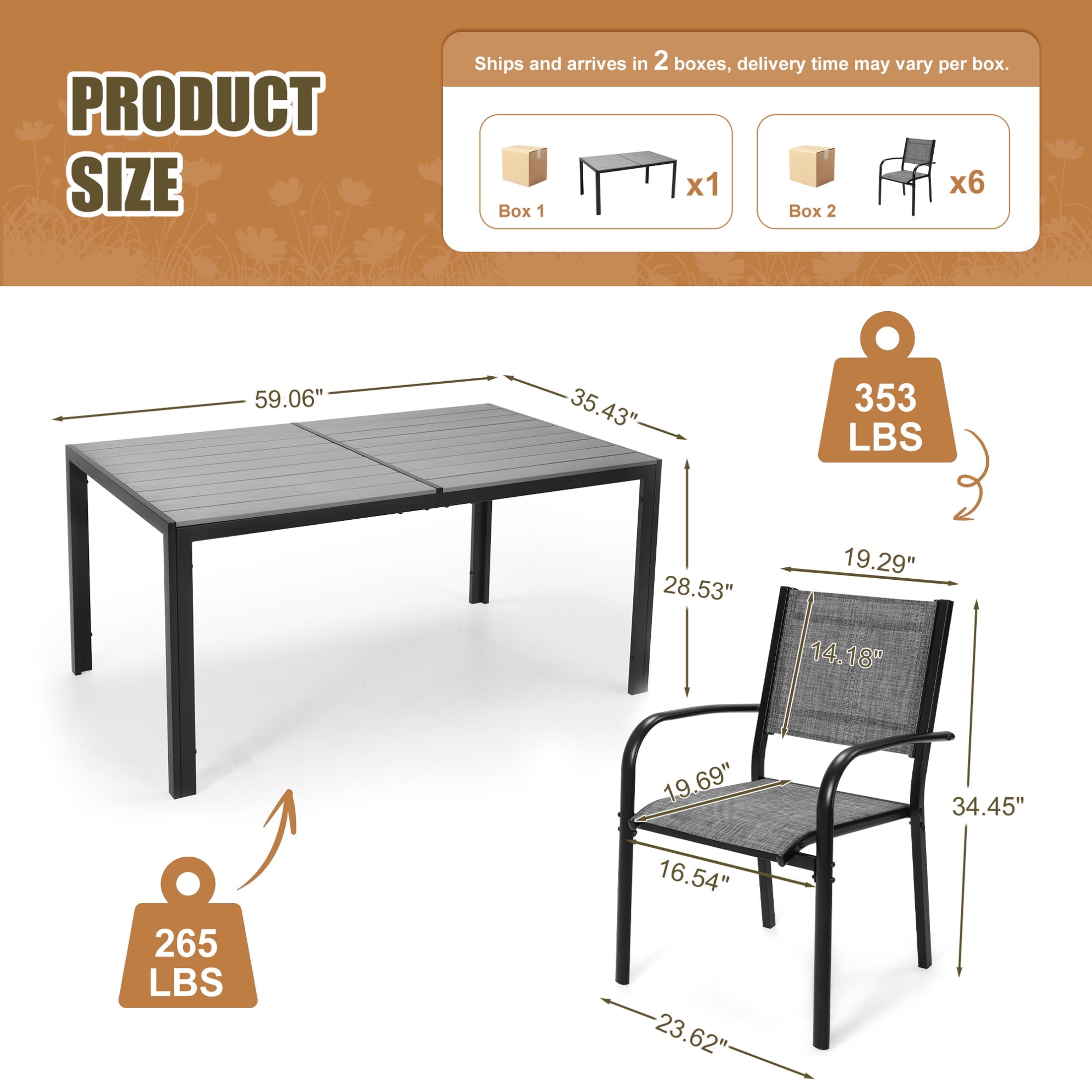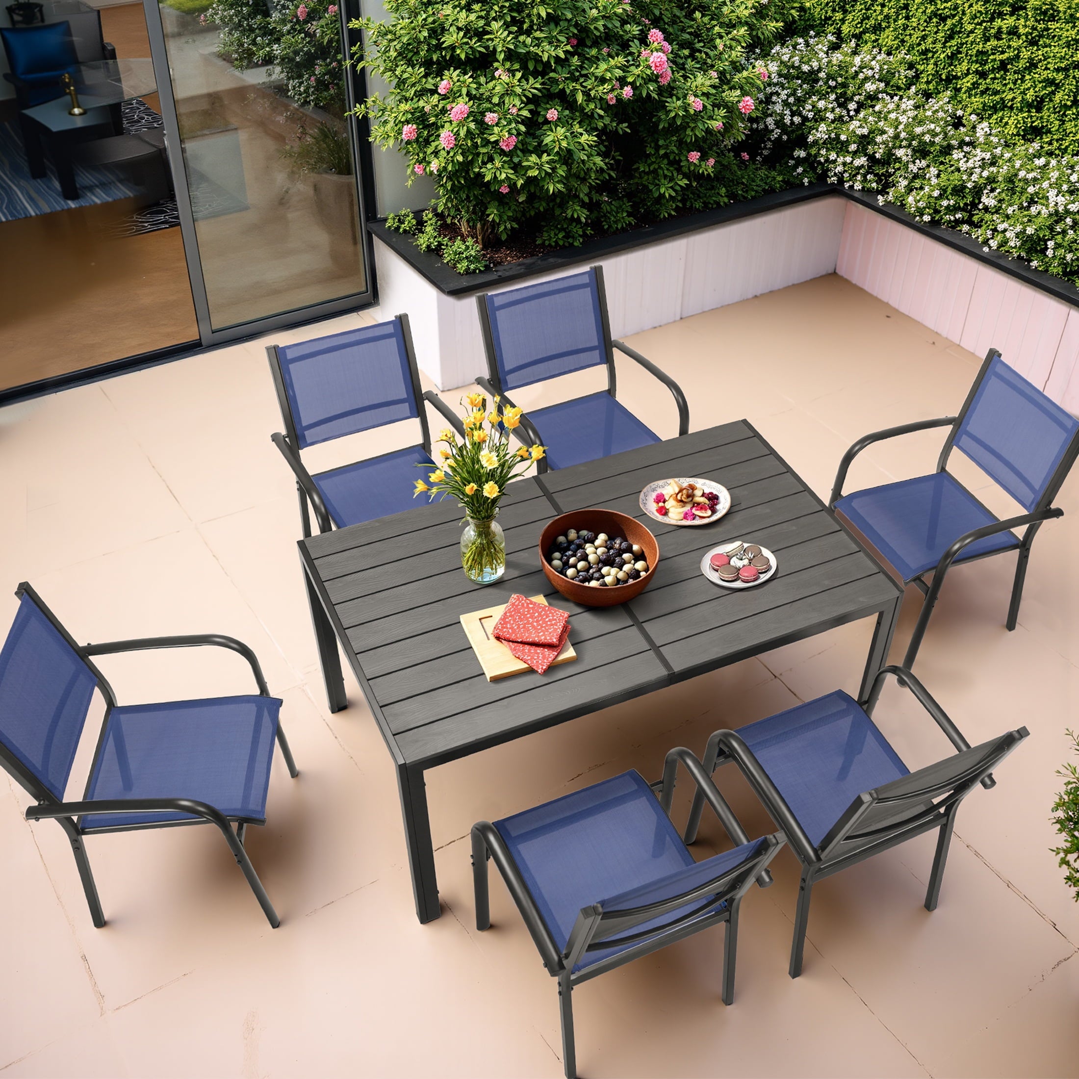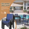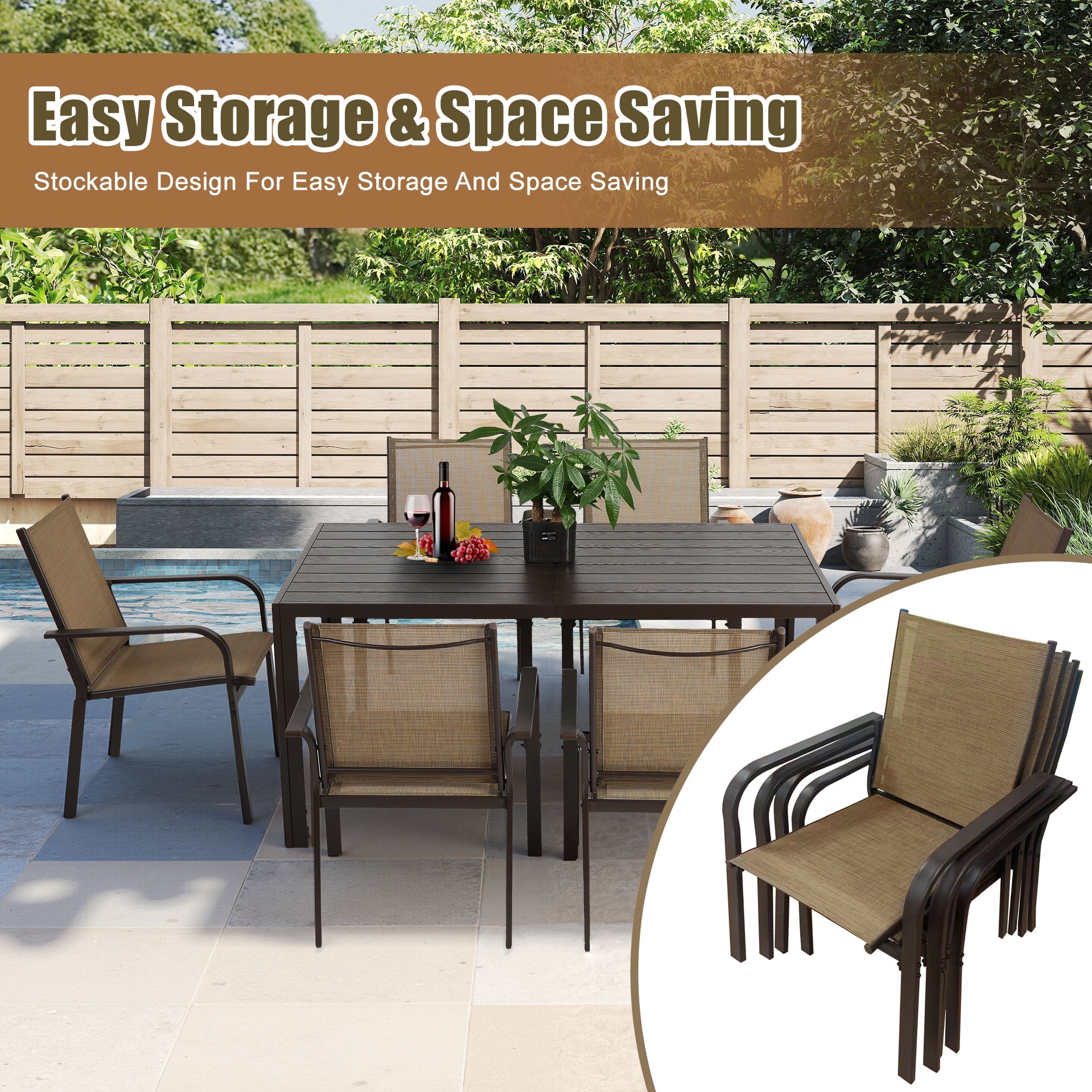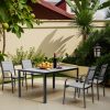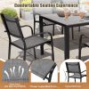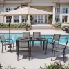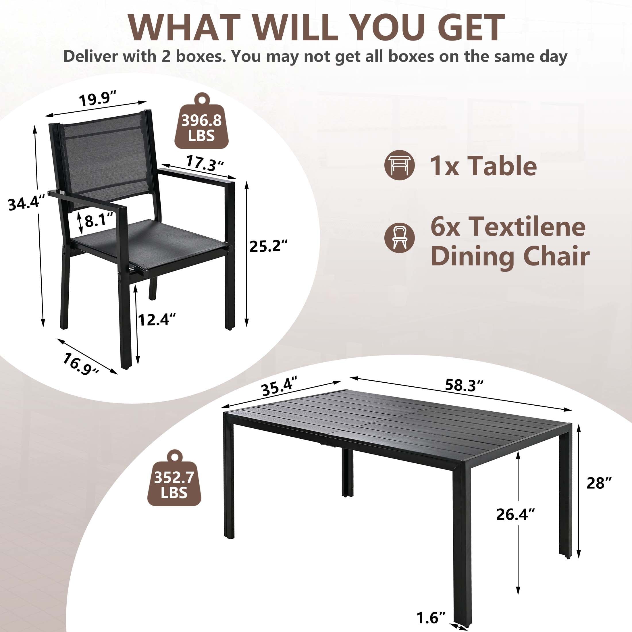 Including a rectangular dining table and 6 Textilene chairs, this outdoor patio dining set is a relaxing place to have meals or hold a party. Combining with classic color and modern design, our patio furniture set is great for various outdoor living spaces such as patios, backyards, gardens, balconies and poolside areas.
