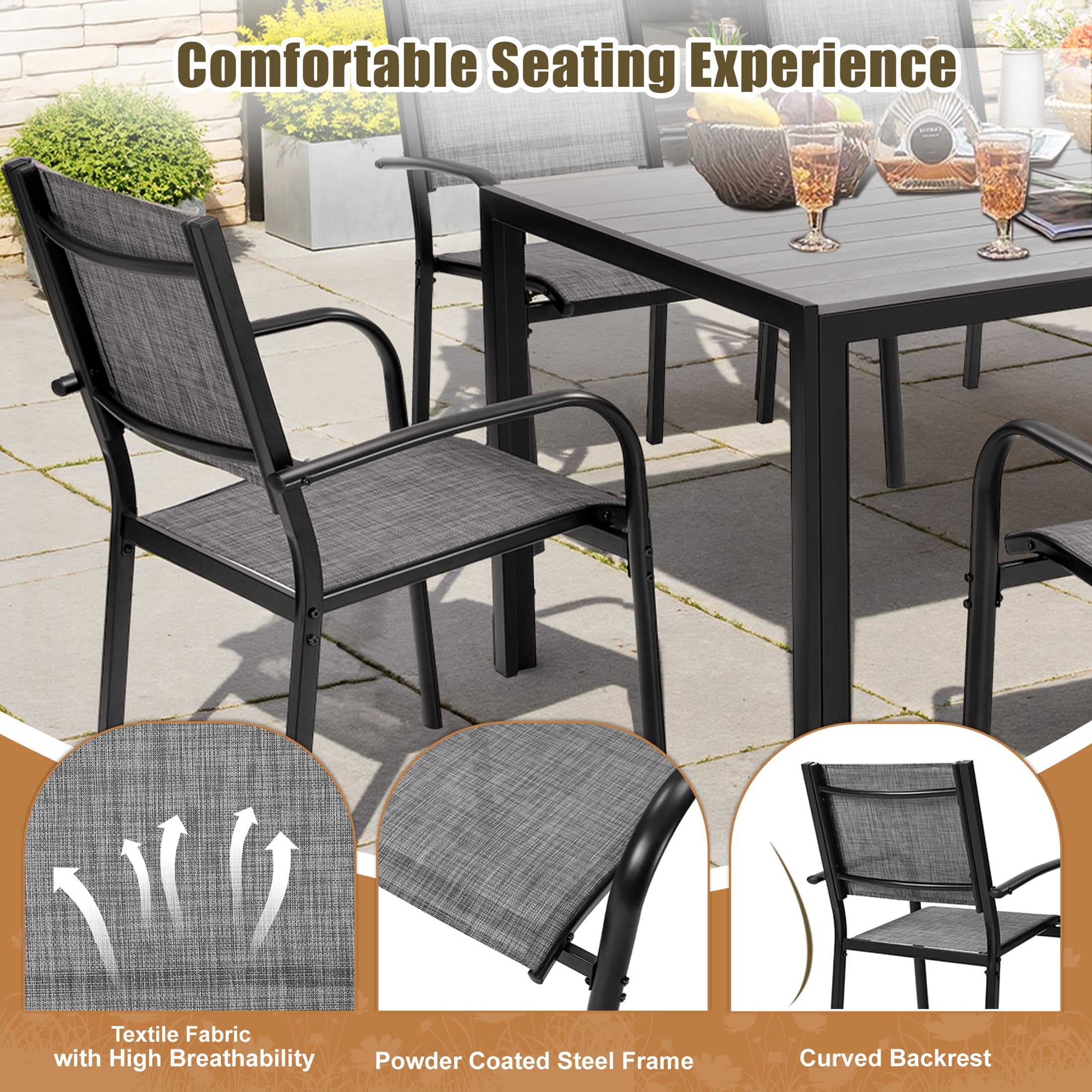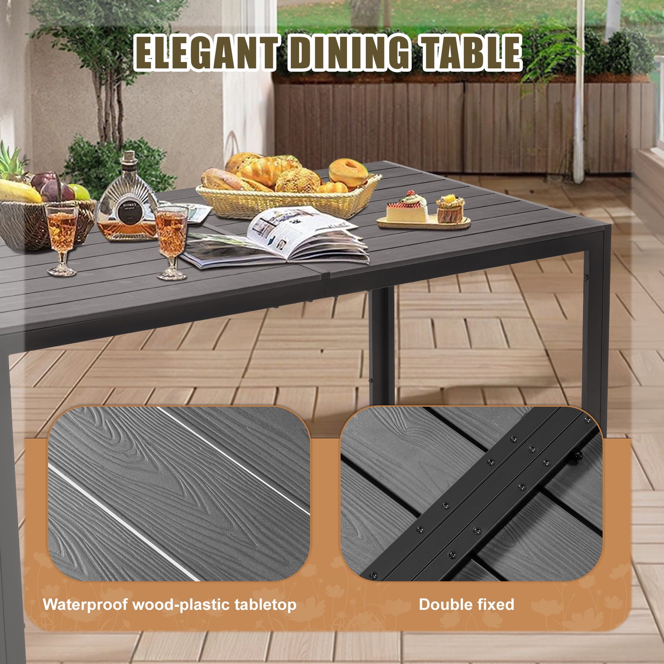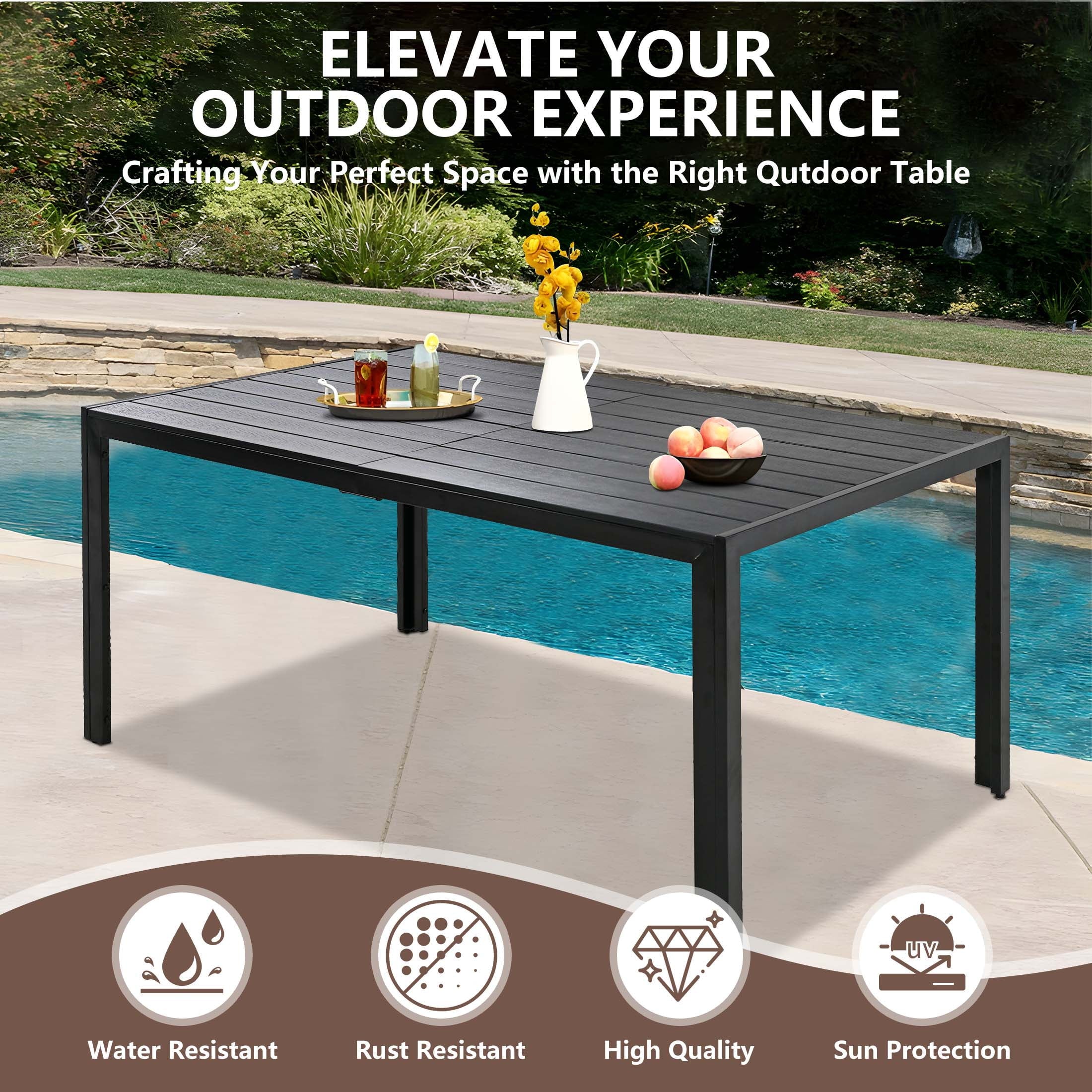 The outdoor dining set comes with a large dining table, provide enough space for dining or gathering. High-quality plastic wood is used for the tabletop to improve weight capacity and ensure safety. The exquisite design of textured stripes on the tabletop adds charm to your patio.
