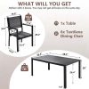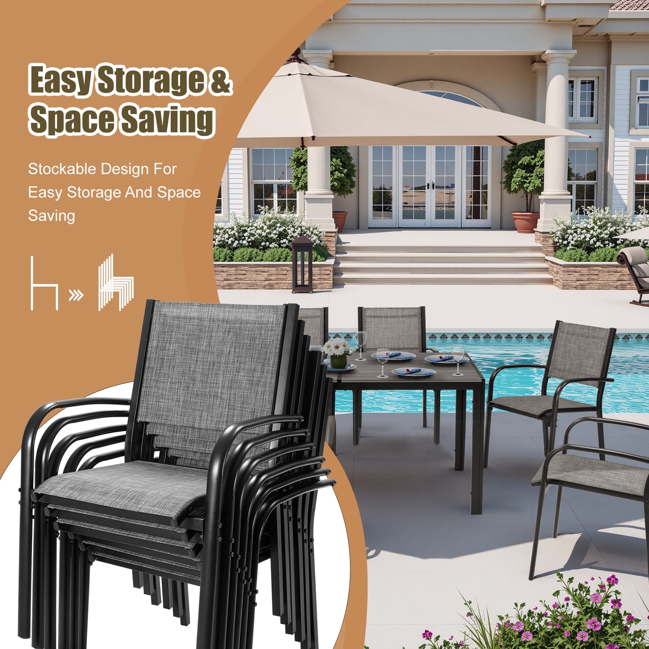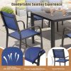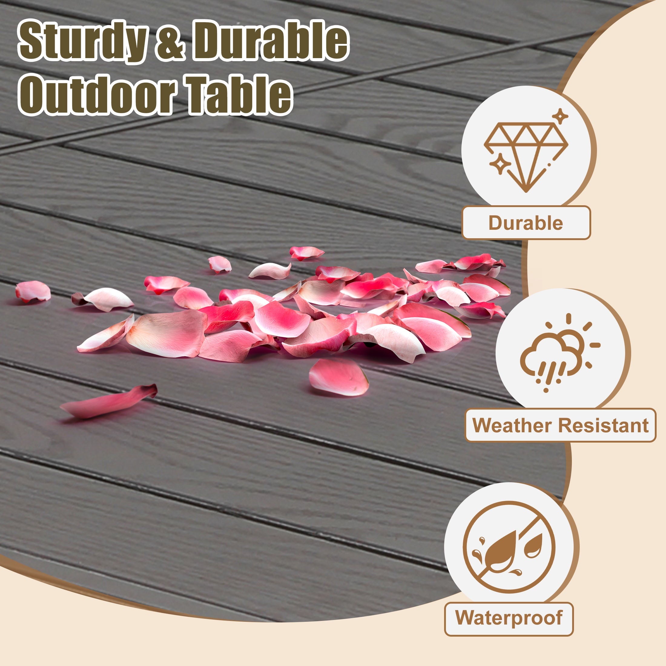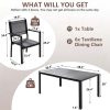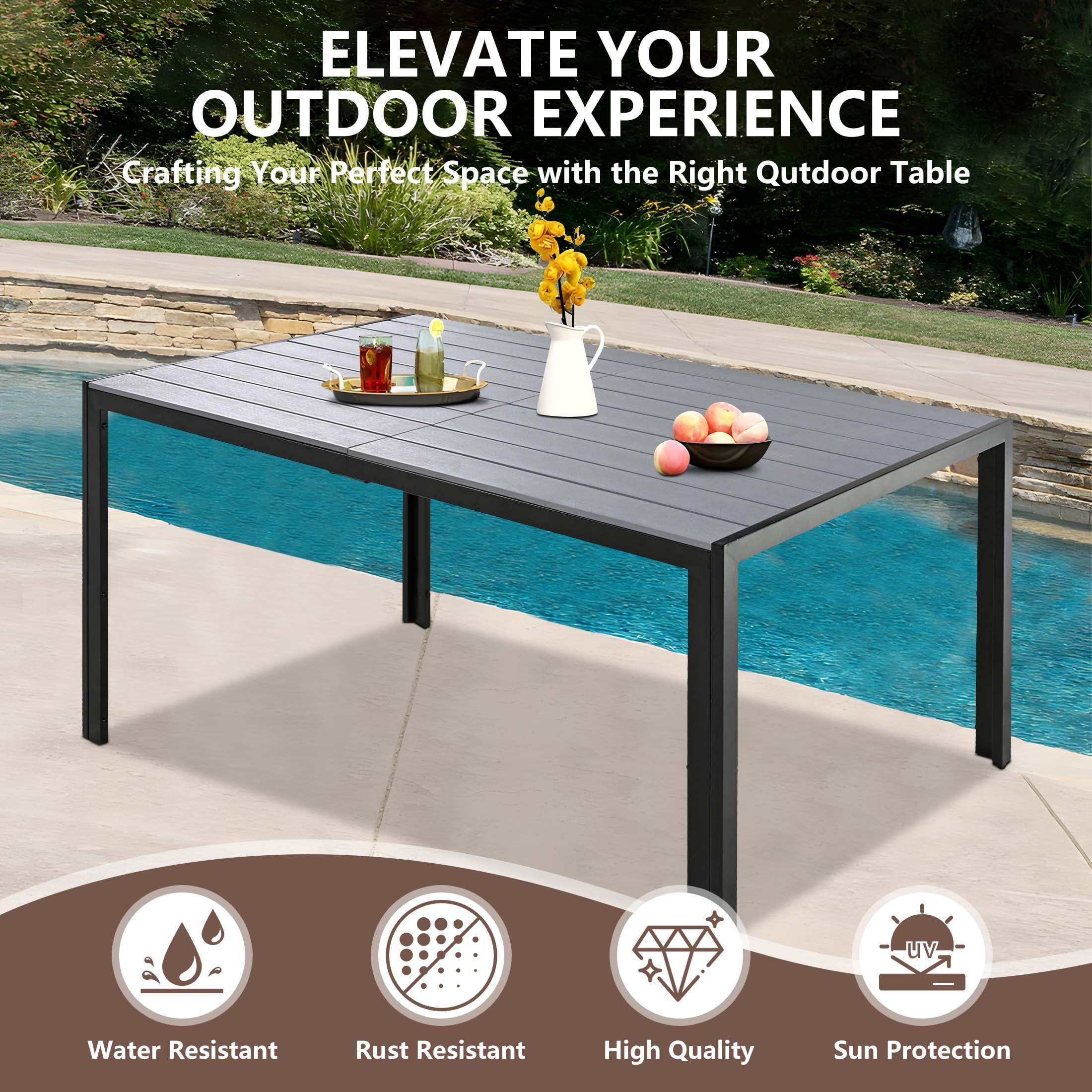 The outdoor dining set comes with a large dining table, provide enough space for dining or gathering. High-quality plastic wood is used for the tabletop to improve weight capacity and ensure safety. The exquisite design of textured stripes on the tabletop adds charm to your patio.