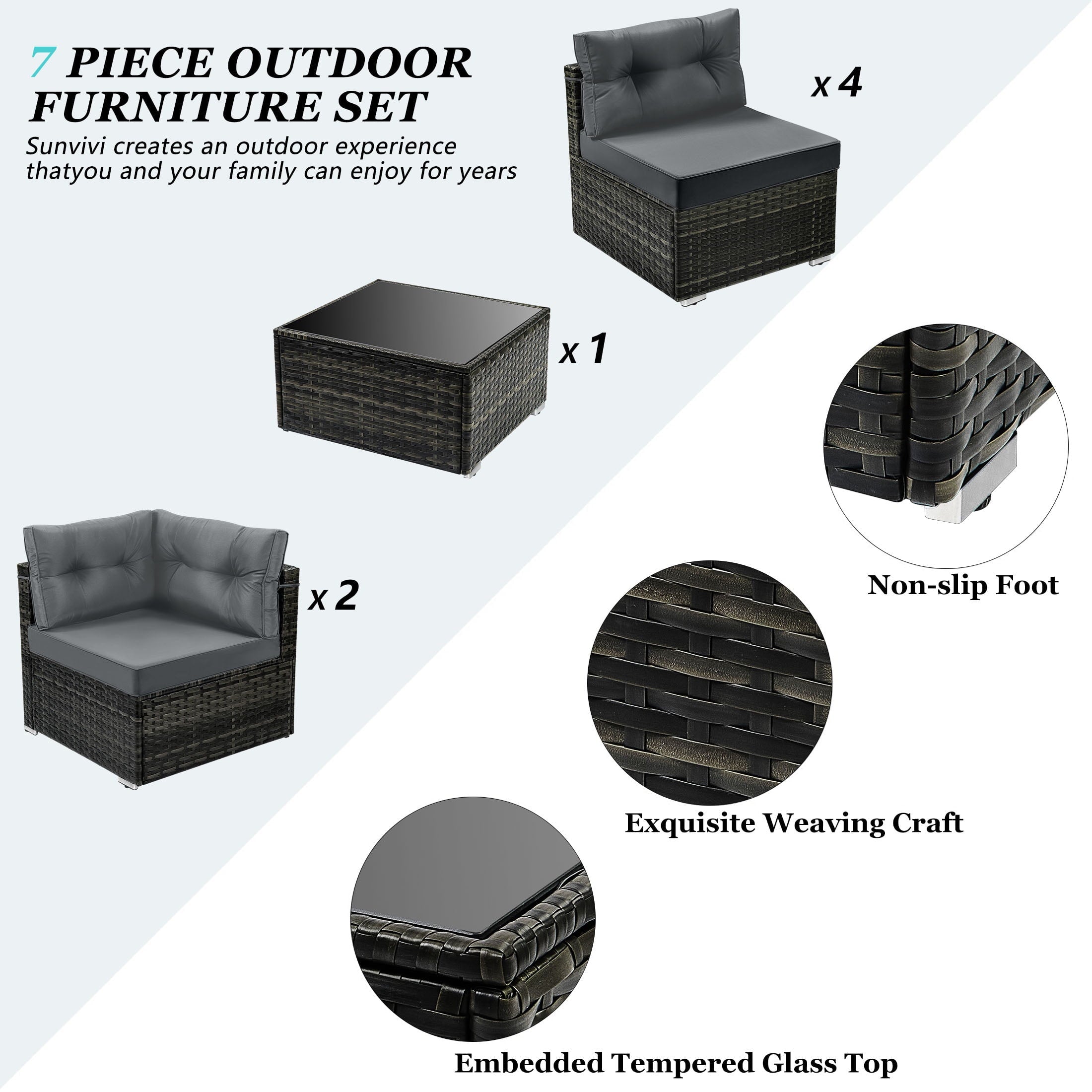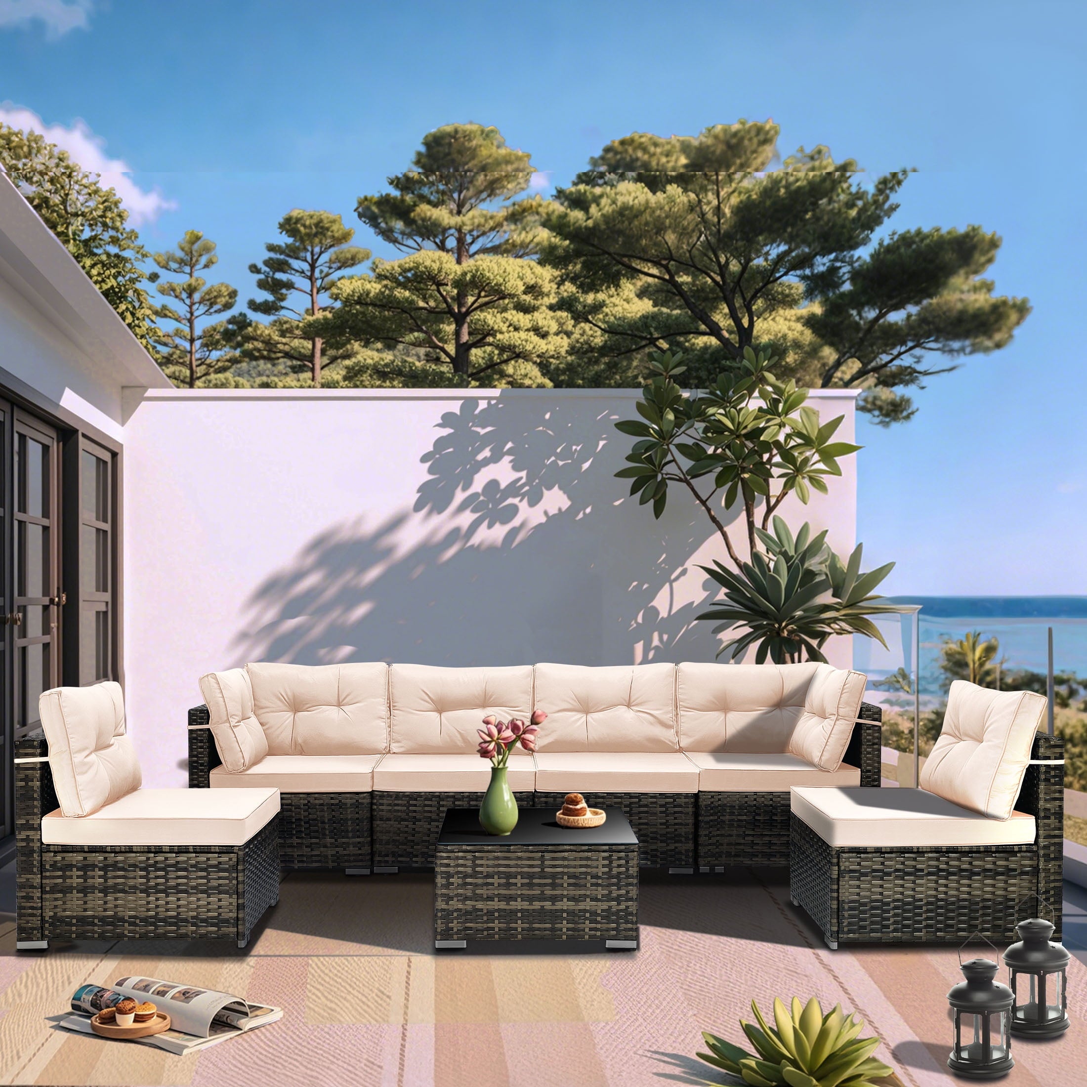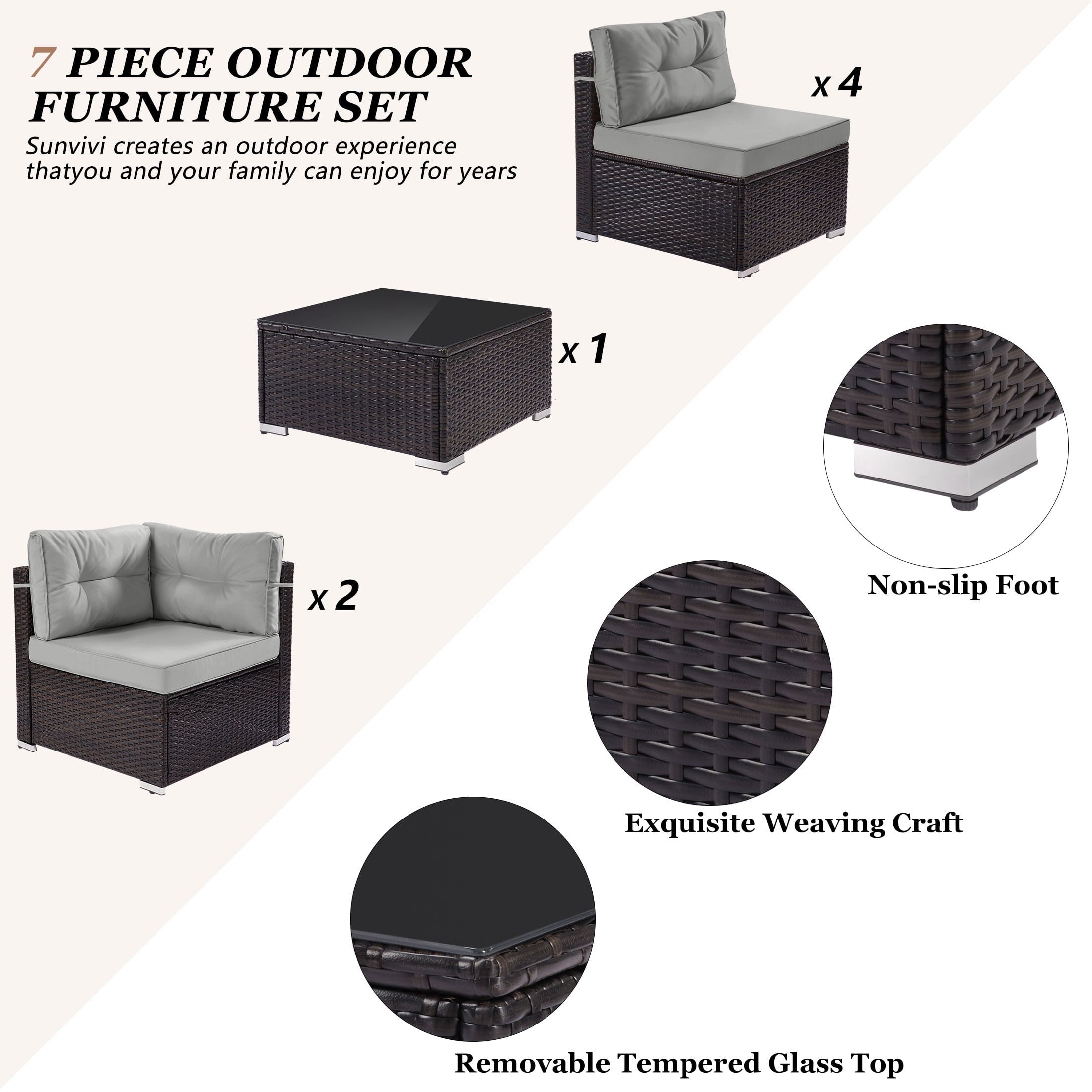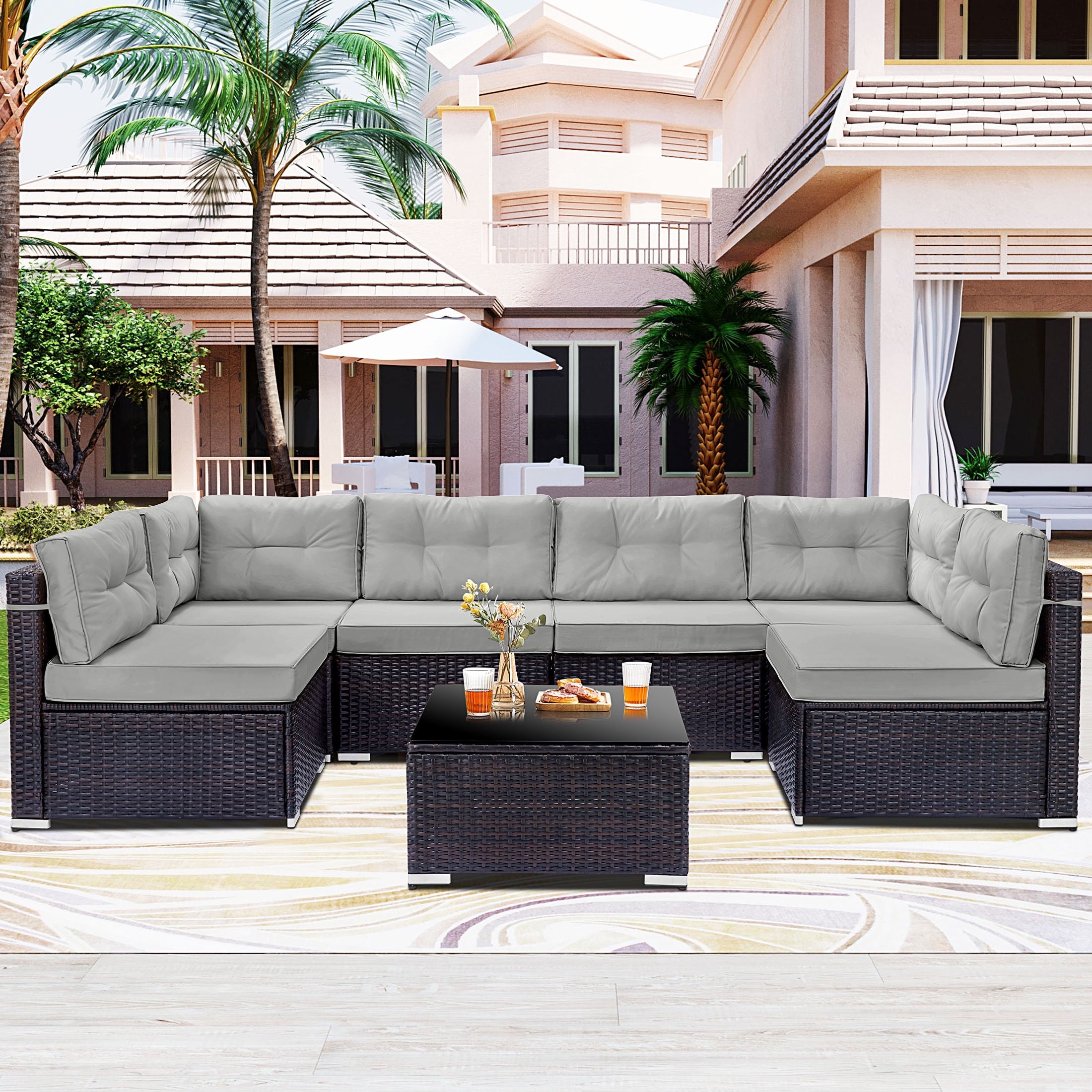 7 Piece Rattan Sectional Sofa Set with Cushions will be a good choice if you want to feel relaxed while eating lunch, reading a book or taking a nap. Our outdoor patio furniture set is designed for relaxation and parties. You can enjoy a coffee in the morning sun, tea after lunch and a beer at a party. Adopting high-quality PE rattan and iron frame that can last years to come. The thickened cushion for leaning, which can be easily removed and cleaned, provides you with the greatest degree of comfort. Properly using 7 components can combine different effects and takes you extraordinary experiences. Perfect for patio, garden, backyard, poolside, and balconies. You will like it so what are you still waiting for? We will lead you to experience unprecedented comfort and pleasure to be better at enjoying your leisure time.