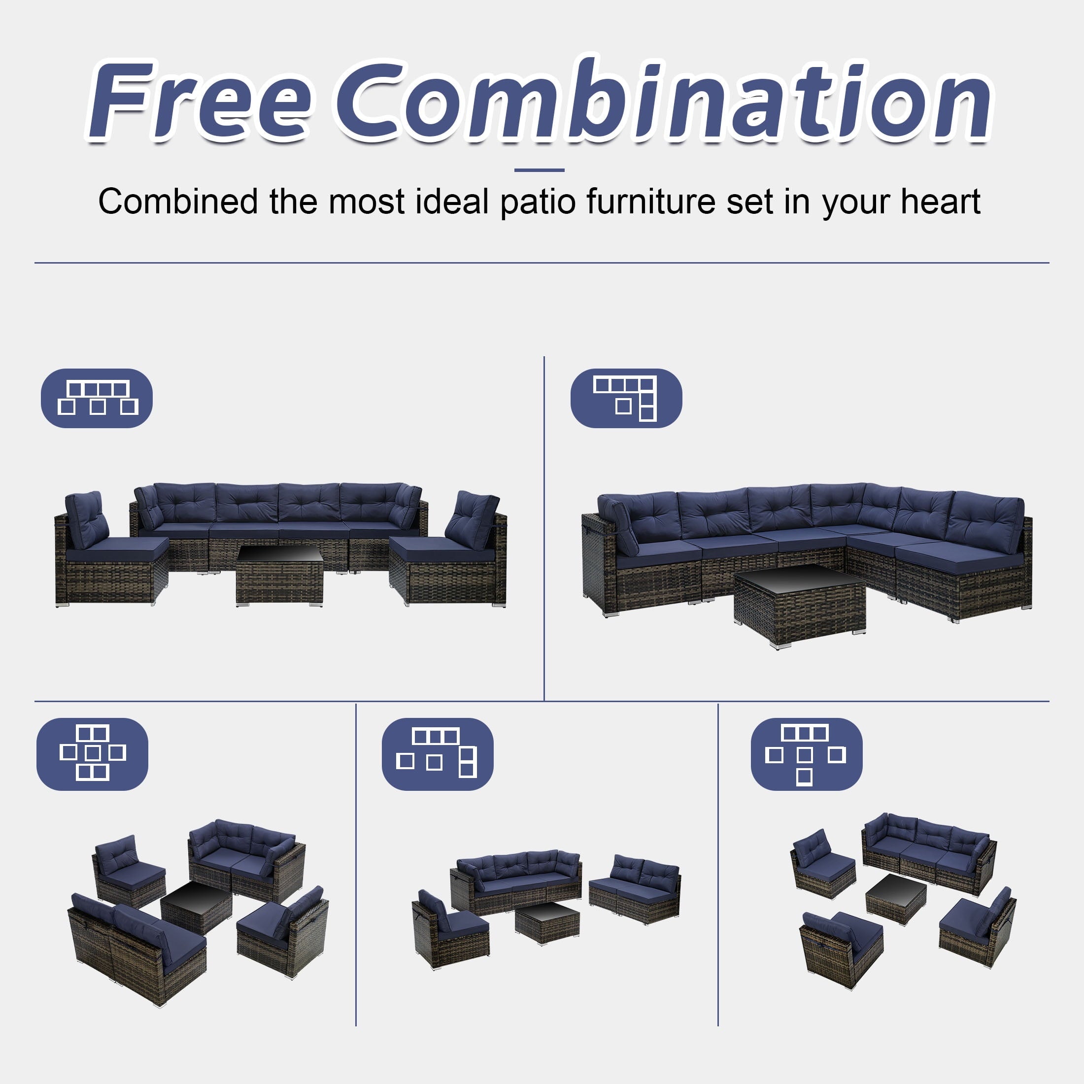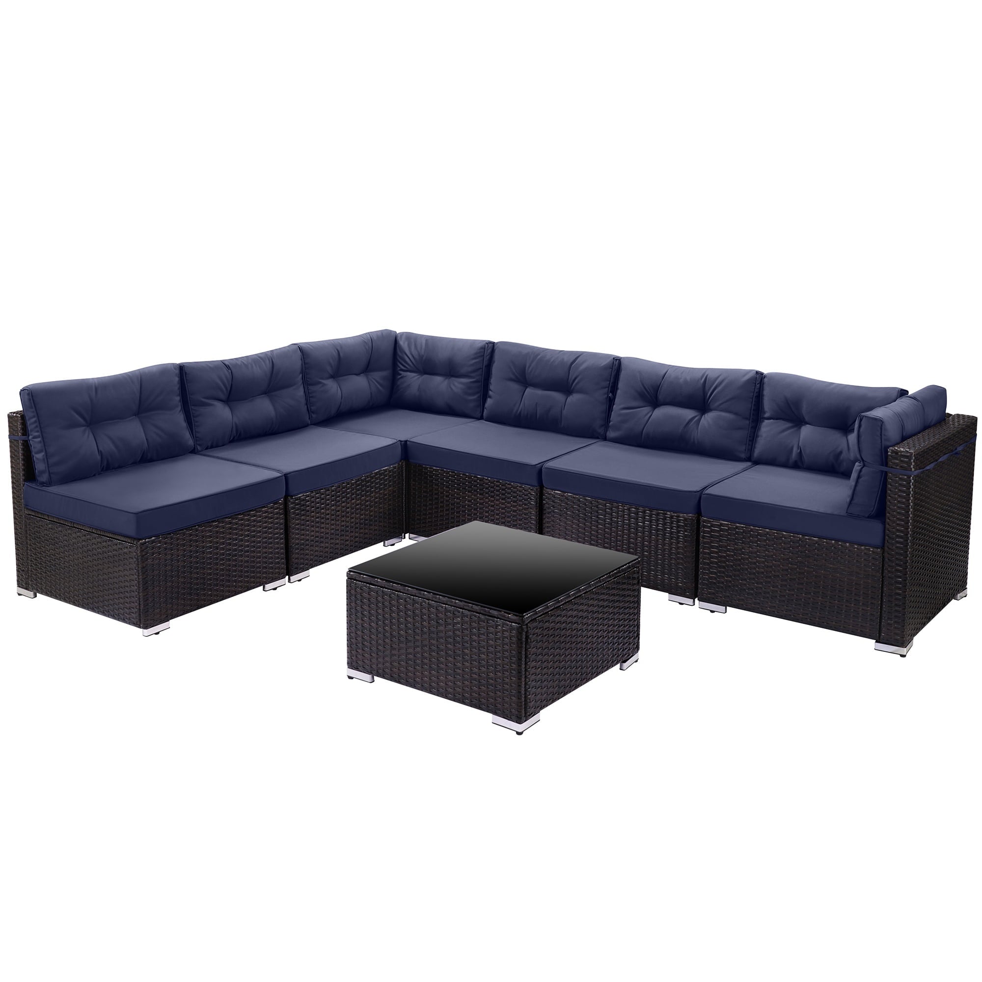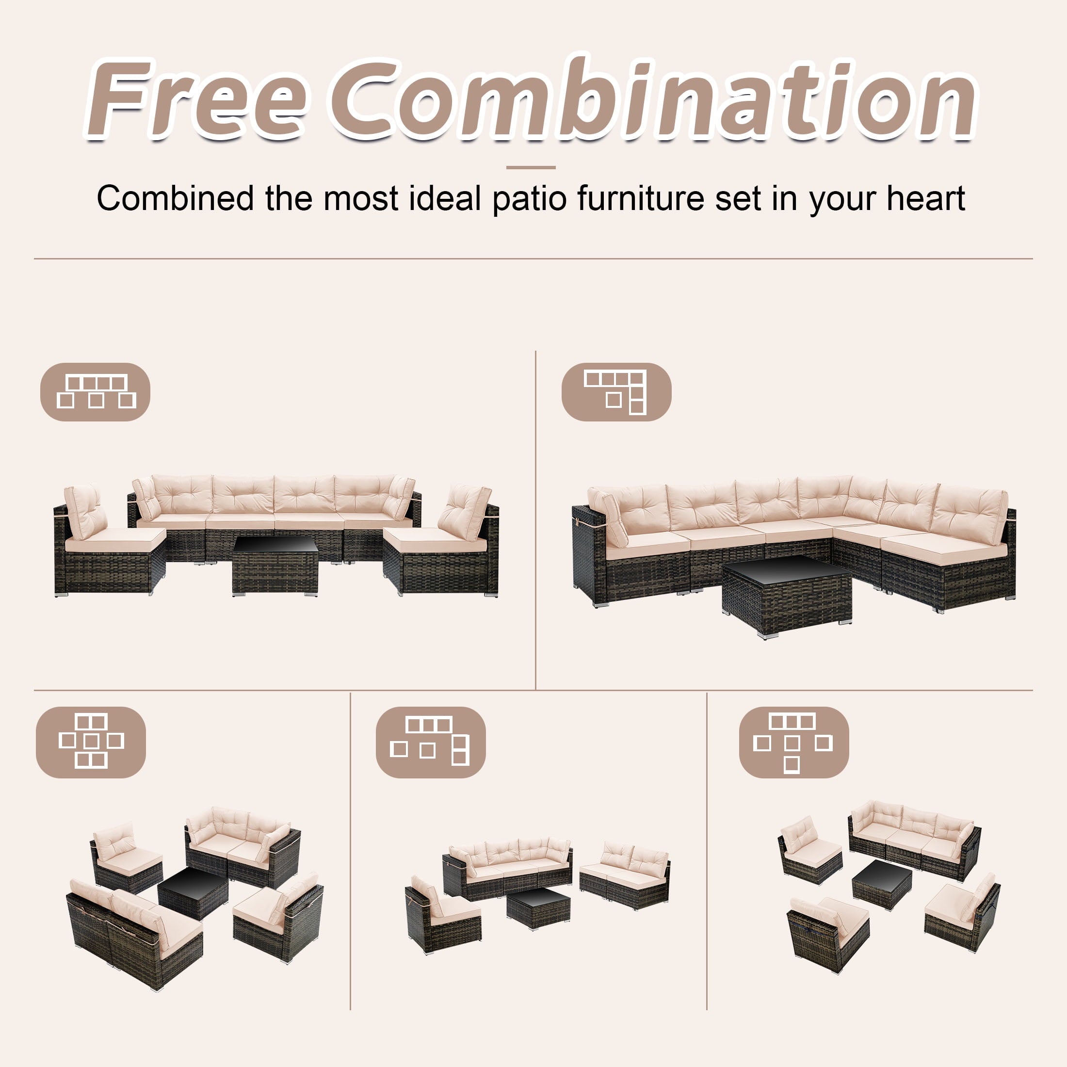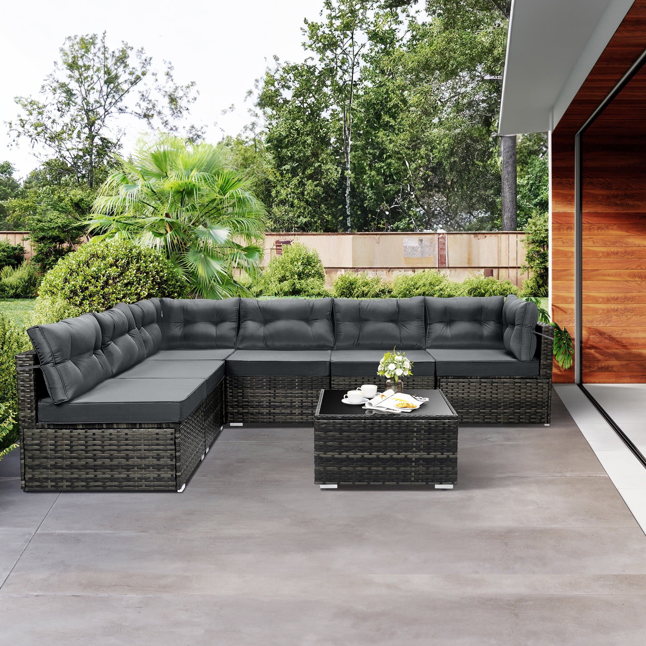 7 Piece Rattan Sectional Sofa Set with Cushions will be a good choice if you want to feel relaxed while eating lunch, reading a book or taking a nap. Our outdoor patio furniture set is designed for relaxation and parties. You can enjoy a coffee in the morning sun, tea after lunch and a beer at a party. Adopting high-quality PE rattan and iron frame that can last years to come. The thickened cushion for leaning, which can be easily removed and cleaned, provides you with the greatest degree of comfort. Properly using 7 components can combine different effects and takes you extraordinary experiences. Perfect for patio, garden, backyard, poolside, and balconies. You will like it so what are you still waiting for? We will lead you to experience unprecedented comfort and pleasure to be better at enjoying your leisure time.