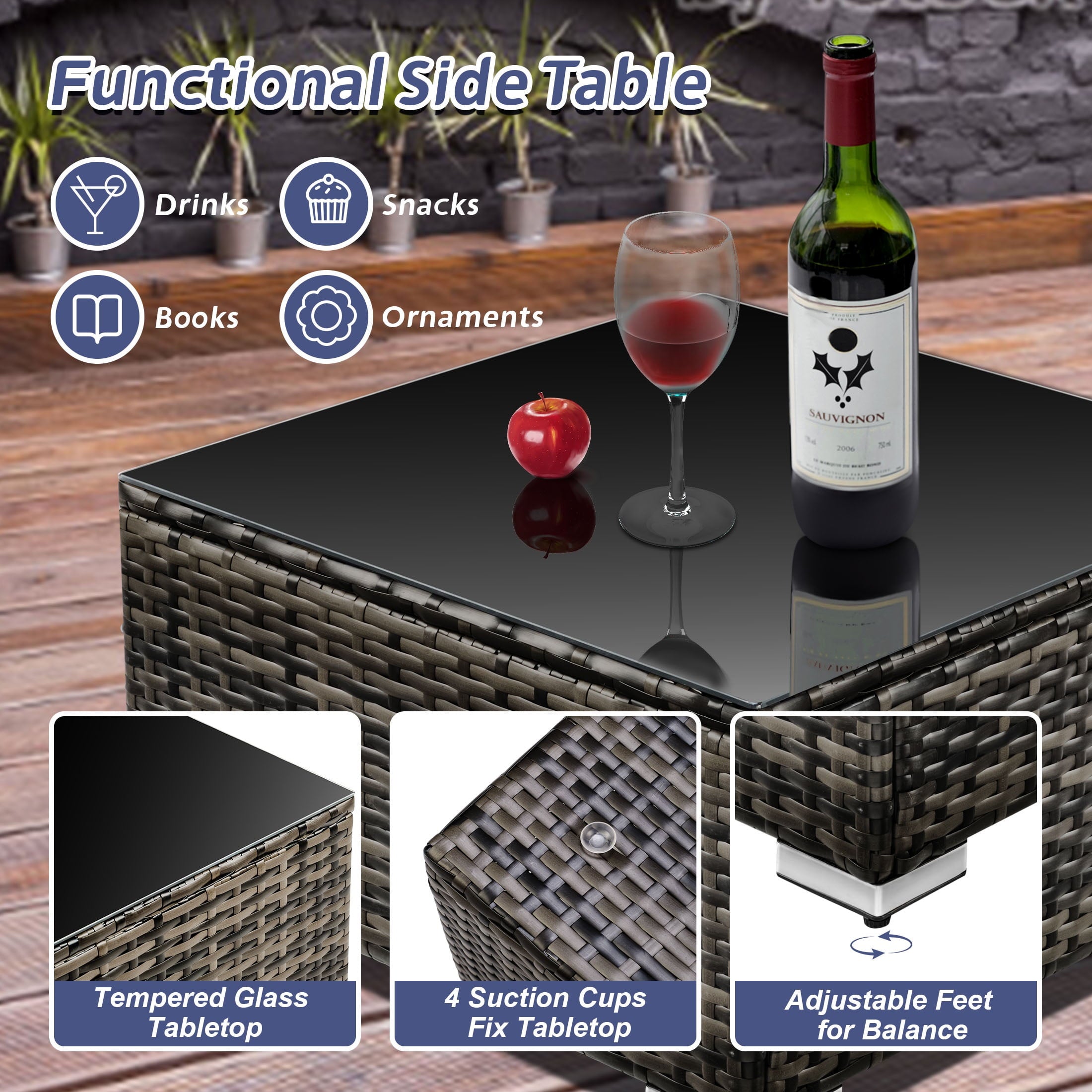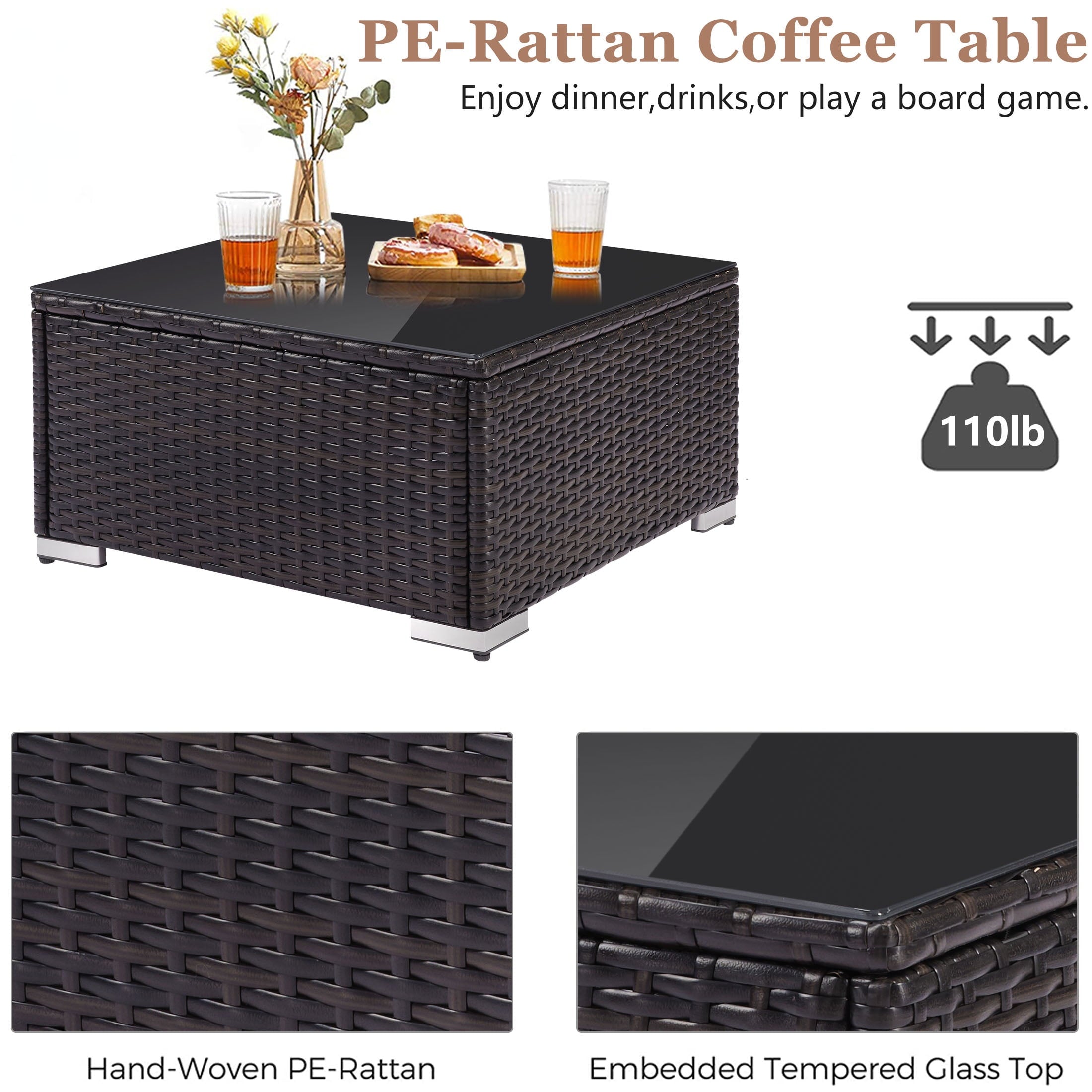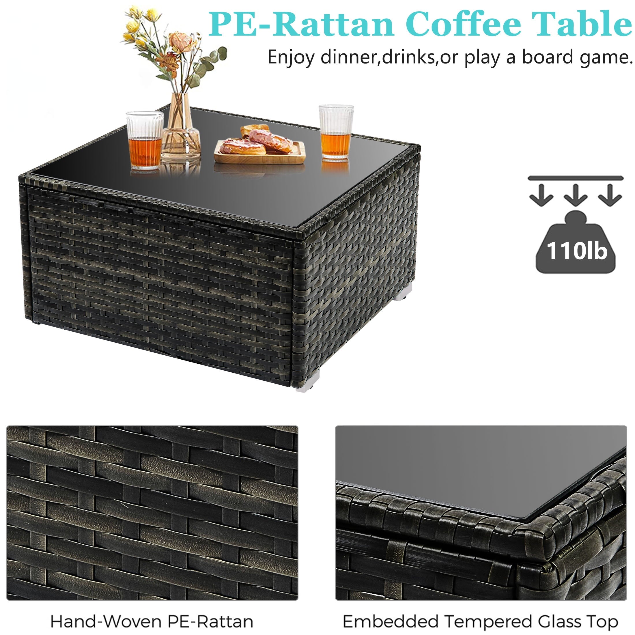 • [Elegant Tempered Glass Tabletop] – Center table comes with an easy-to-clean tempered glass top, making it a perfect surface for food and drinks, that greatly highlights your patio or poolside decor.