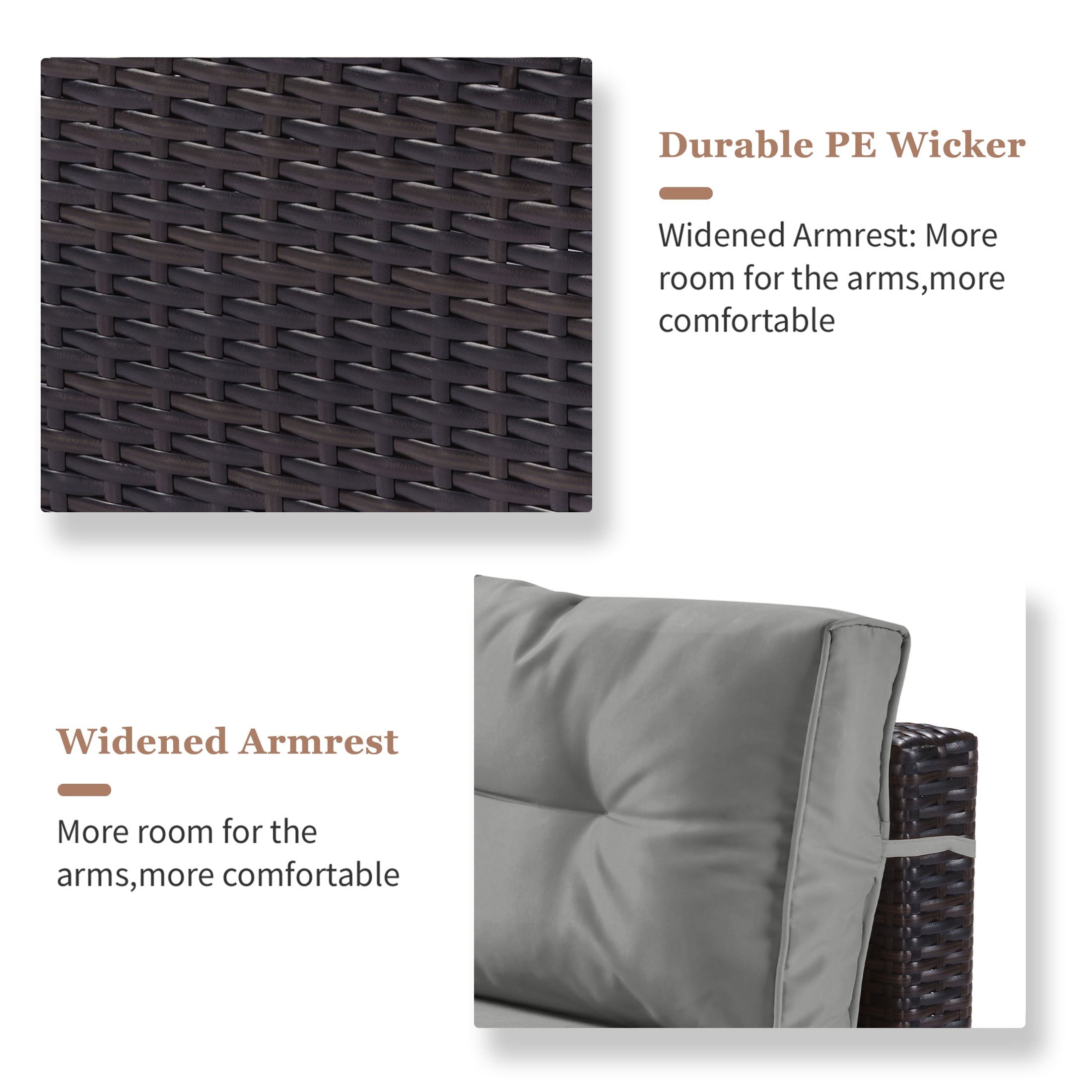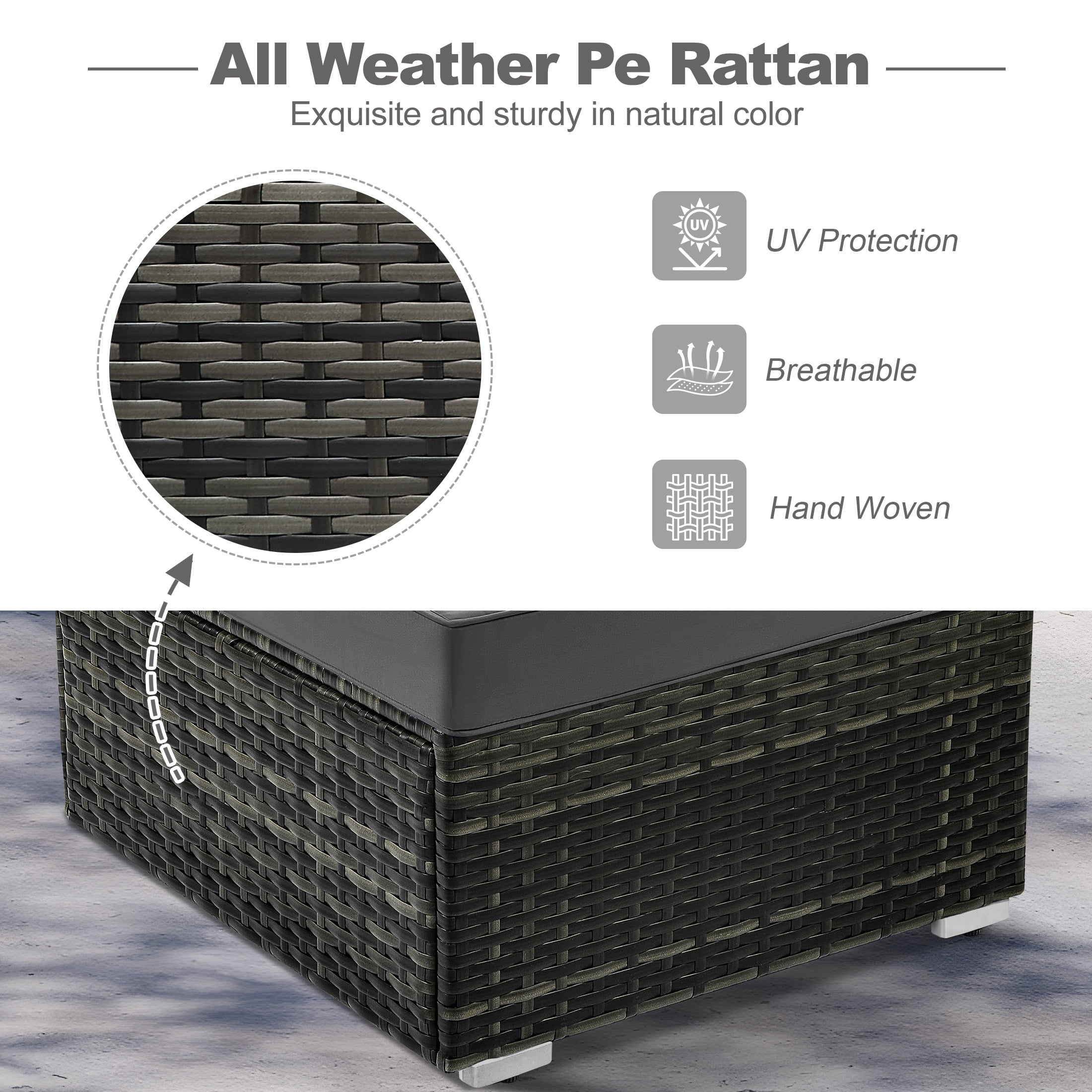 This rattan furniture is made of high-quality steel frames and PE rattan. All-weather-resistant synthetic resin is strong enough to withstand all weather variations.