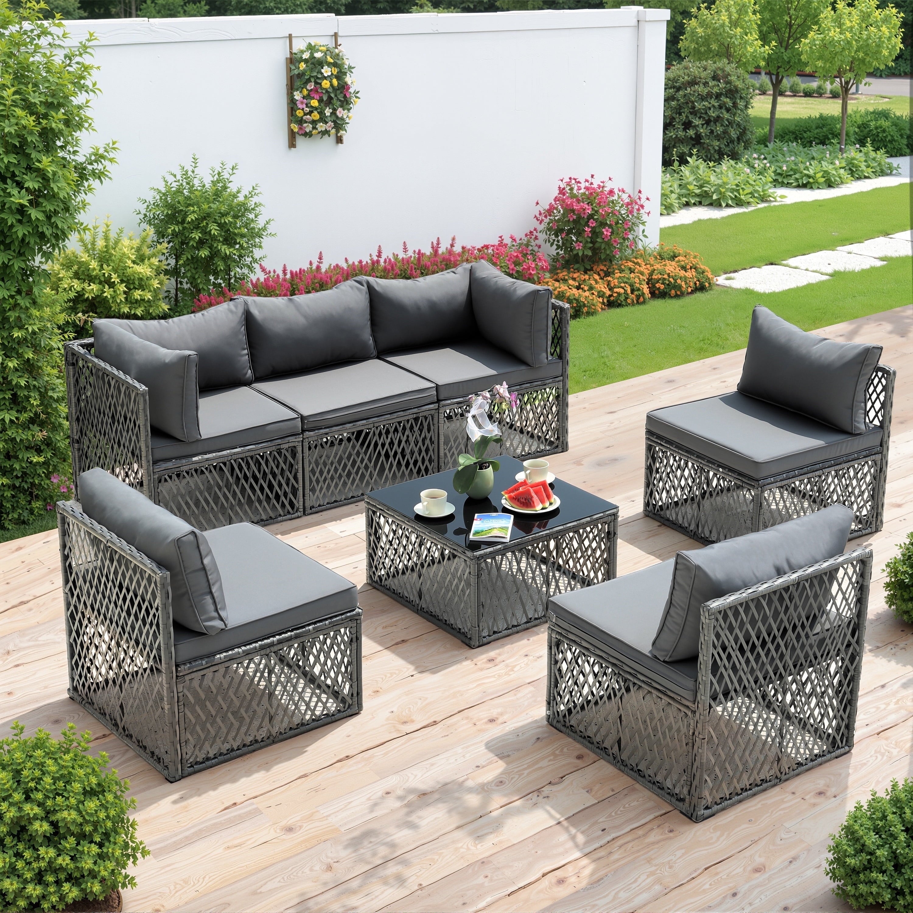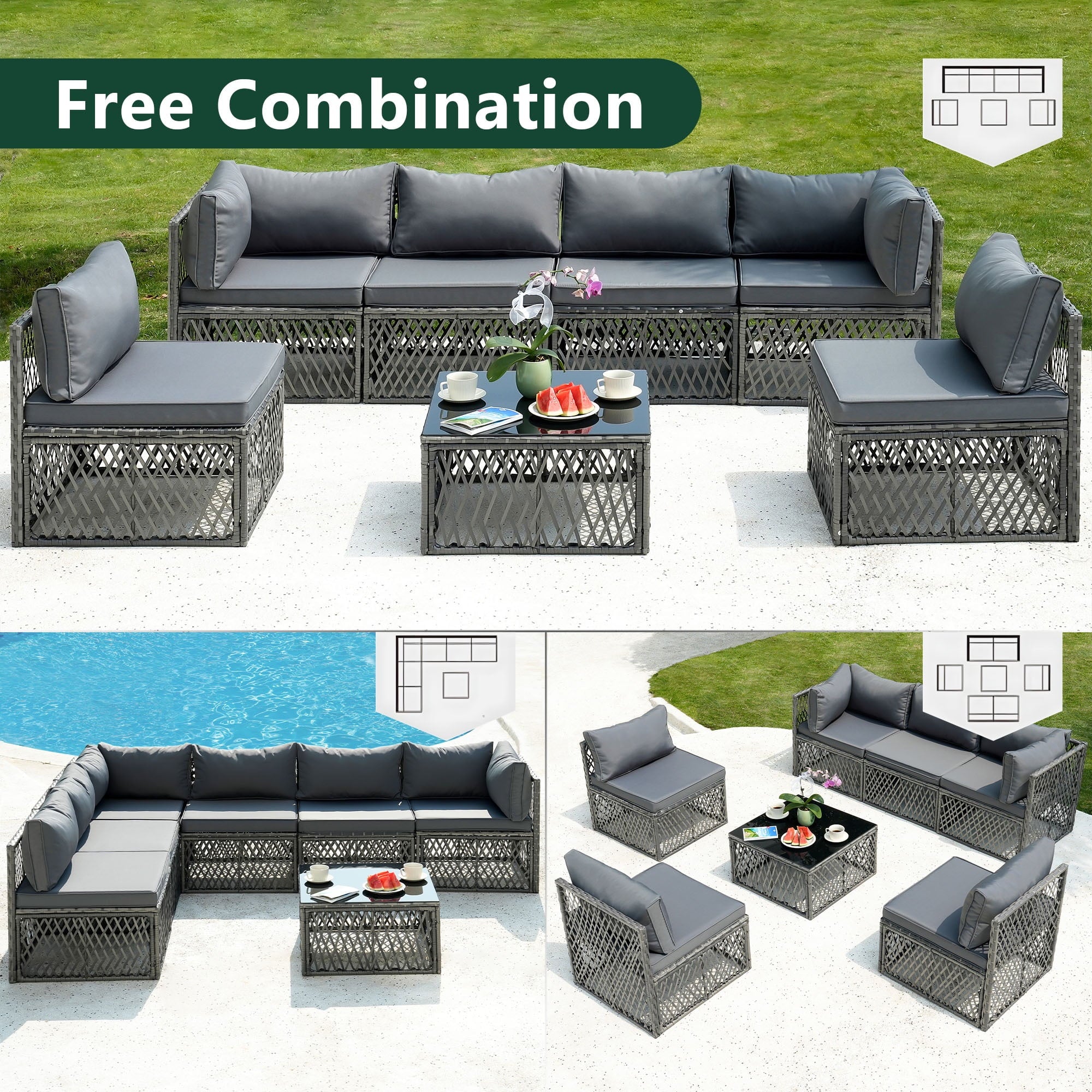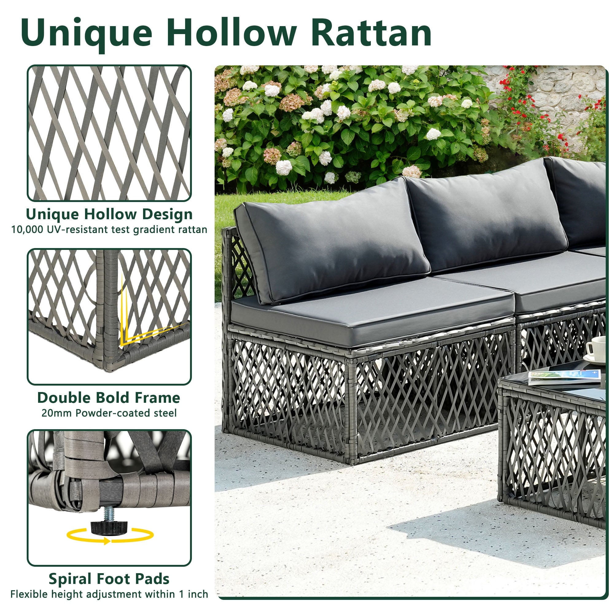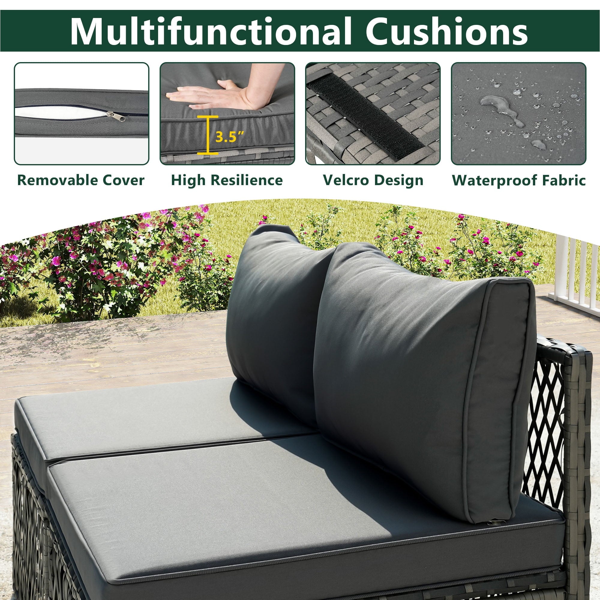 This set features nearly 4in thick seat and back cushions to say goodbye to stress and allow you and your guests to enjoy pure comfort. The modular sofa set can be freely adjusted in position and arrangement, allowing you to fully utilize the limited space in the courtyard, garden, poolside, and deck.