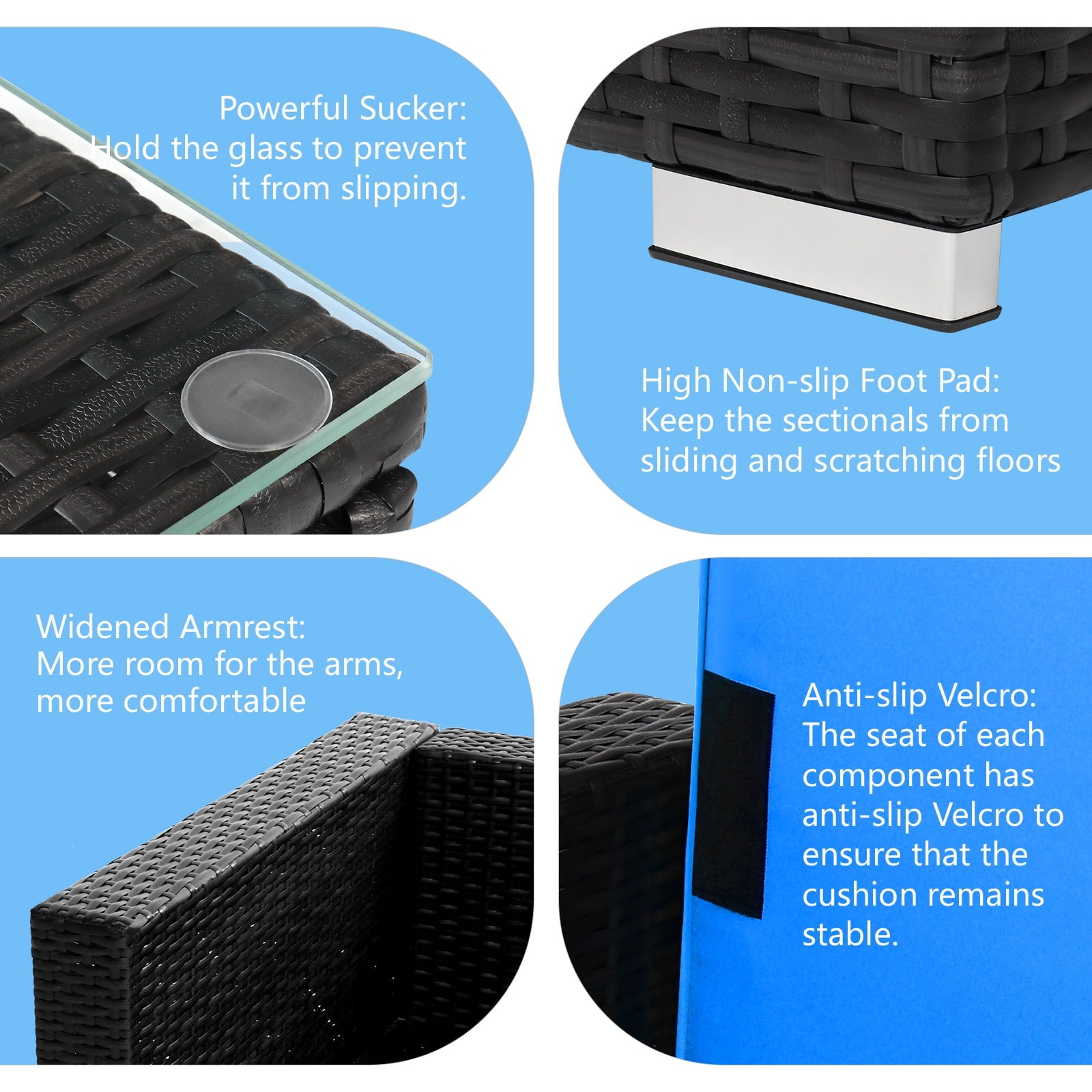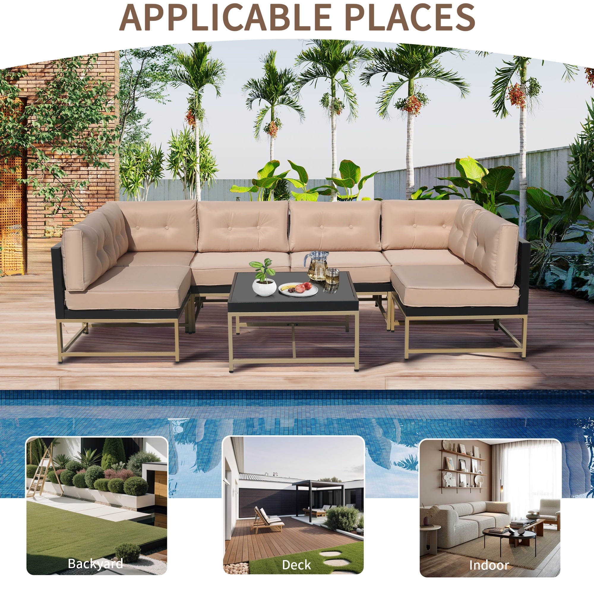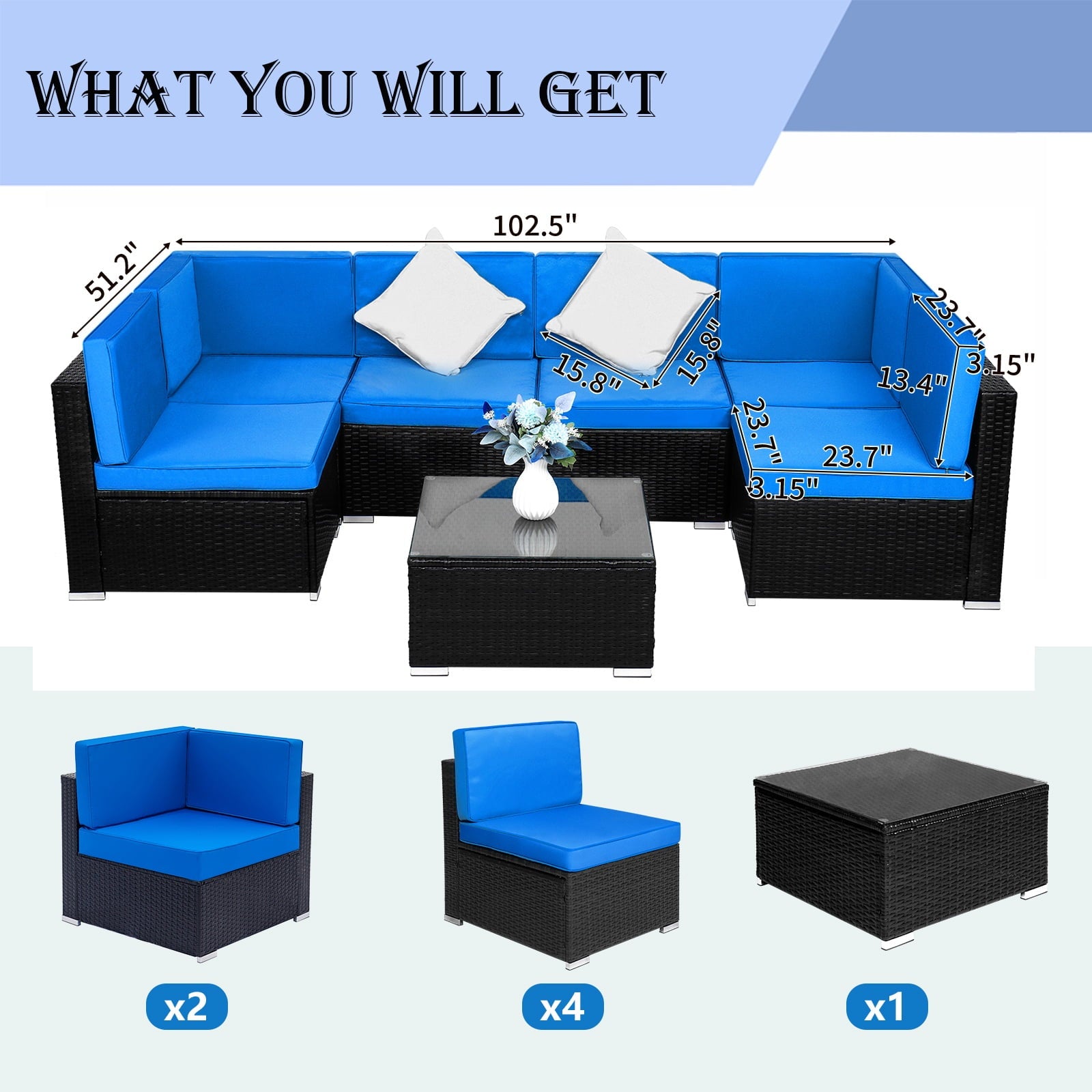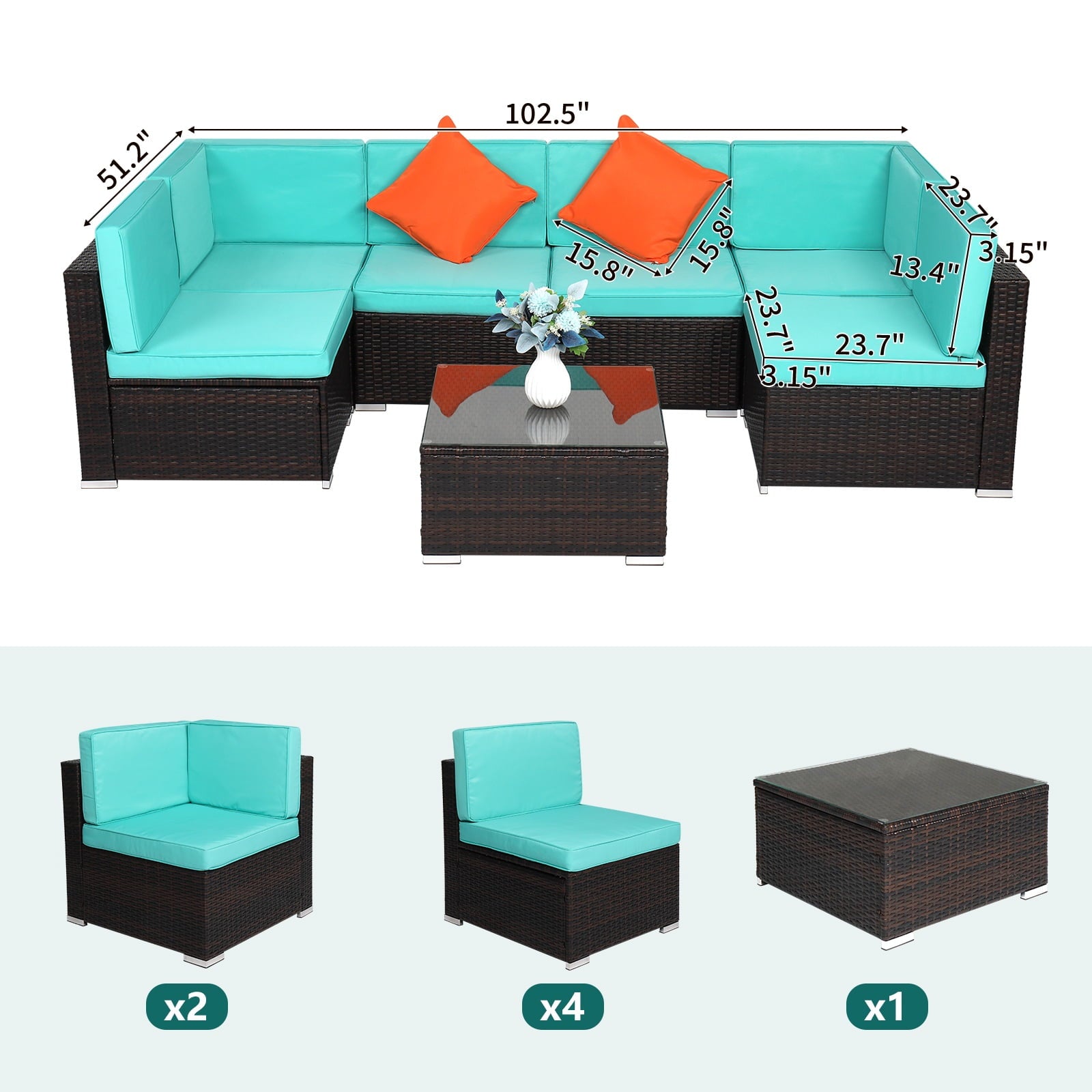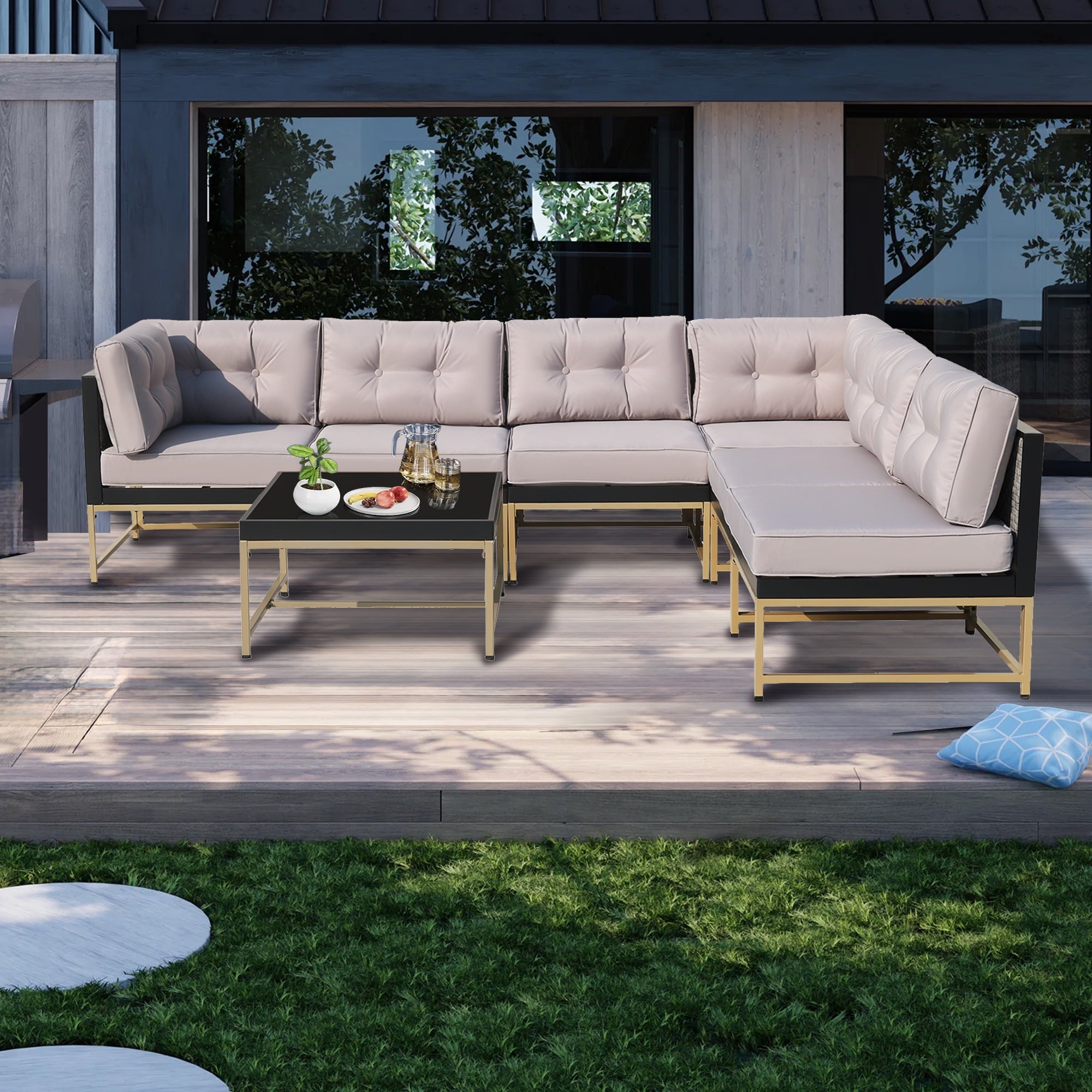 This set features nearly 4in thick seat and back cushions to say goodbye to stress and allow you and your guests to enjoy pure comfort. The modular sofa set can be freely adjusted in position and arrangement, allowing you to fully utilize the limited space in the courtyard, garden, poolside, and deck.