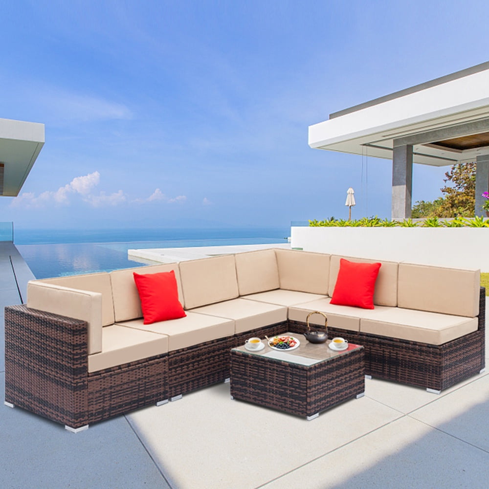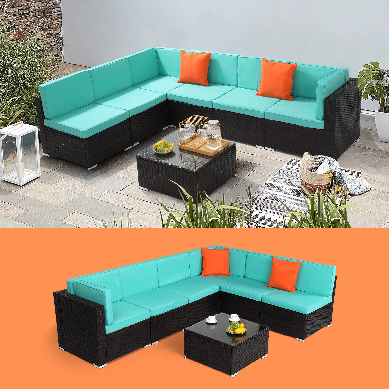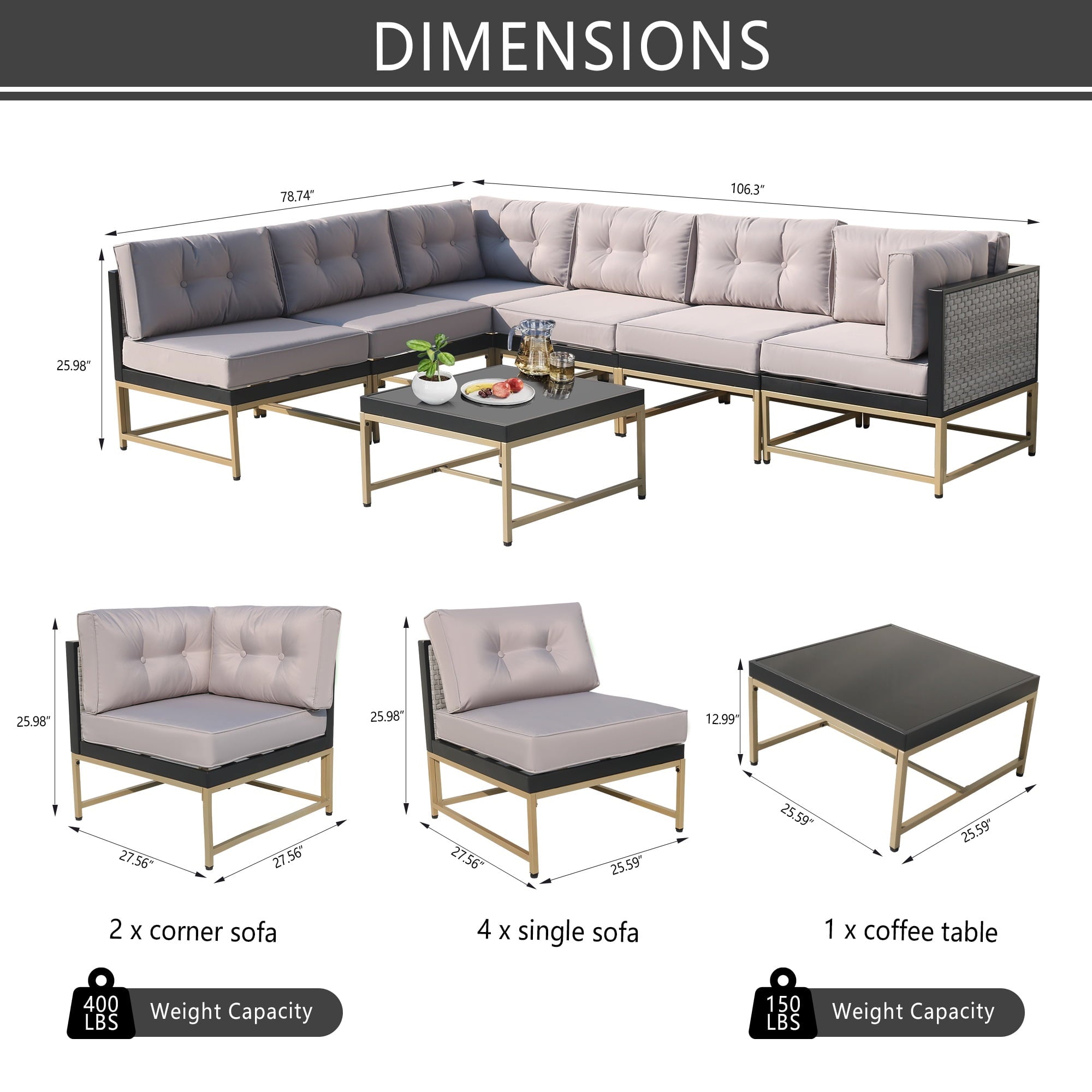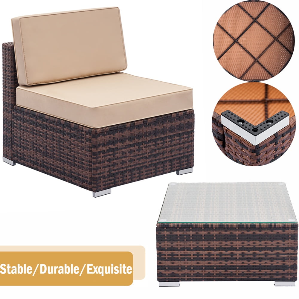 - 【MODULAR DESIGN】: This outdoor sectional sofa set includes 2 corner chairs, 4 armless chairs, and 1 glass-top coffee table that offer flexibility and many layout combinations. The sectional seats connect to each other with a connector clip so they will not separate. Weight Capacity: 400 lbs.