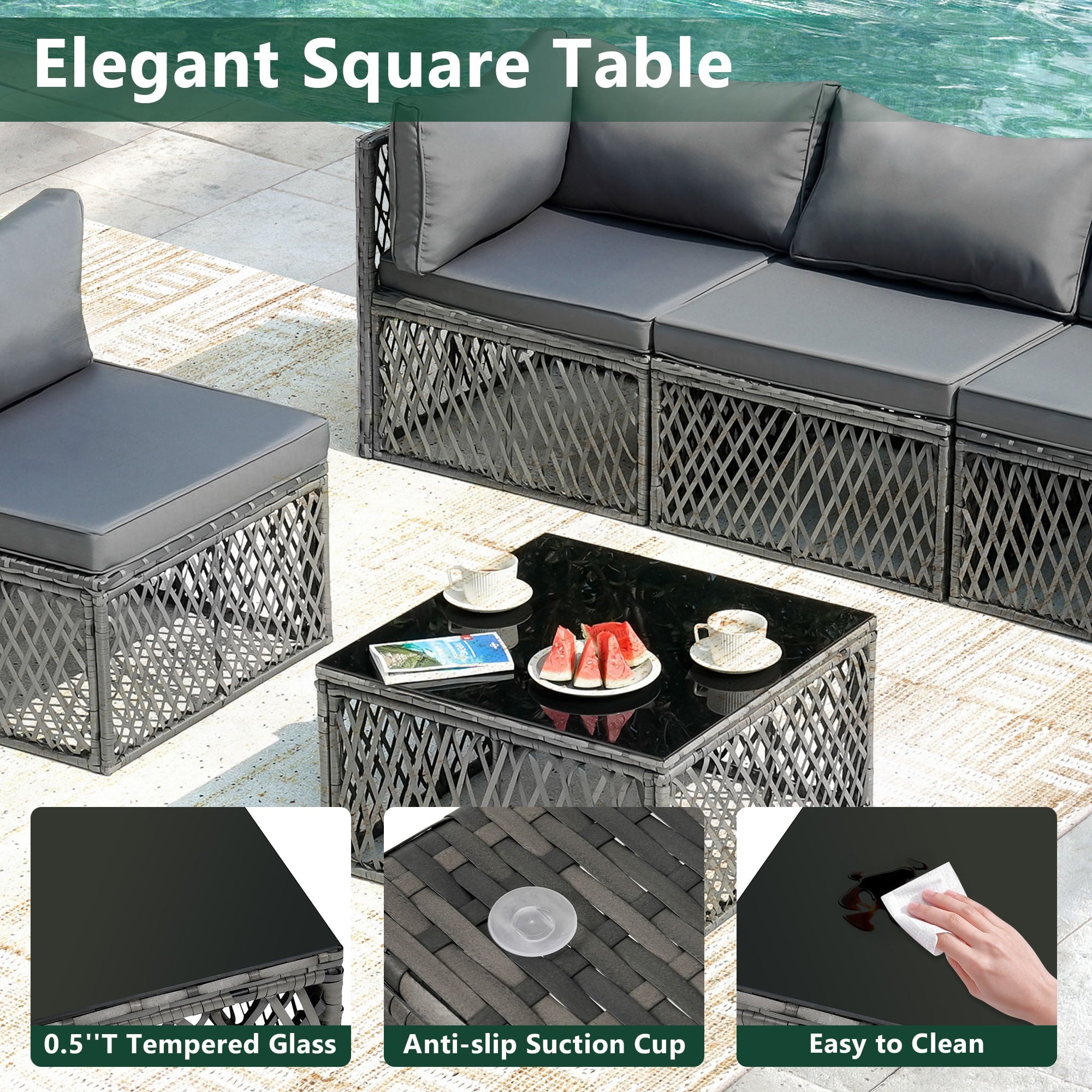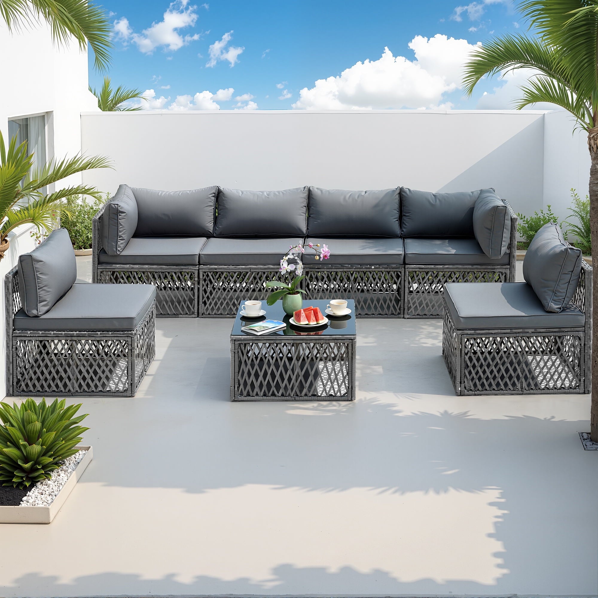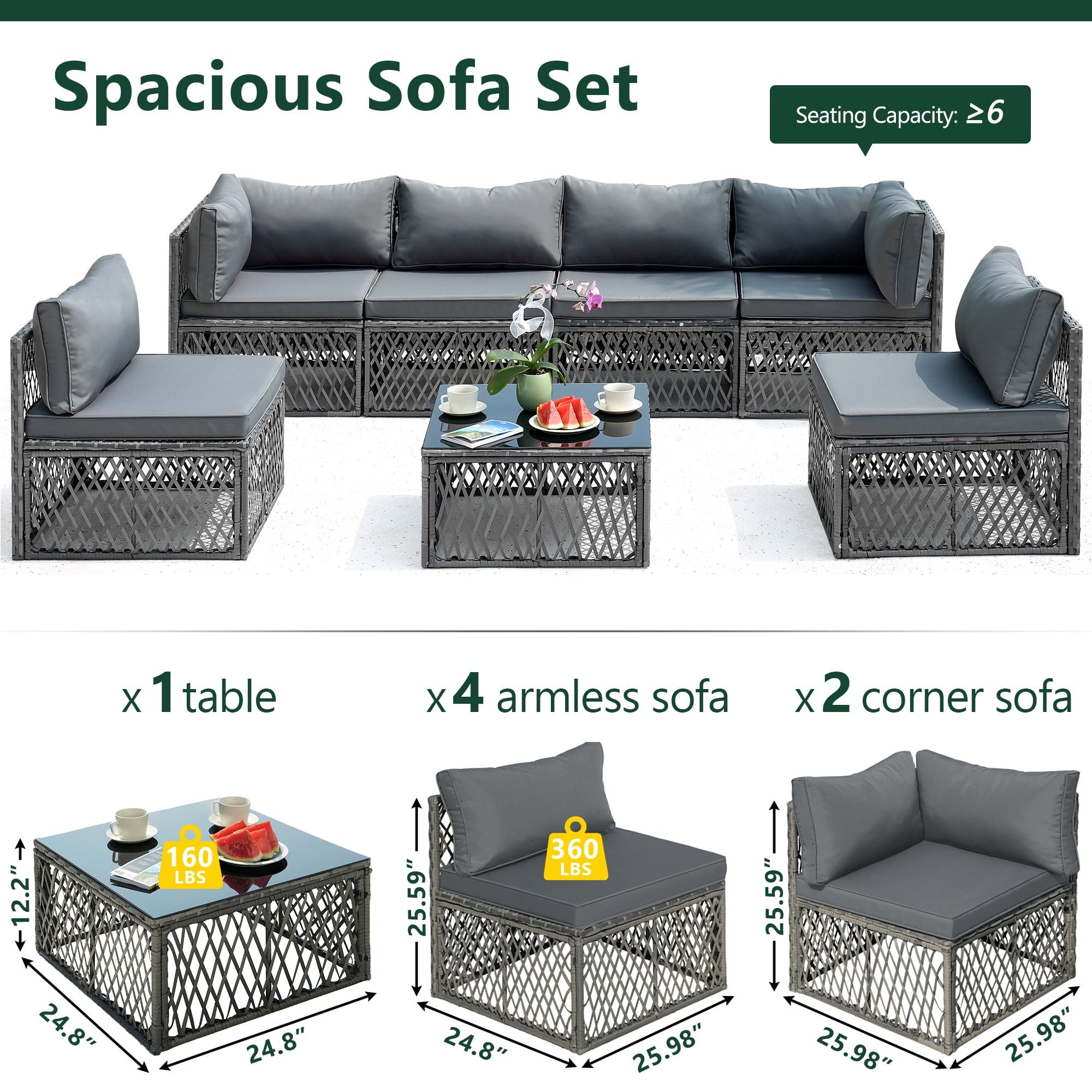 - 【MODULAR DESIGN】: This outdoor sectional sofa set includes 2 corner chairs, 4 armless chairs, and 1 glass-top coffee table that offer flexibility and many layout combinations. The sectional seats connect to each other with a connector clip so they will not separate. Weight Capacity: 400 lbs.