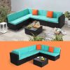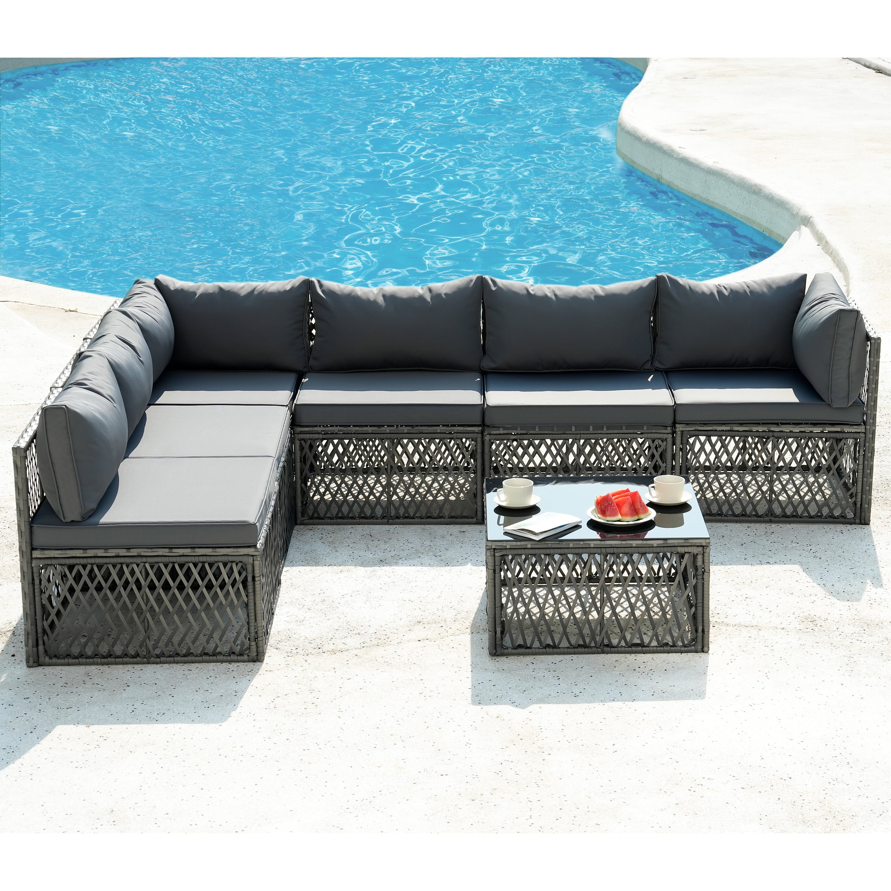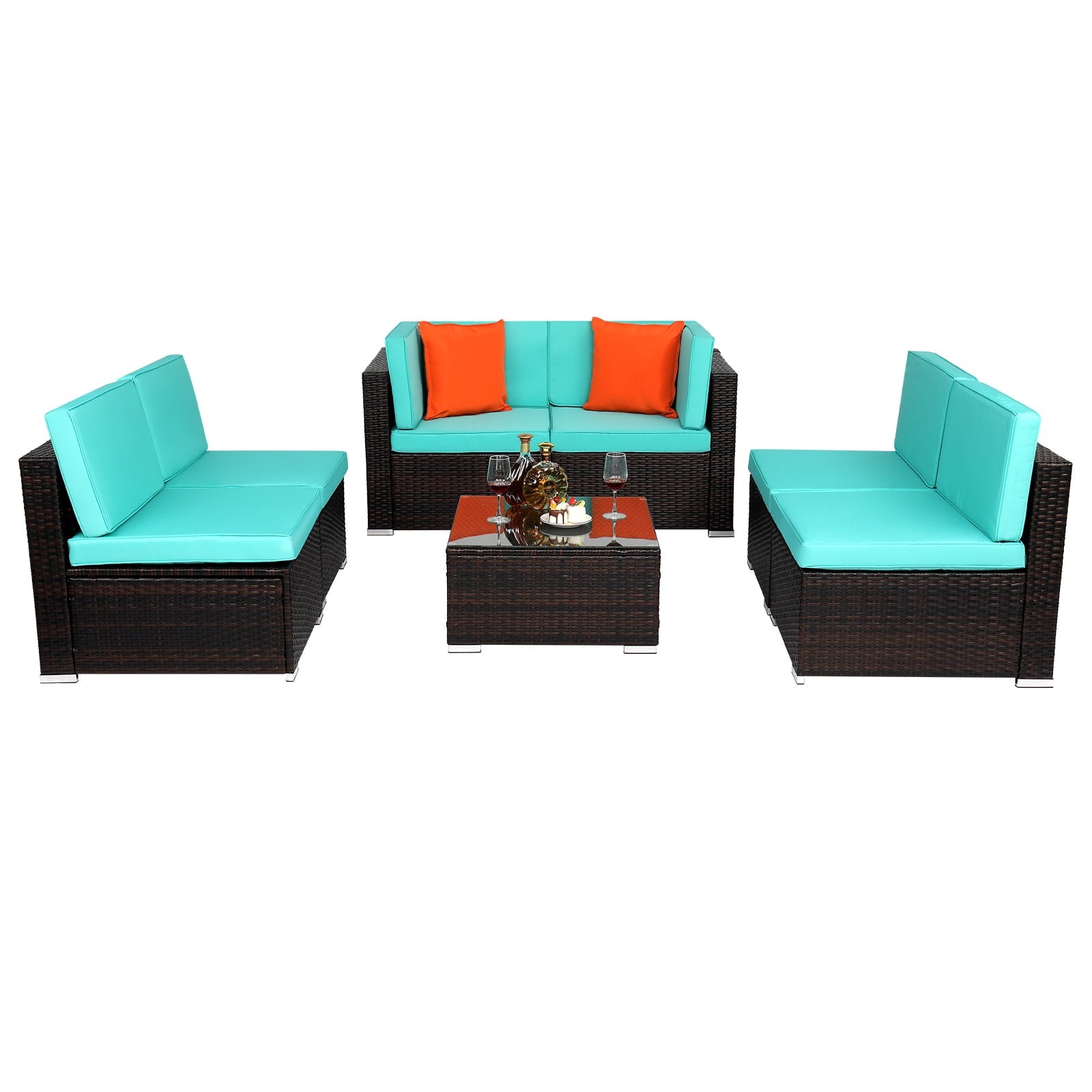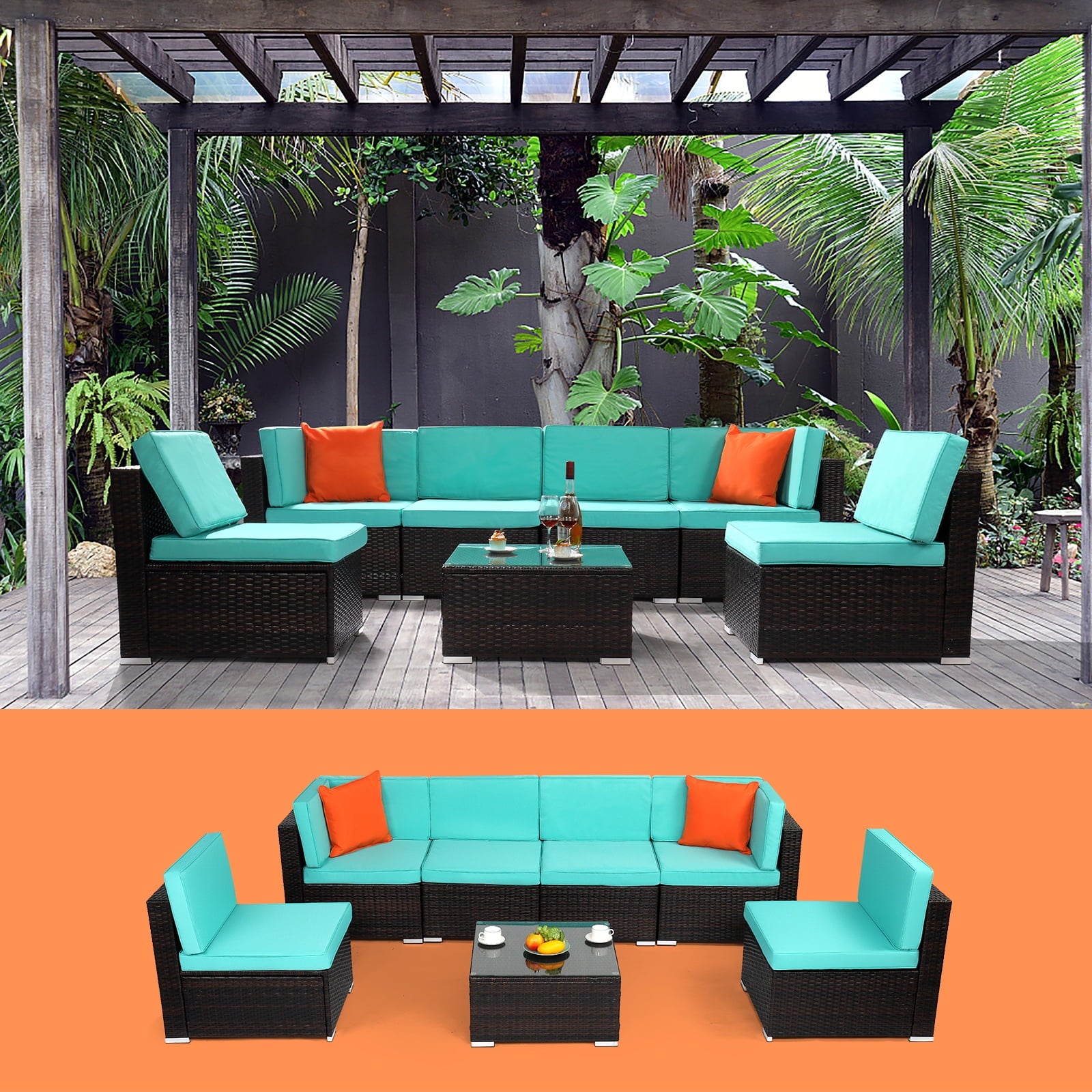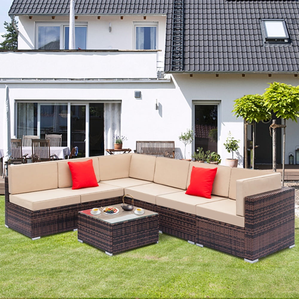 - 【MODULAR DESIGN】: This outdoor sectional sofa set includes 2 corner chairs, 4 armless chairs, and 1 glass-top coffee table that offer flexibility and many layout combinations. The sectional seats connect to each other with a connector clip so they will not separate. Weight Capacity: 400 lbs.