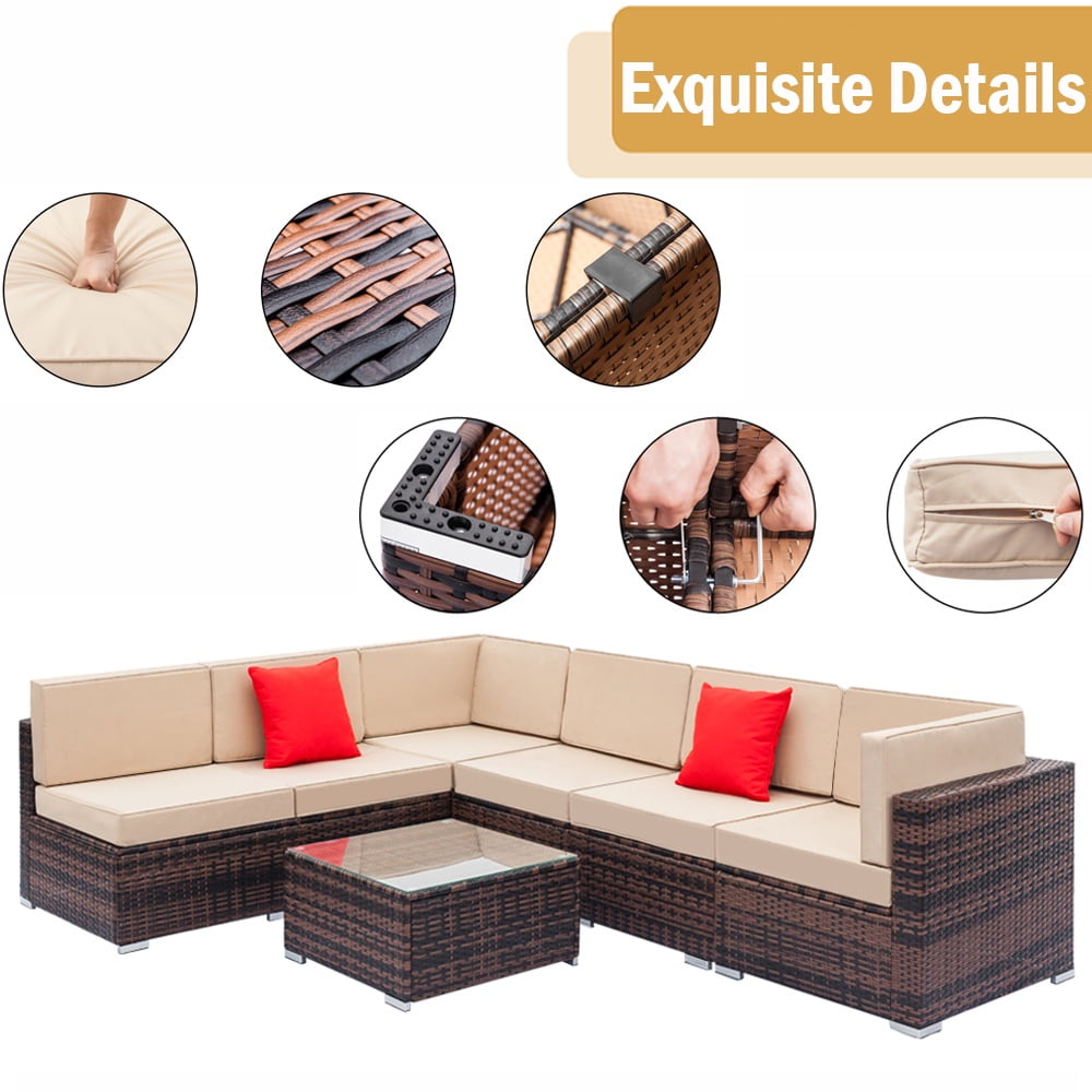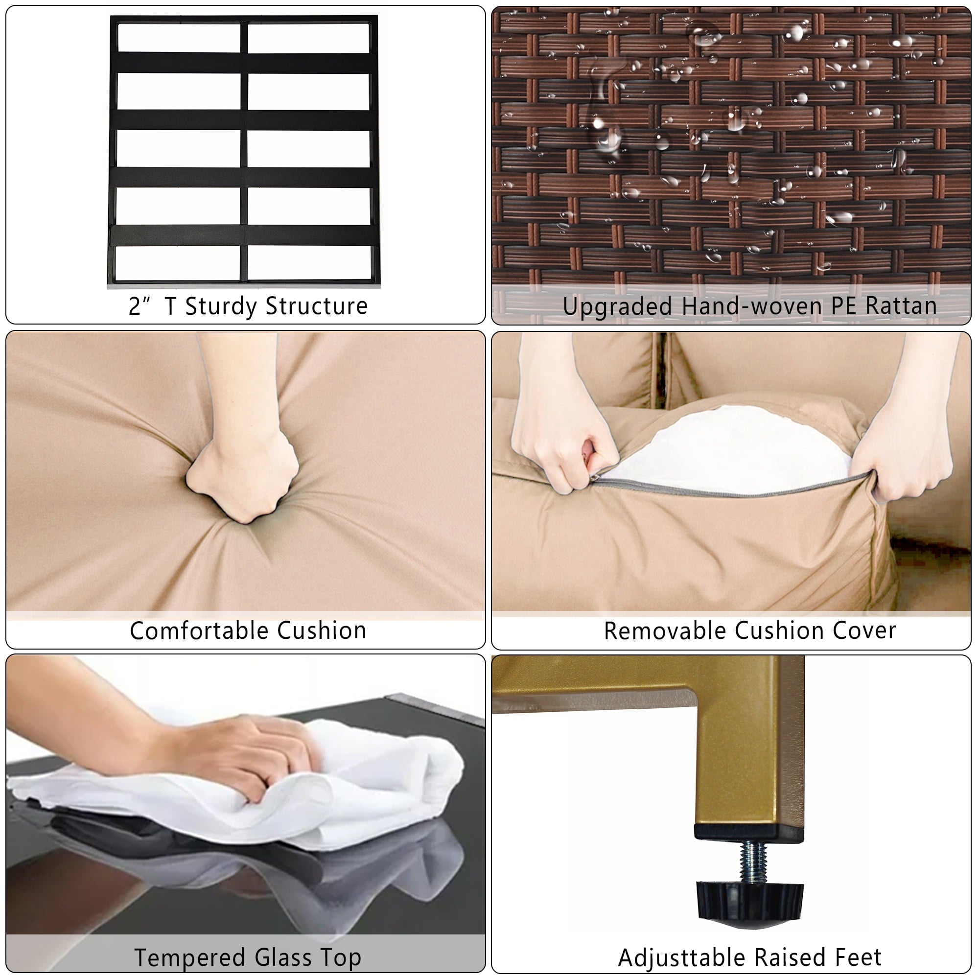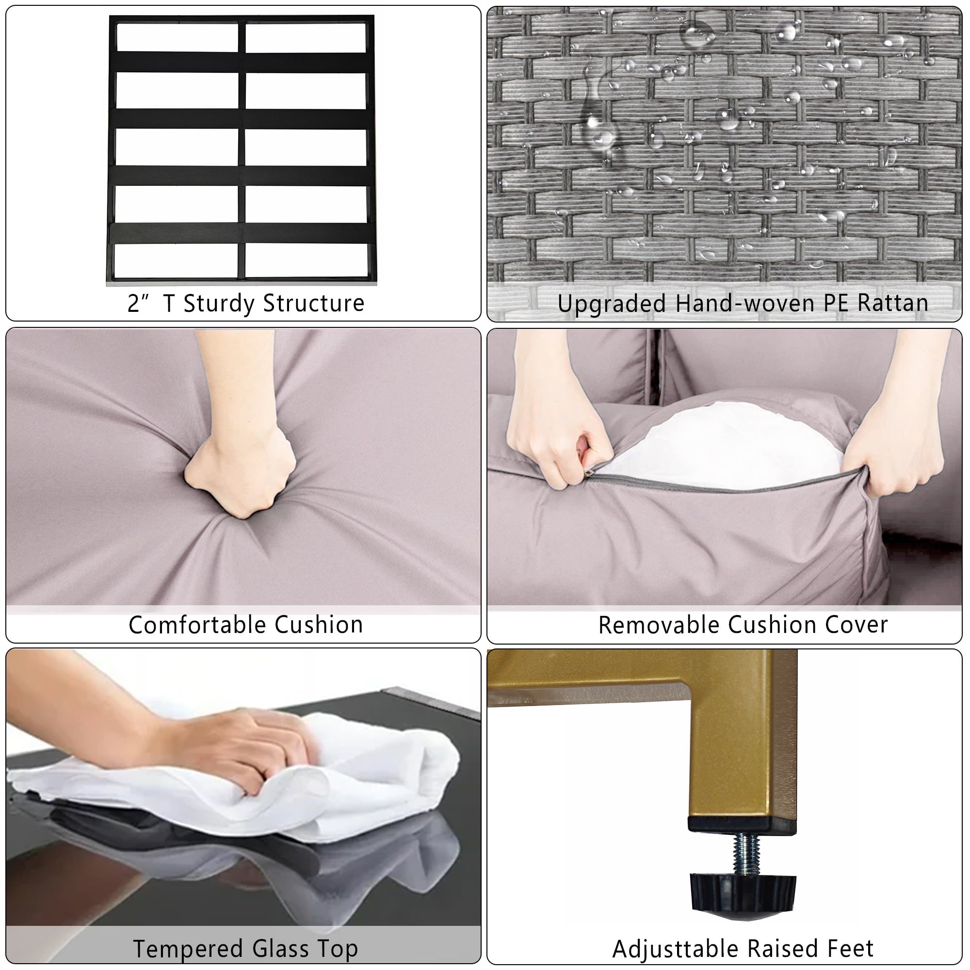 - 【WATER RESISTANT CUSHIONS】: The outdoor-rated cushion covers are PU-coated polyester fabric that is UV-ray, stain, and moisture-resistant and is more substantial than standard polyester. The 4” cushions of this 7 pieces outdoor conversation set, providing excellent support and reduces fatigue, allowing you to relax and immerse yourself in comfort for extended periods of time. In addition, the removable cushions with smooth zipper make cleaning a breeze.