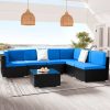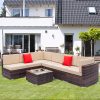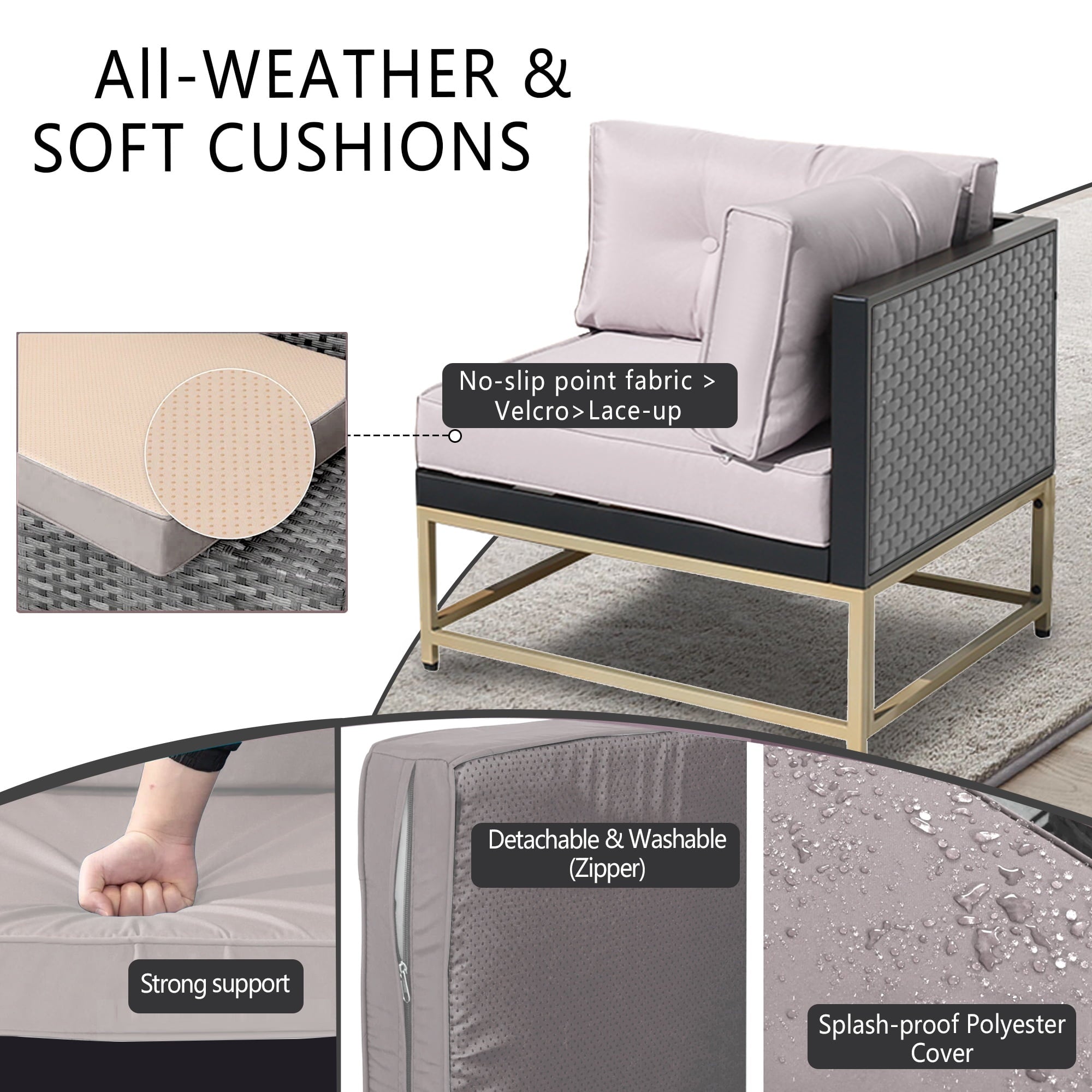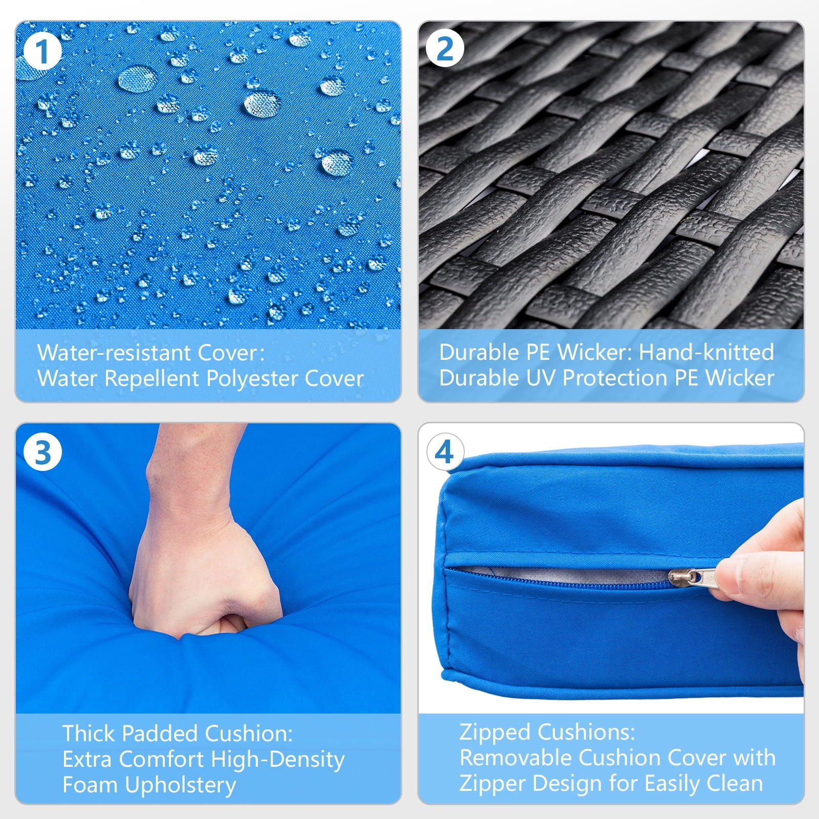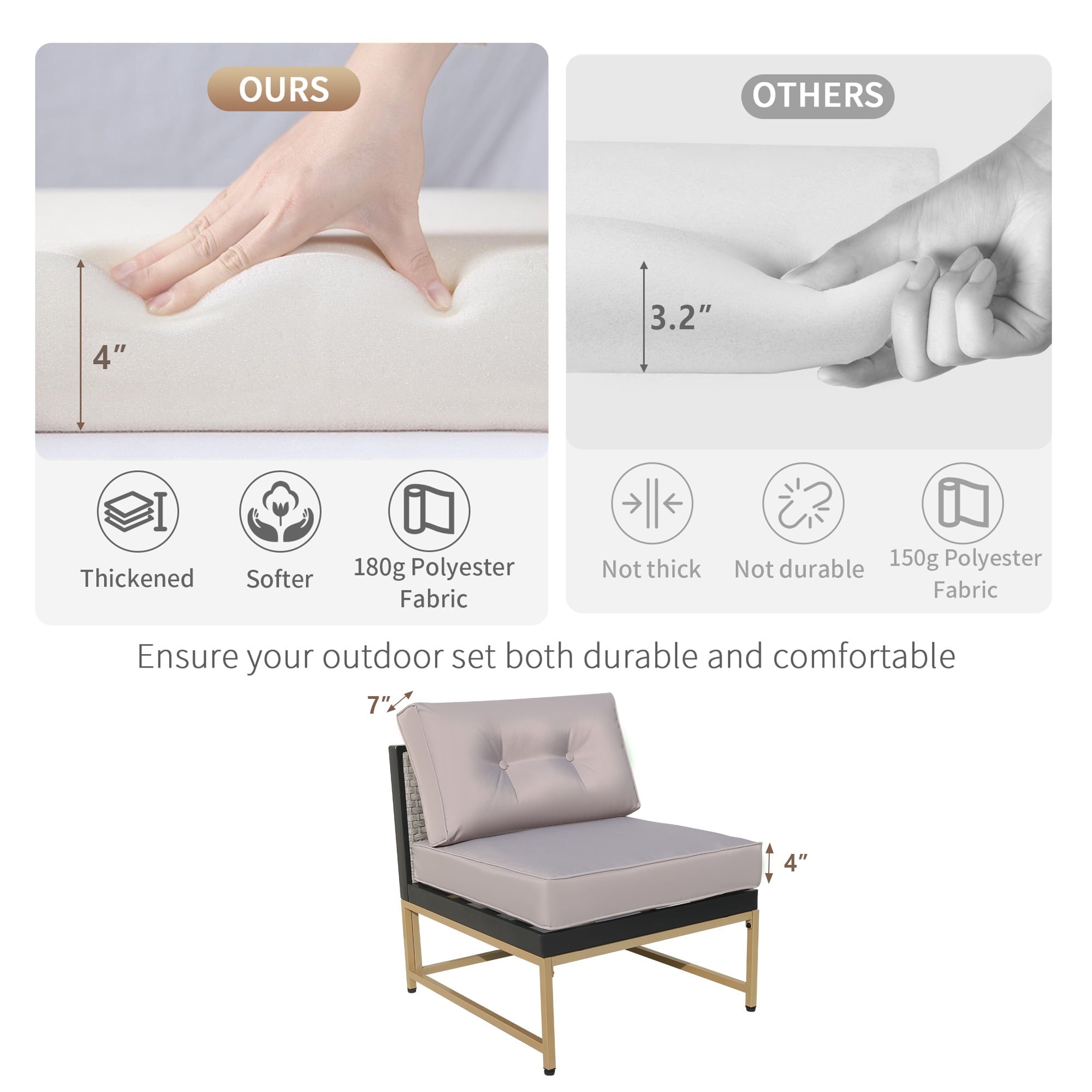- 【WATER RESISTANT CUSHIONS】: The outdoor-rated cushion covers are PU-coated polyester fabric that is UV-ray, stain, and moisture-resistant and is more substantial than standard polyester. The 4” cushions of this 7 pieces outdoor conversation set, providing excellent support and reduces fatigue, allowing you to relax and immerse yourself in comfort for extended periods of time. In addition, the removable cushions with smooth zipper make cleaning a breeze.