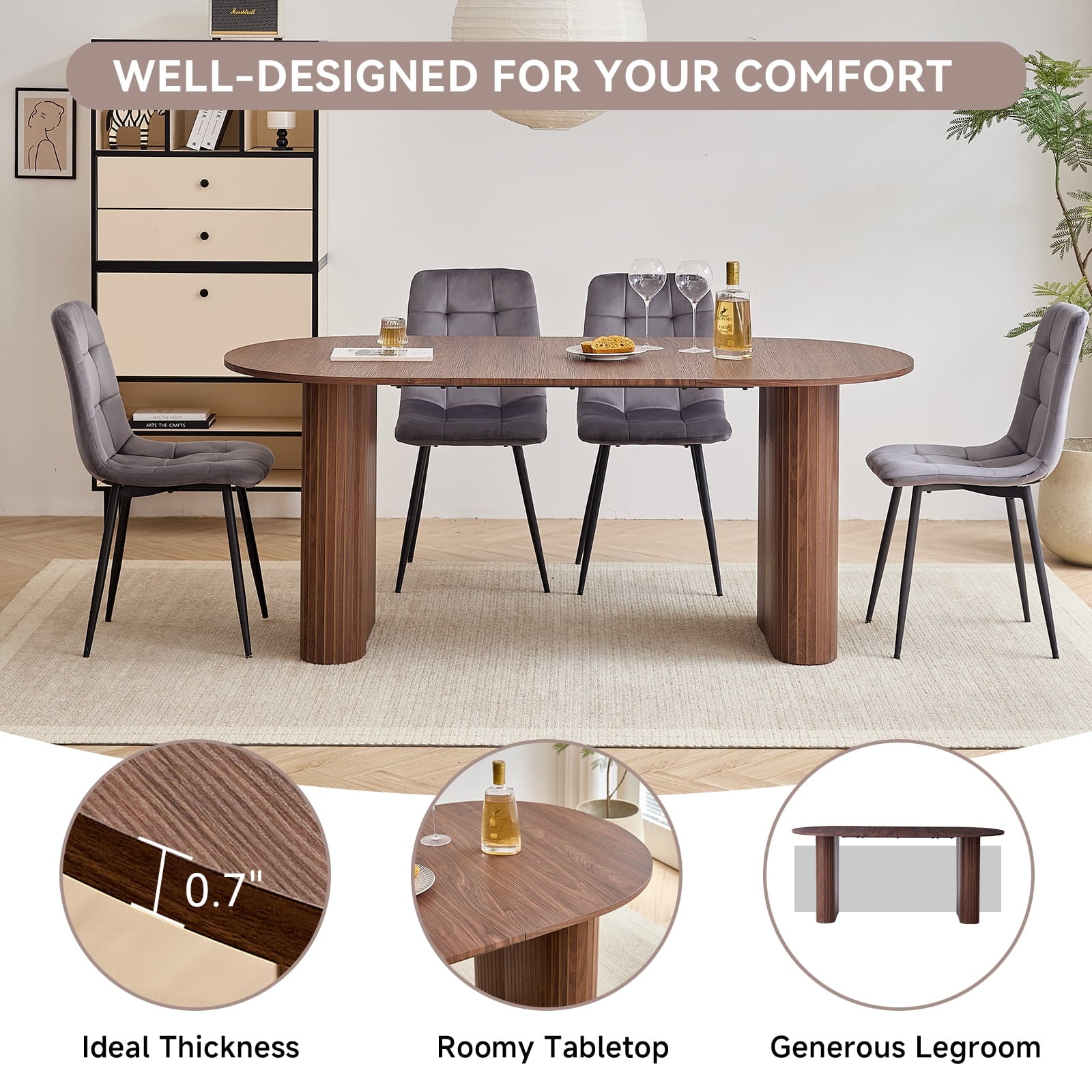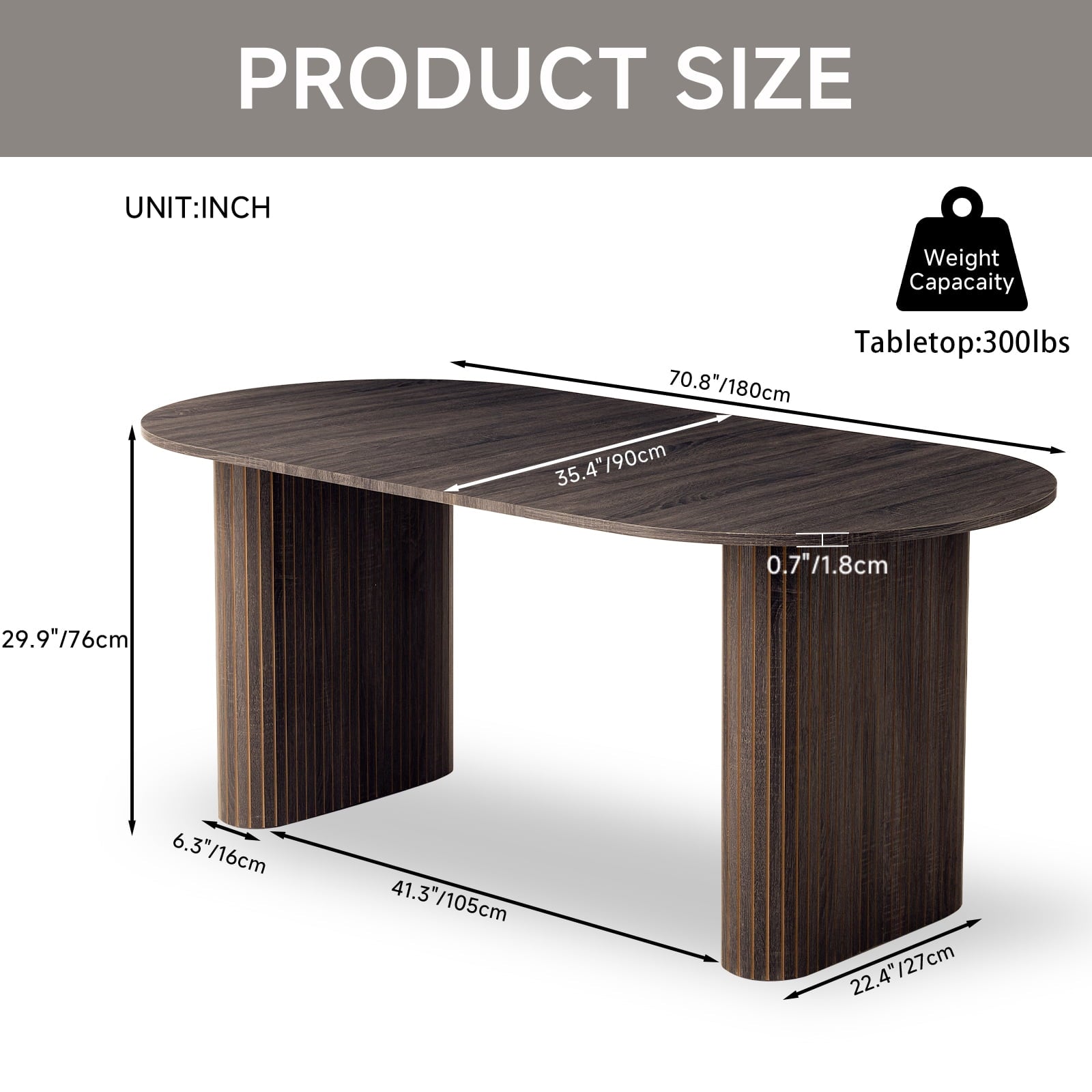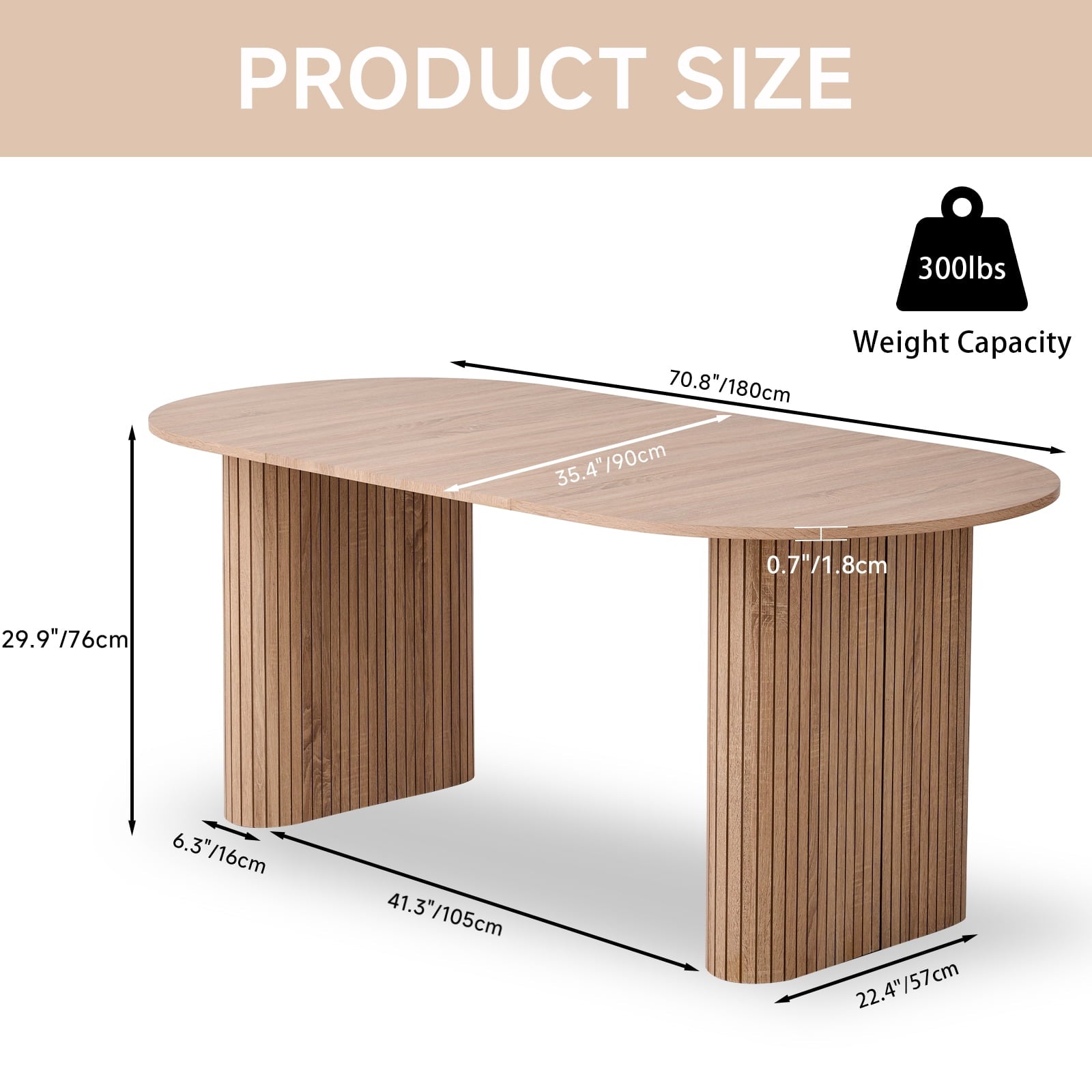 and stability of the table. The soft rounded corners of the oval desktop add a sense of security and effectively prevent bumps and knocks when there are children or pets at home. We like to call it the Friendly dimension because it is 70.8 inches