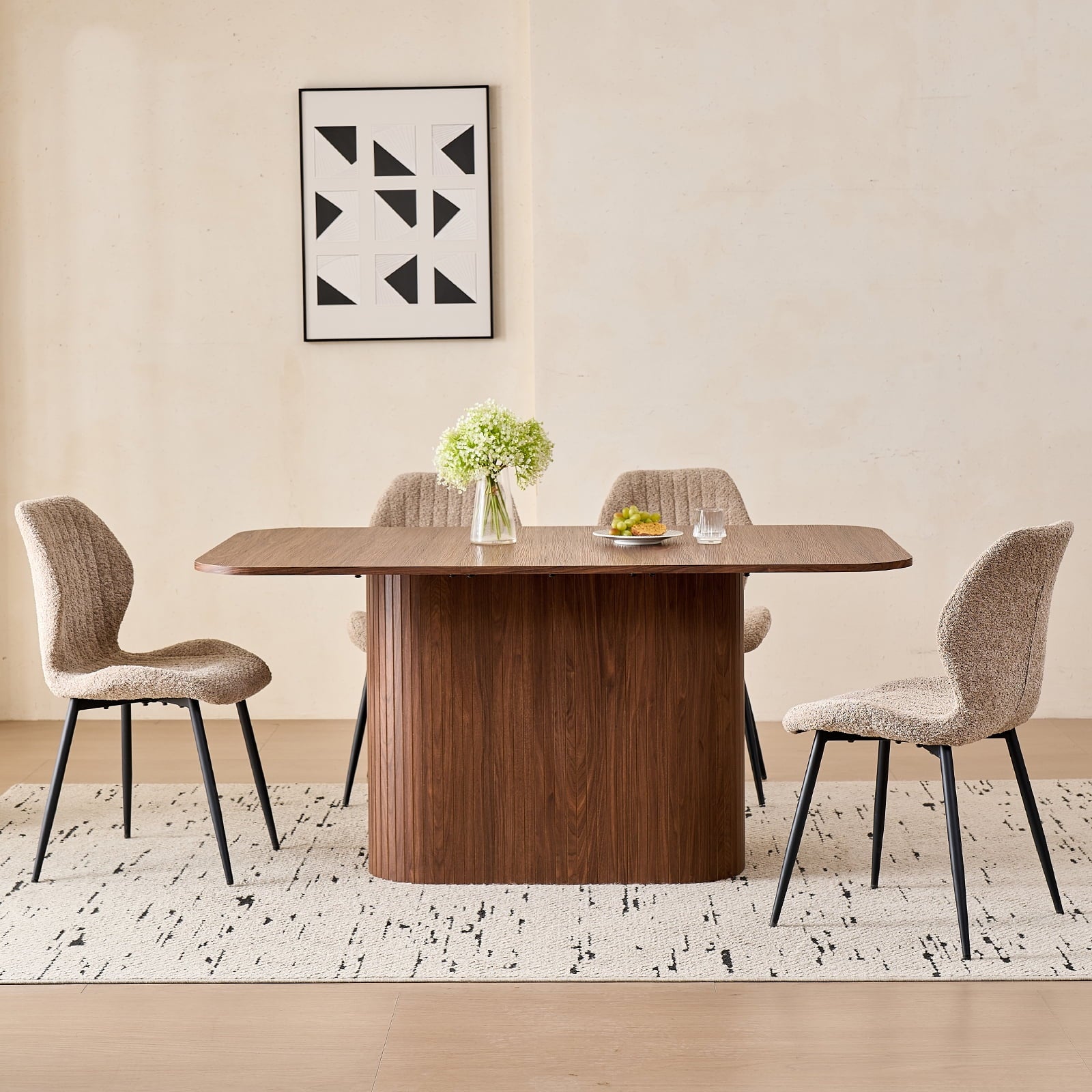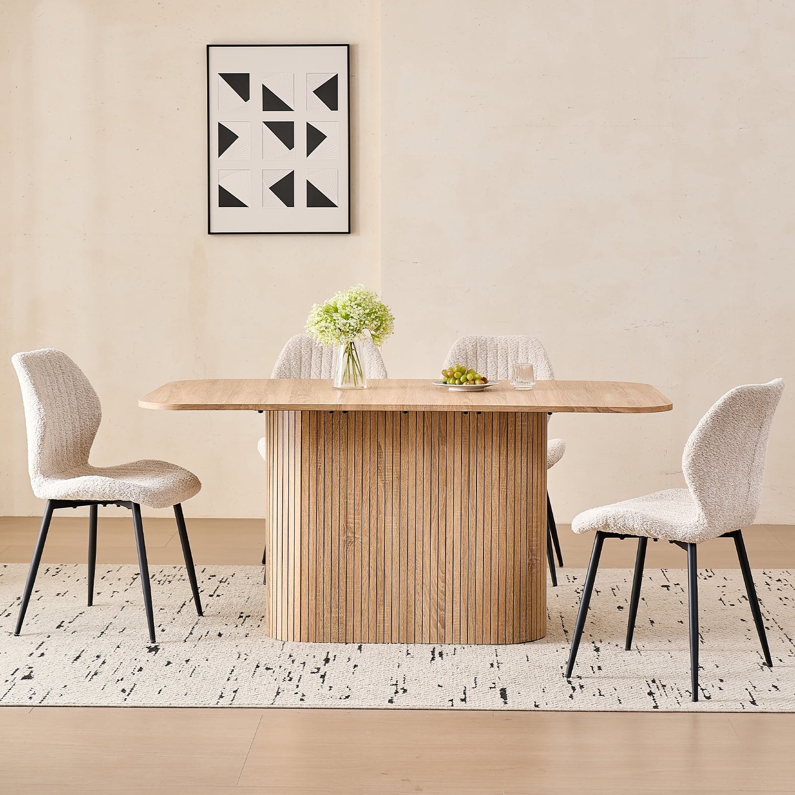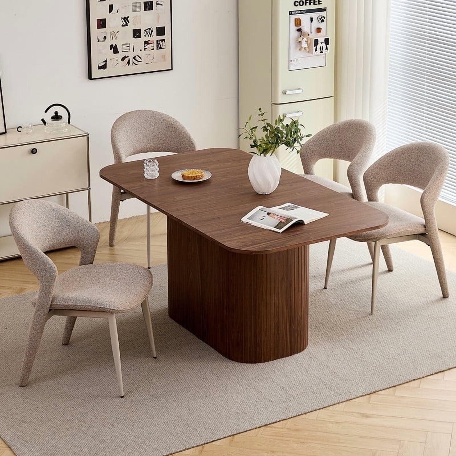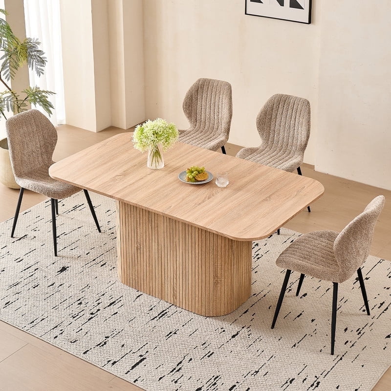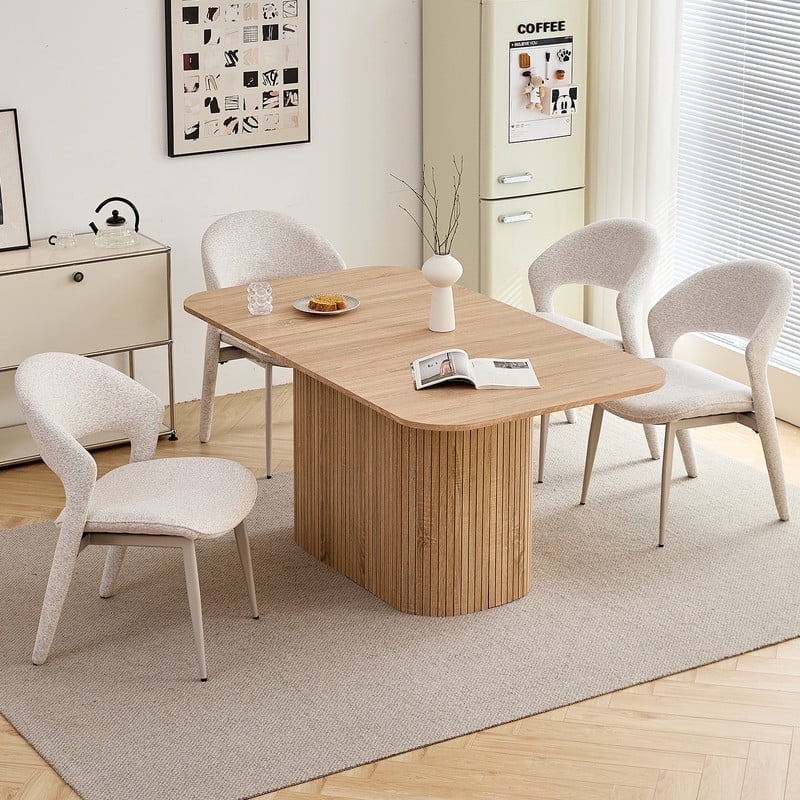 This 4-seat dining set blends functionality with style, ideal for diverse home layouts. The table measures 35.4″ D x 62.9″ L x 29.7″ H, and each chair (16.1″ D x 18.9″ W, 33.1″ overall height) is thoughtfully proportioned for comfort—no cramped meals here. Its compact design fits apartments to kitchens, complementing decor from modern to farmhouse.The table has an engineered wood top with realistic wood grain, supported by a sturdy metal frame. Chairs feature soft, textured boucle upholstery (adds elegance!) and stable metal legs—combining durability, coziness, and contemporary flair for daily use.Softly rounded table corners boost safety (fewer bumps!) and a sleek look, plus make moving/positioning easier—enhancing your dining space’s flow.