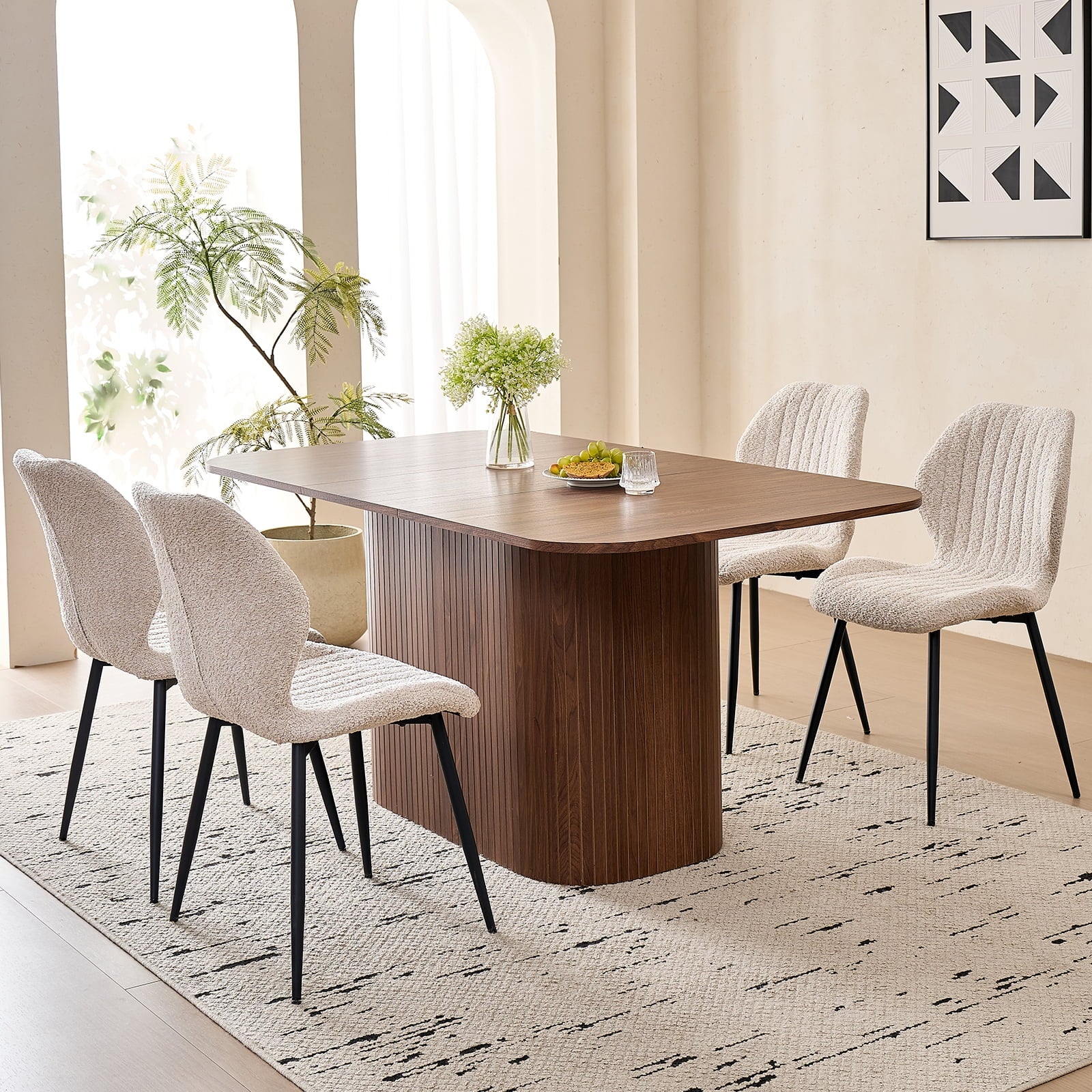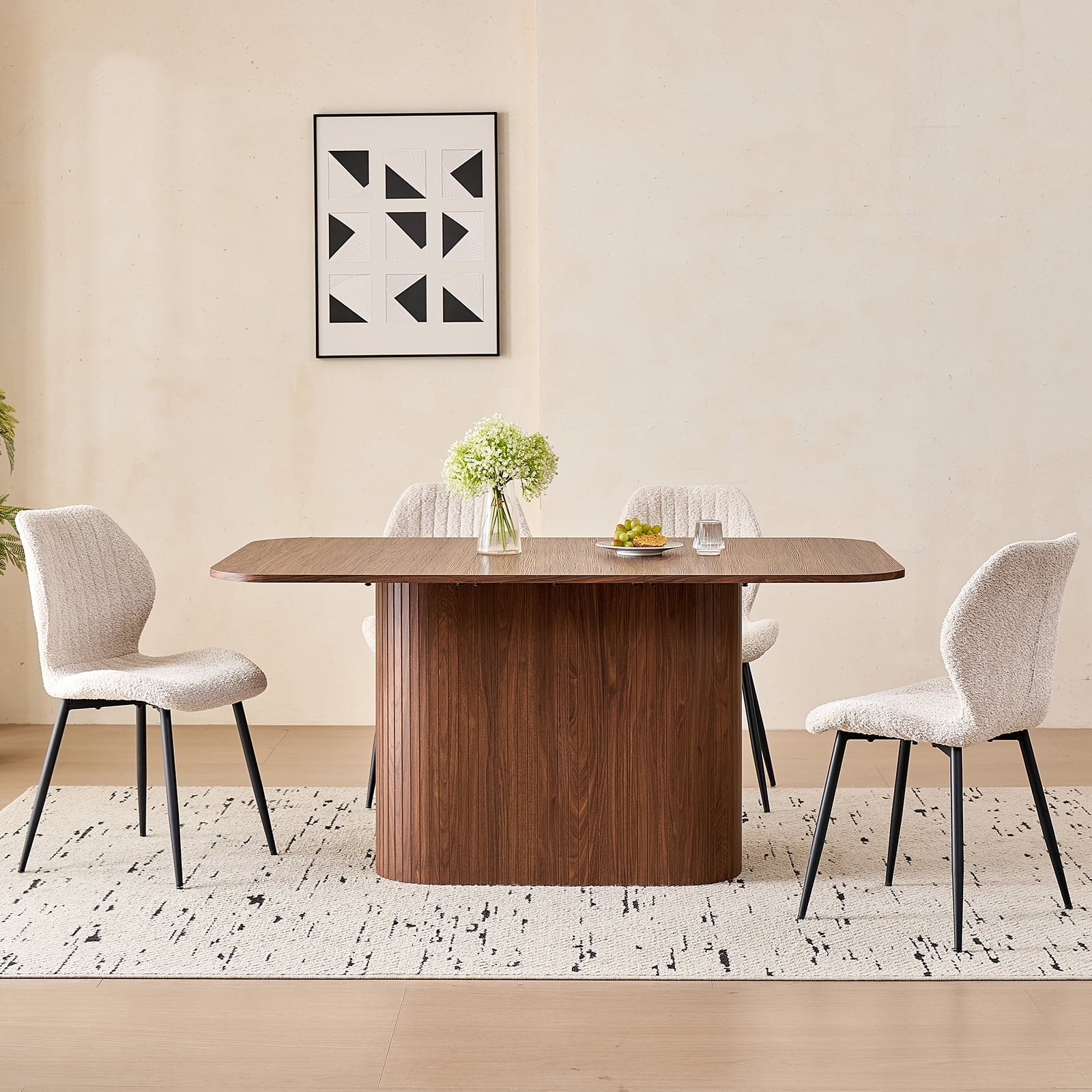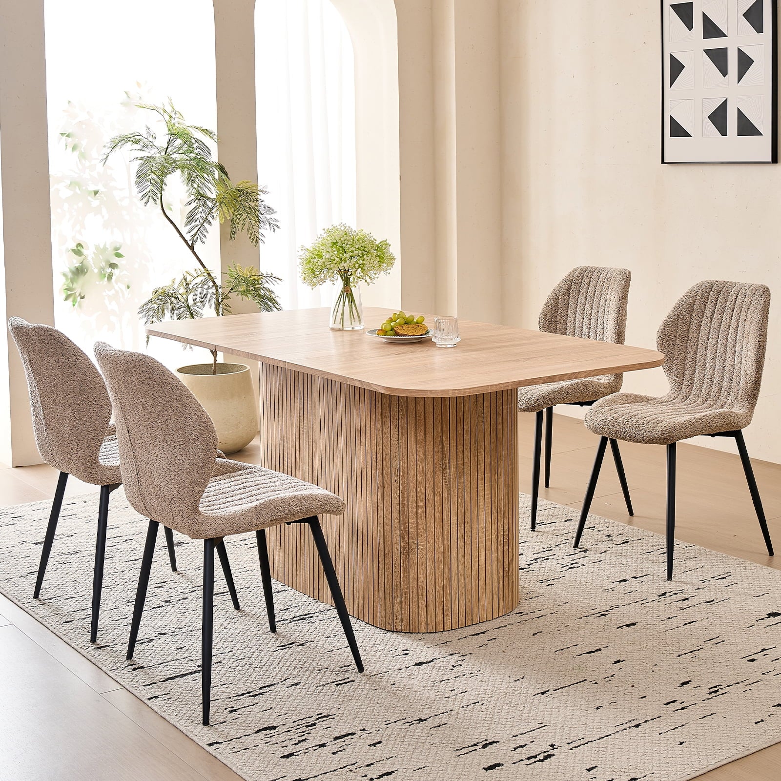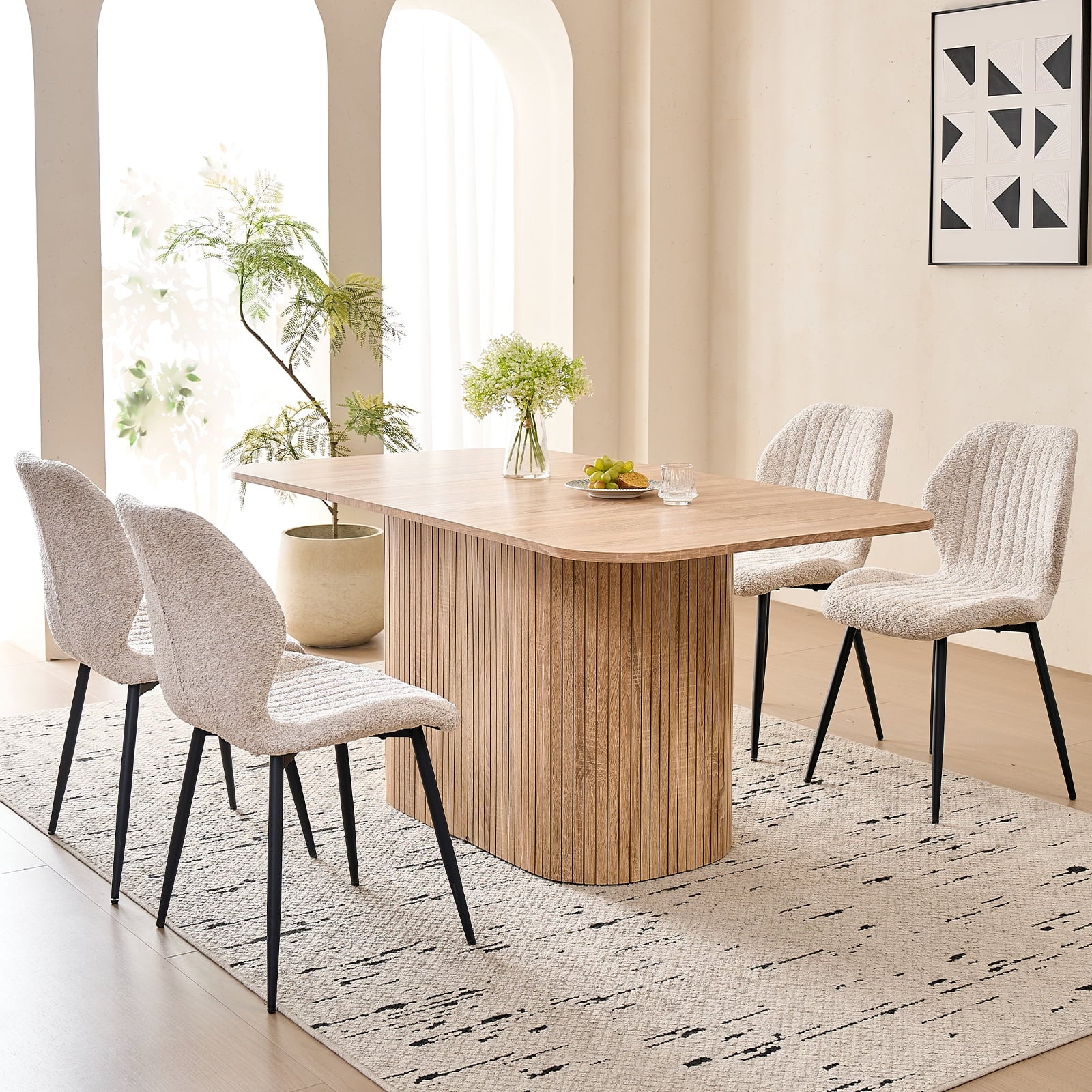This 4-seat dining set blends functionality with style, ideal for diverse home layouts. The table measures 35.4″ D x 62.9″ L x 29.7″ H, and each chair (16.1″ D x 18.9″ W, 33.1″ overall height) is thoughtfully proportioned for comfort—no cramped meals here. Its compact design fits apartments to kitchens, complementing decor from modern to farmhouse.The table has an engineered wood top with realistic wood grain, supported by a sturdy metal frame. Chairs feature soft, textured boucle upholstery (adds elegance!) and stable metal legs—combining durability, coziness, and contemporary flair for daily use.Softly rounded table corners boost safety (fewer bumps!) and a sleek look, plus make moving/positioning easier—enhancing your dining space’s flow.