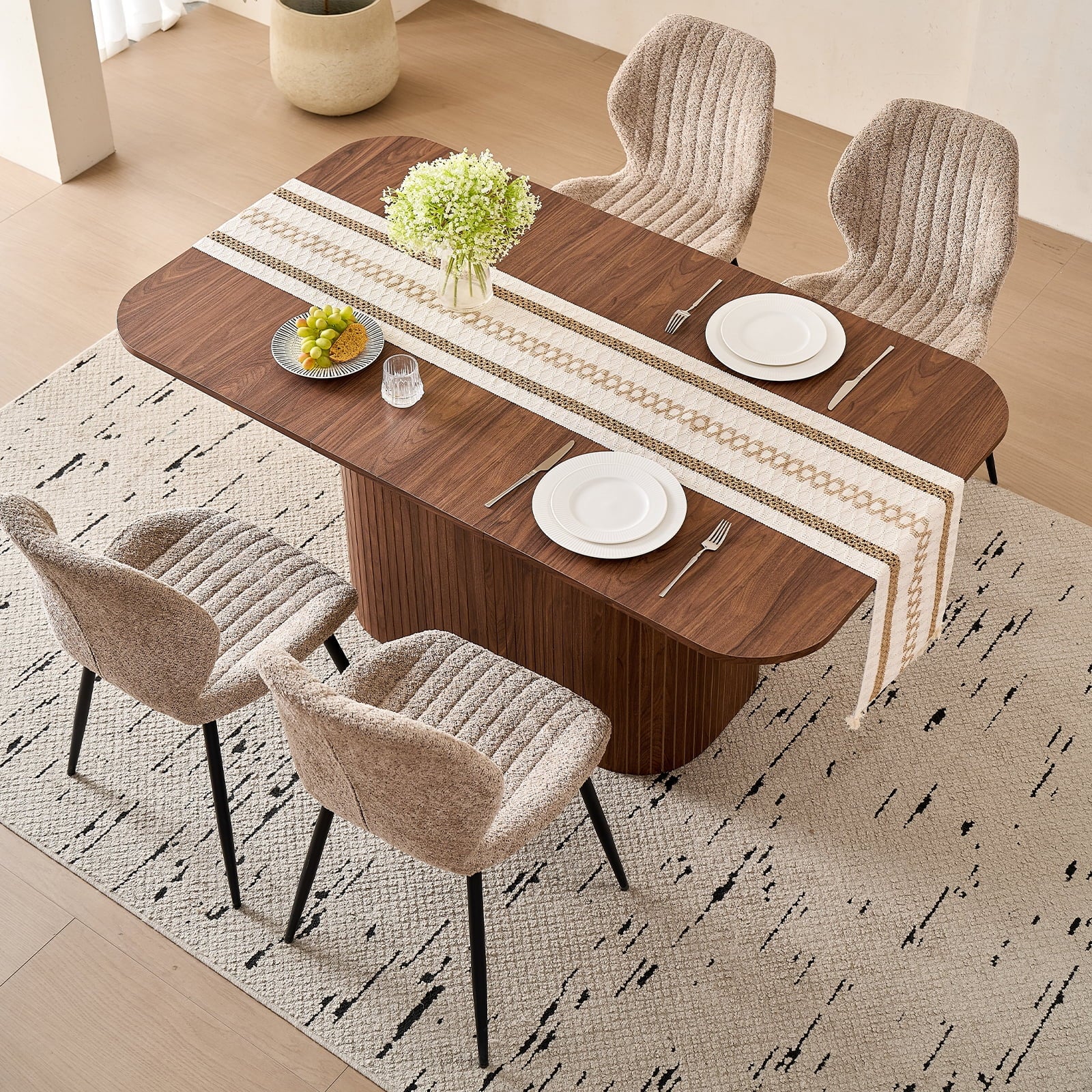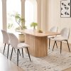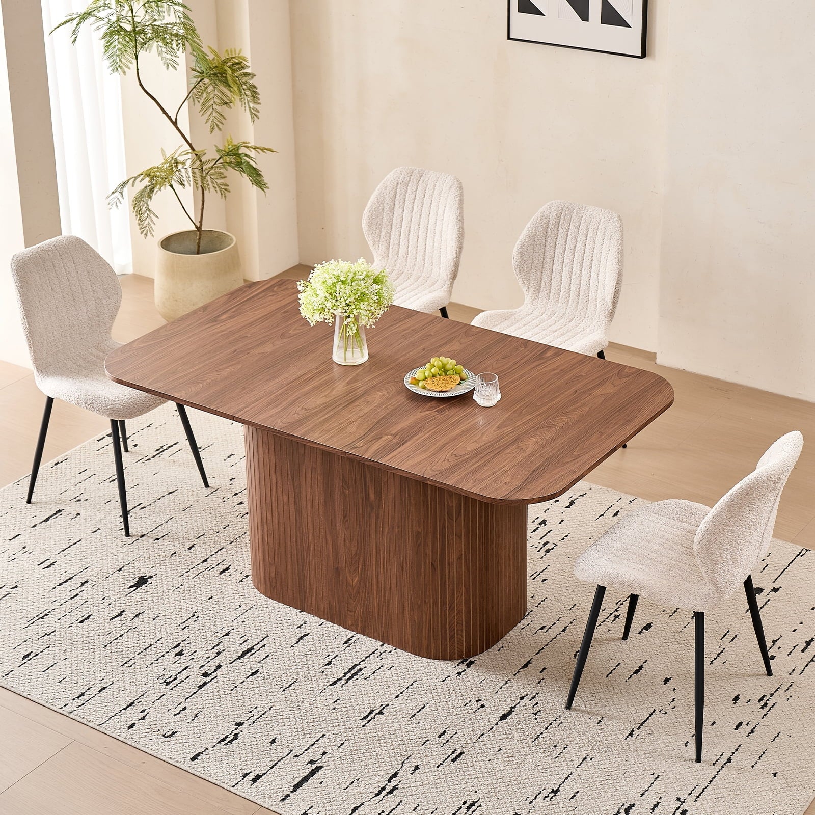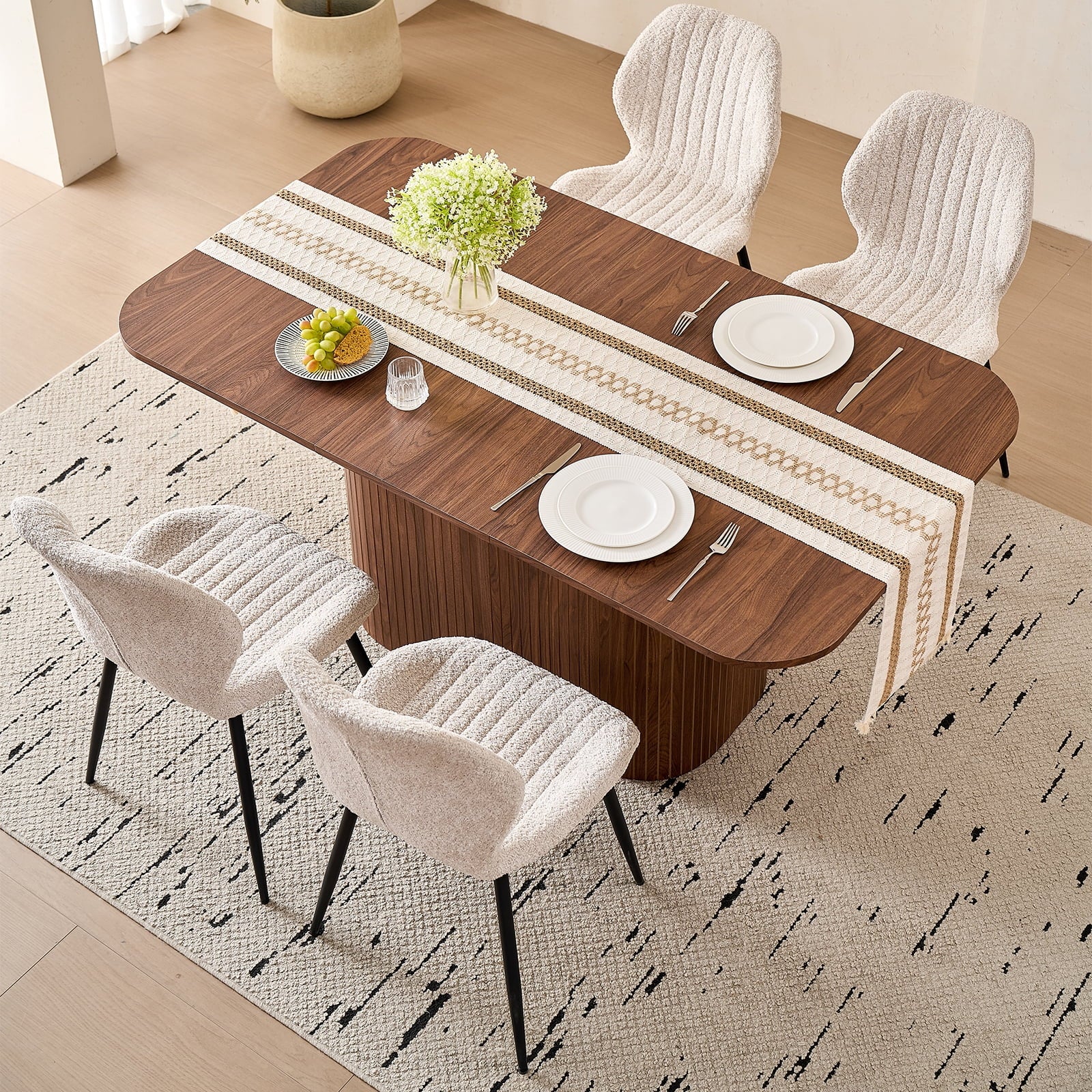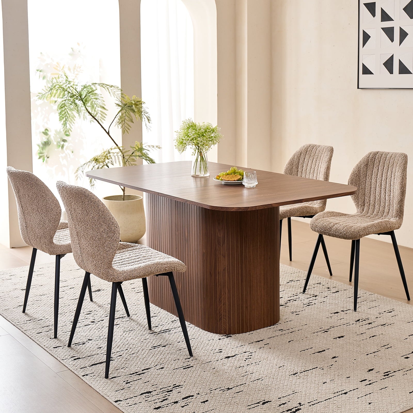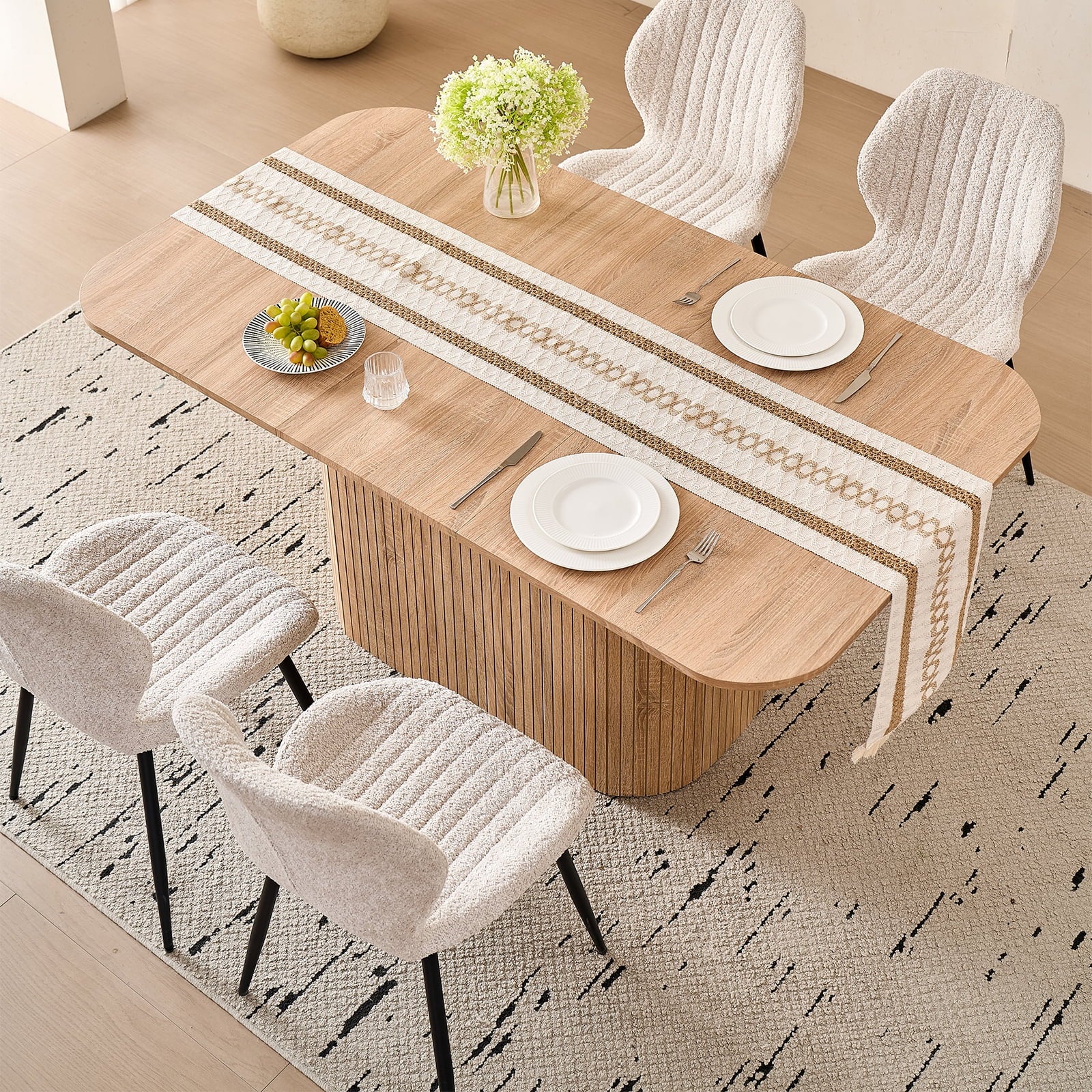 This 4-seat dining set blends functionality with style, ideal for diverse home layouts. The table measures 35.4″ D x 62.9″ L x 29.7″ H, and each chair (16.1″ D x 18.9″ W, 33.1″ overall height) is thoughtfully proportioned for comfort—no cramped meals here. Its compact design fits apartments to kitchens, complementing decor from modern to farmhouse.The table has an engineered wood top with realistic wood grain, supported by a sturdy metal frame. Chairs feature soft, textured boucle upholstery (adds elegance!) and stable metal legs—combining durability, coziness, and contemporary flair for daily use.Softly rounded table corners boost safety (fewer bumps!) and a sleek look, plus make moving/positioning easier—enhancing your dining space’s flow.
